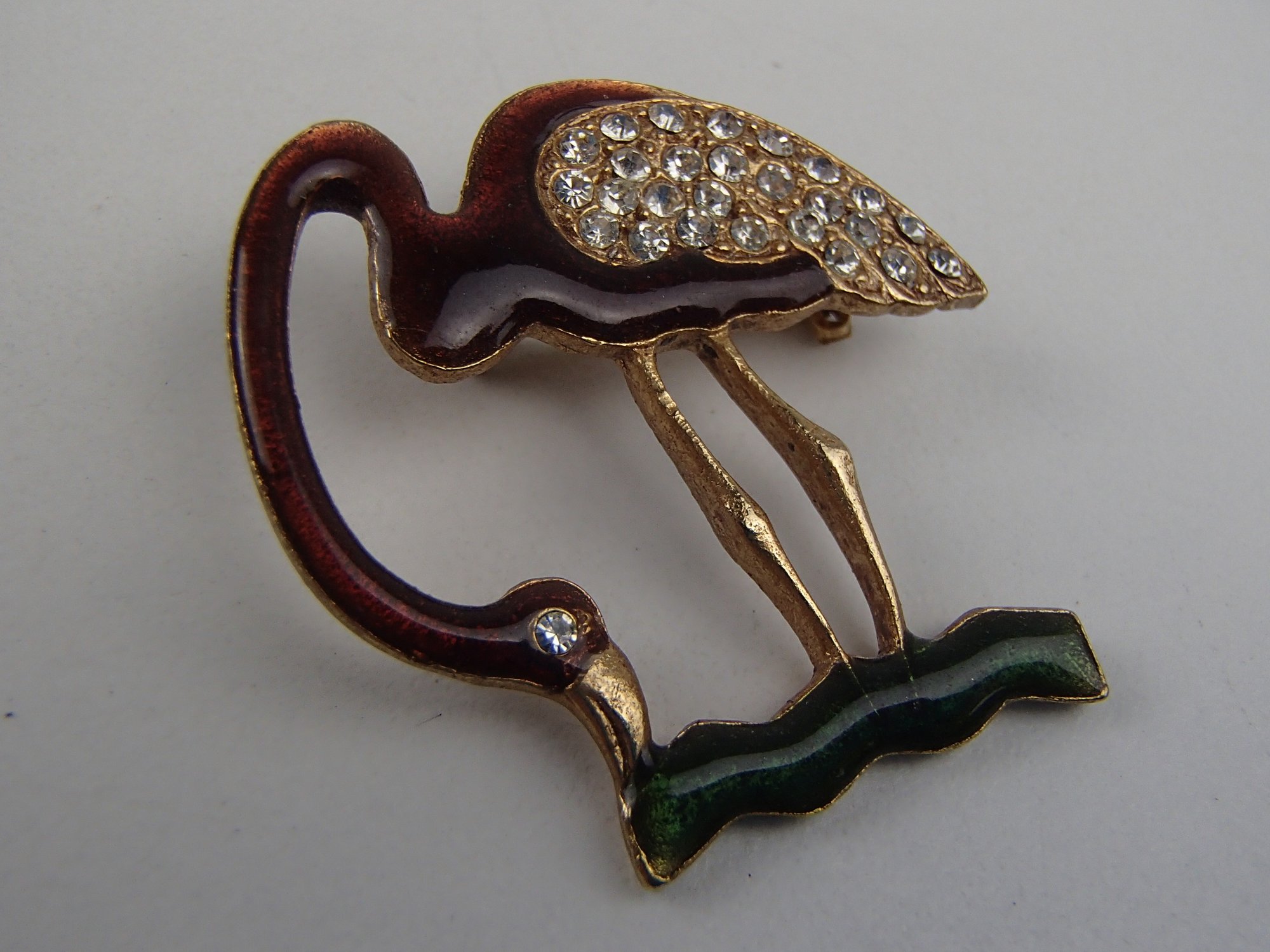 Vintage Flamingo Enamel And Rhinestone Pin / Brooch