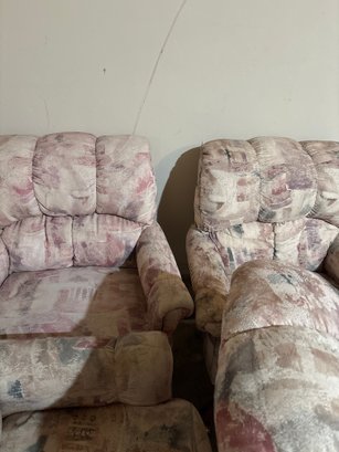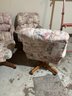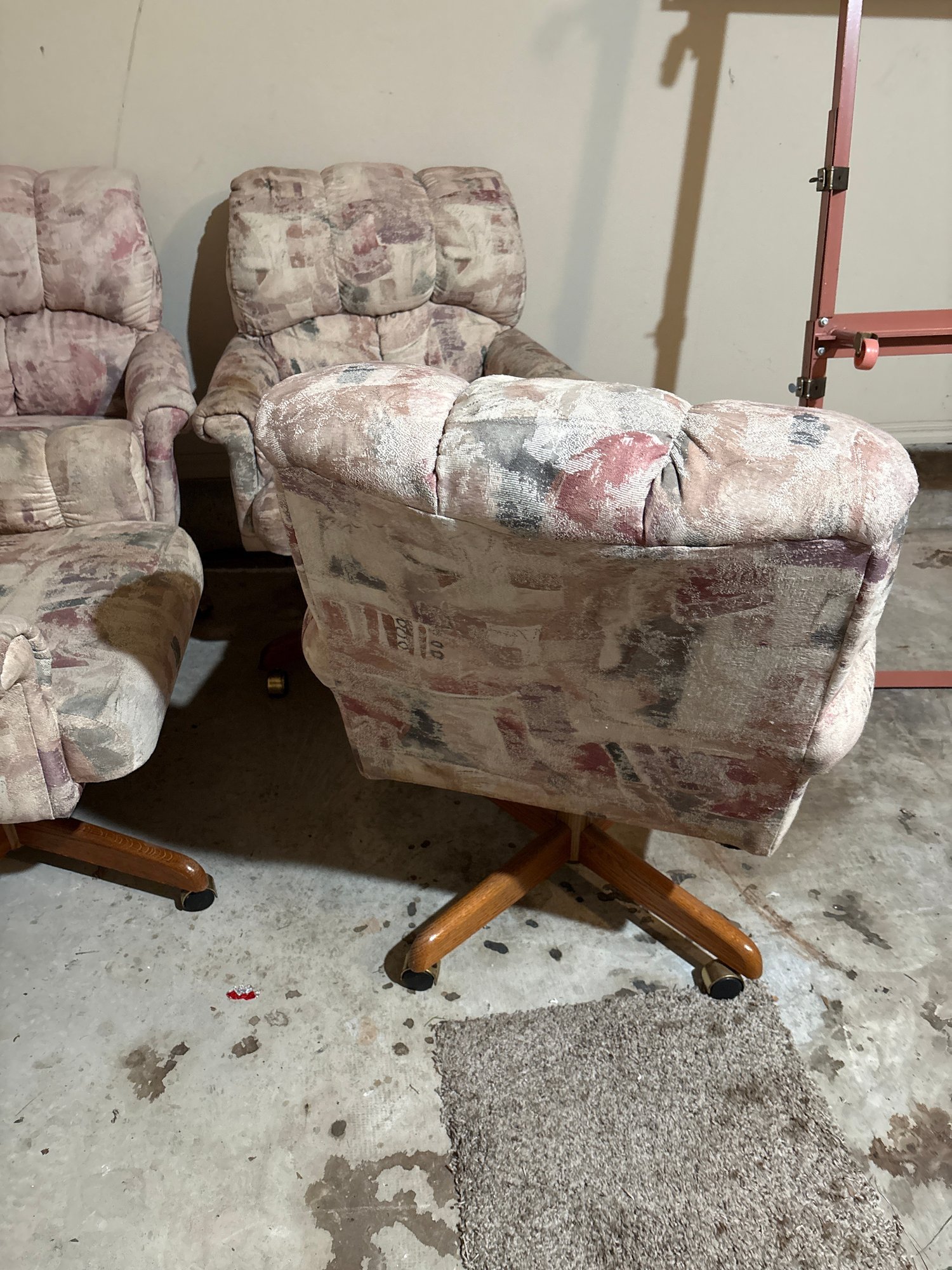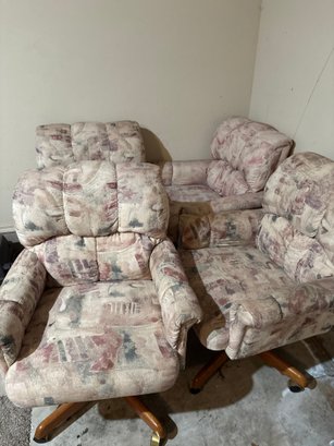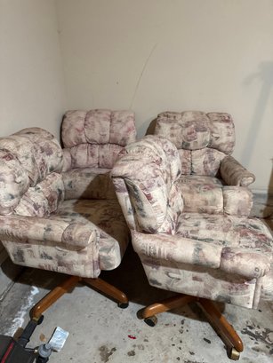 Upholstery and wood caster chairs that rock slightly. Very comfortable could work for covered patio or sunroom