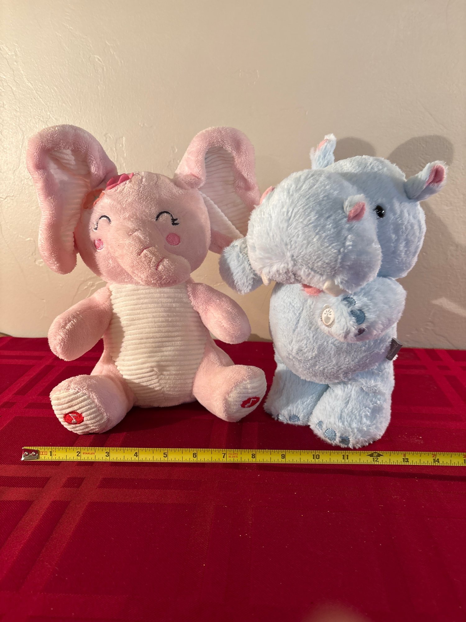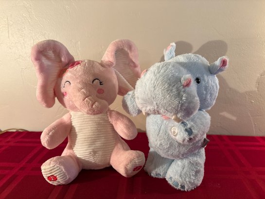 Elephant plays peek a boo, hippo plays I like big hugs and I cannot lie. Good used condition