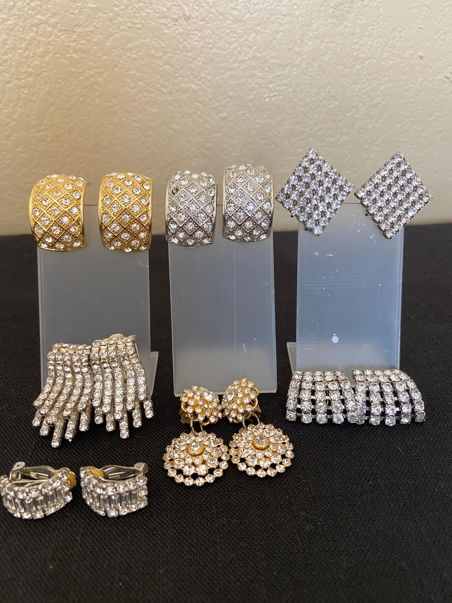 A mix of stylish, sparkly clip on earrings! One pair is missing several of its sparkly rhinestones.