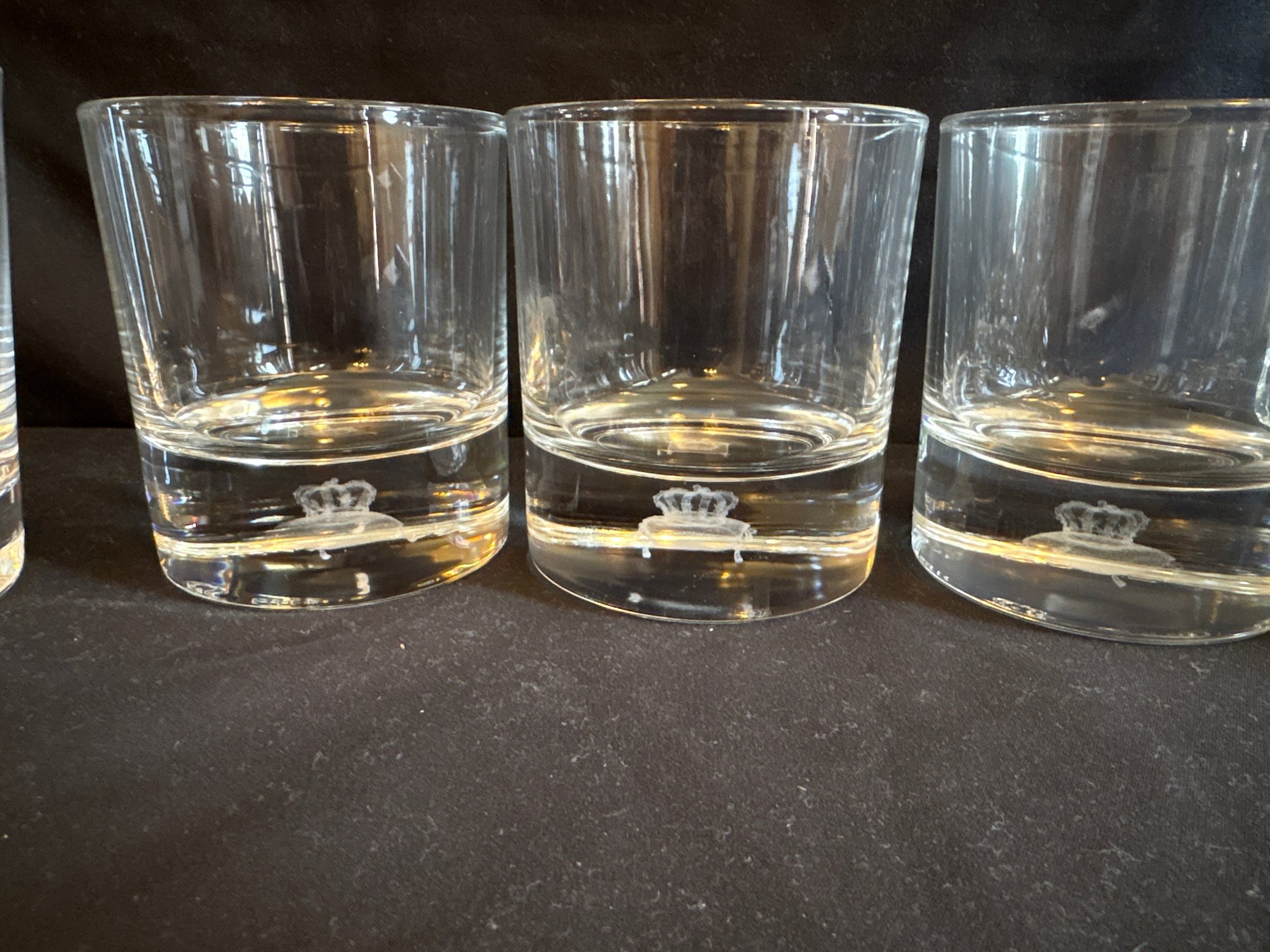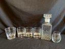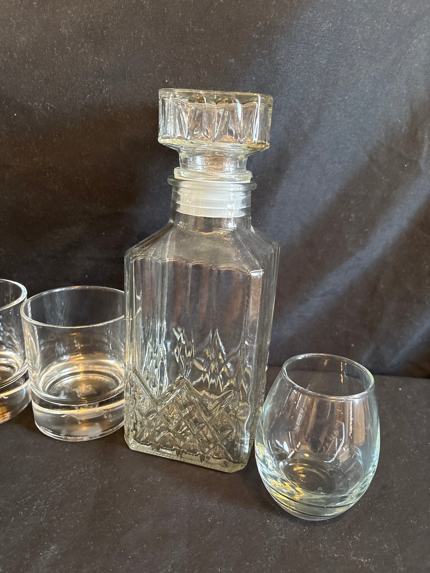 Glass decanter three crown royal old fashioned glasses and two others