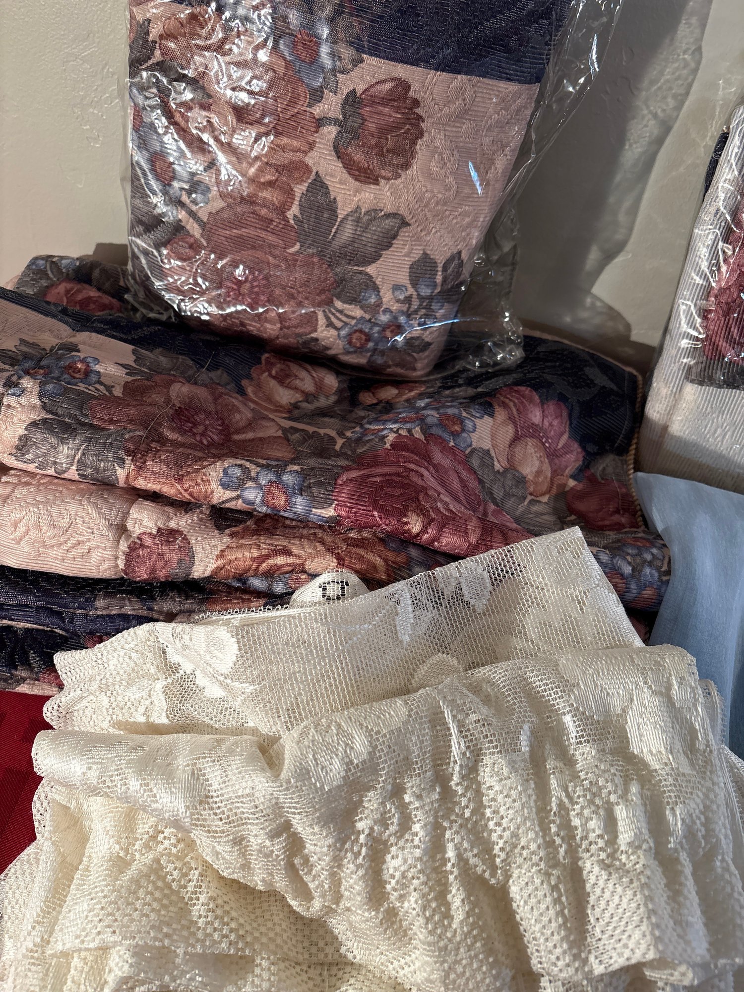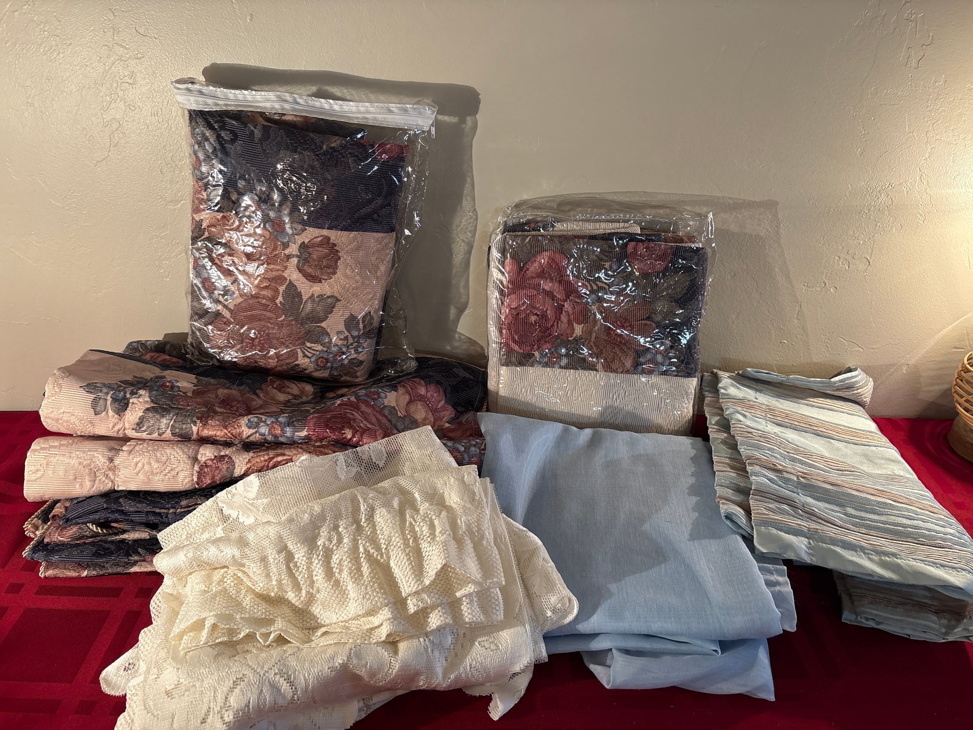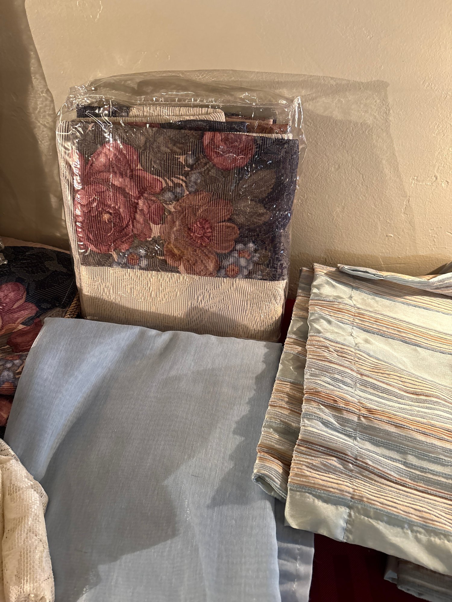 Many match floral furniture elsewhere in this sale. Valences and sheers and lace no measures most fit standard single window