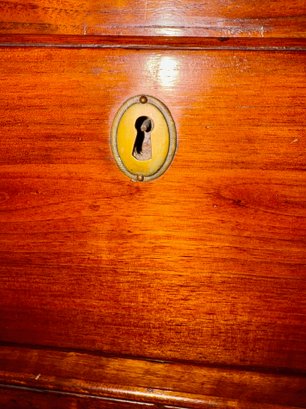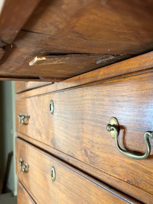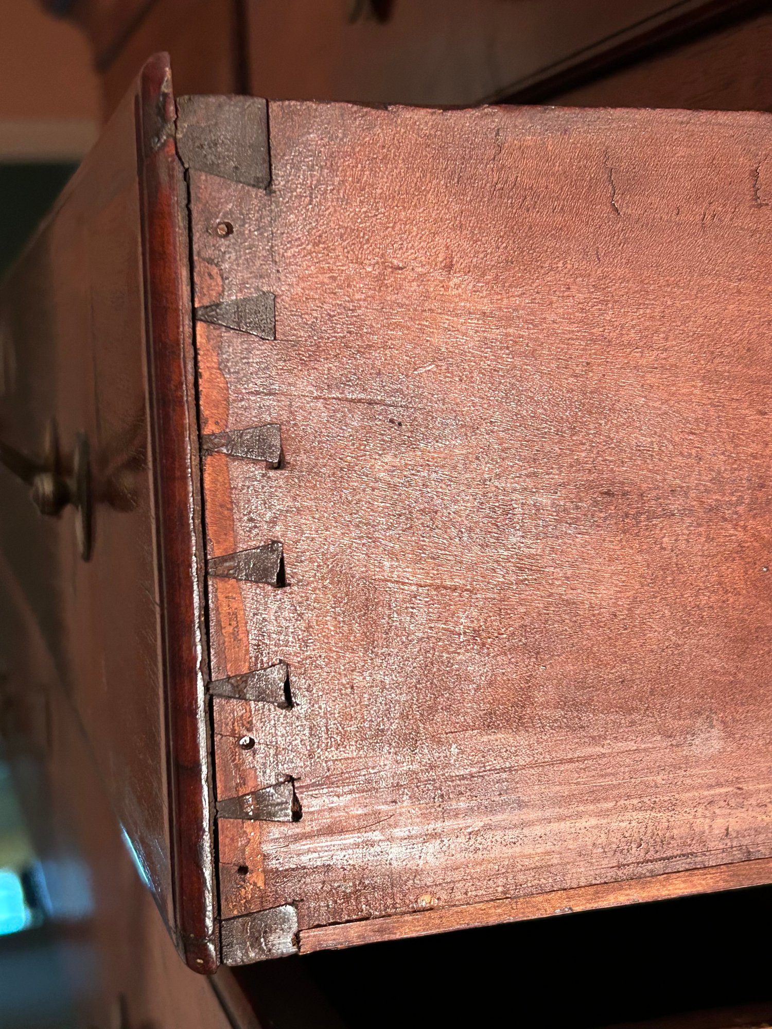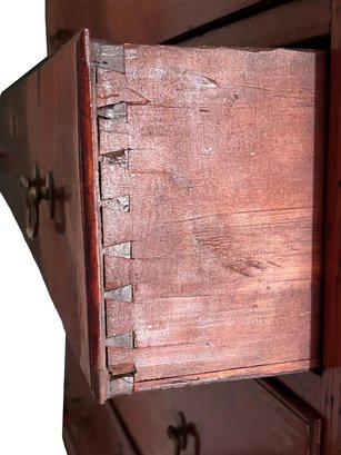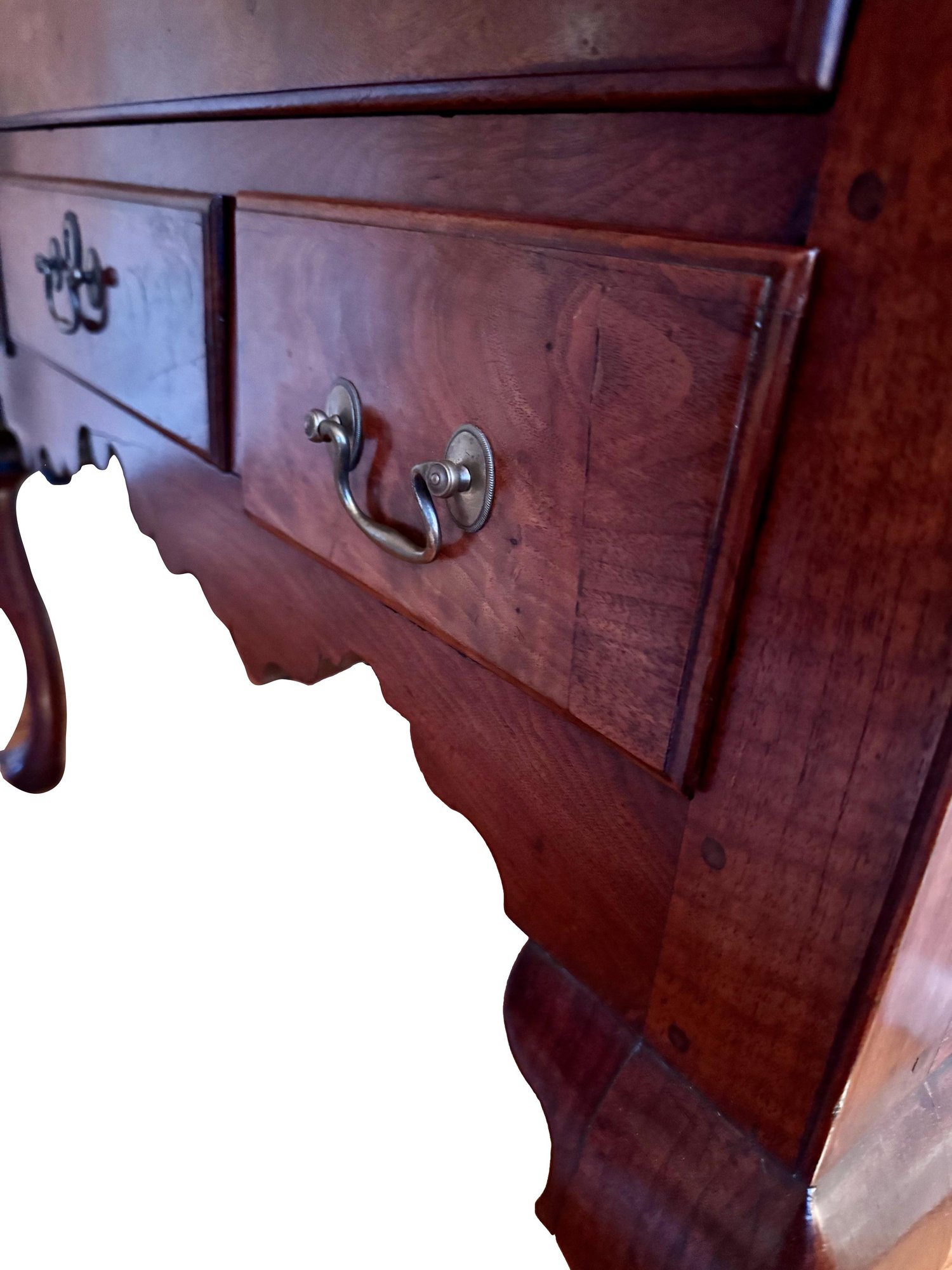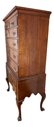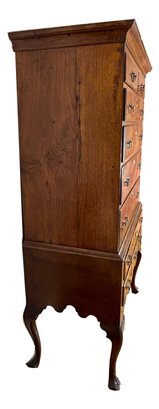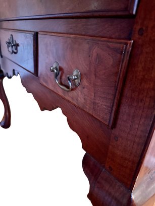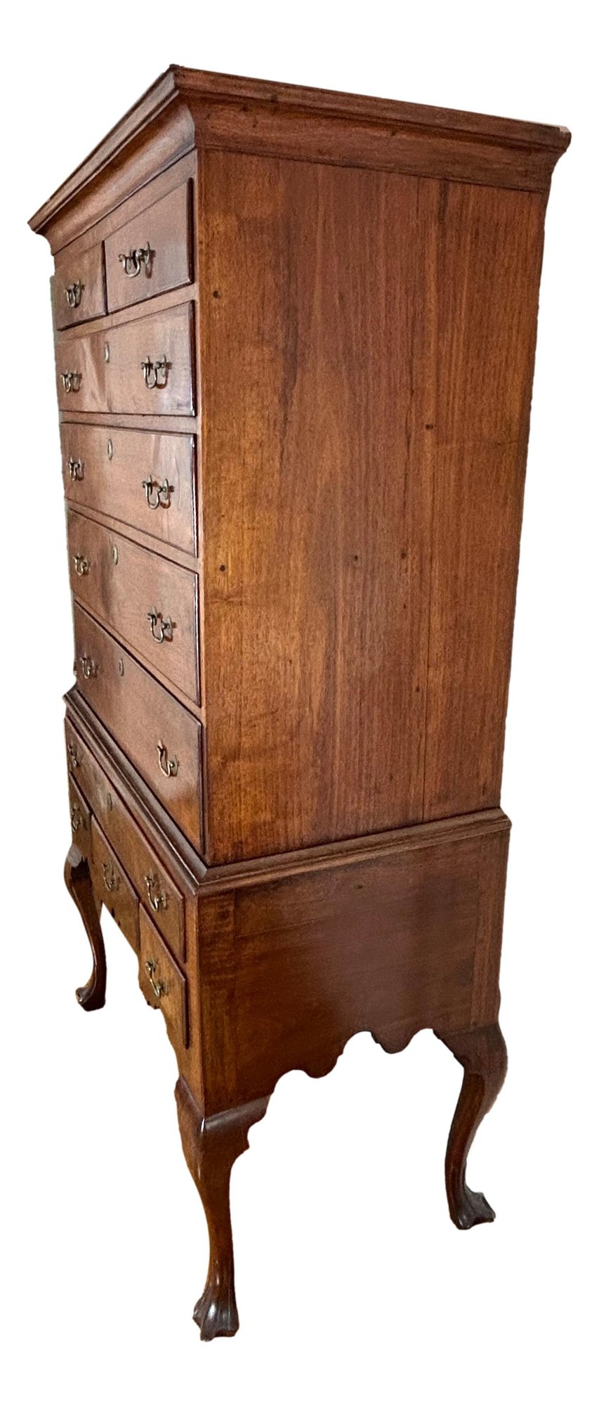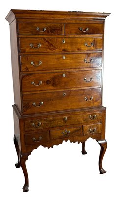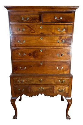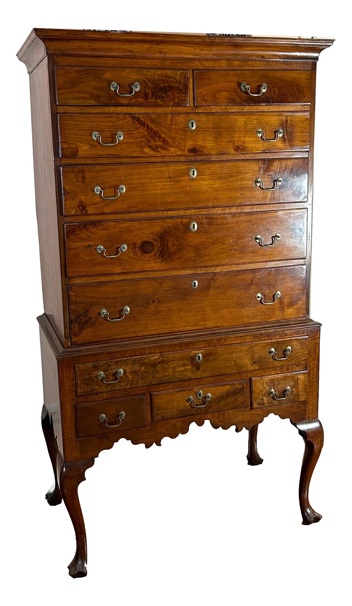 Circa 1760s, American, Connecticut Valley highboy. Purchased at Sotheby's "Important American Furniture" Auction on January 27, 1983. Peg construction with two over four slightly graduated drawers resting upon five drawer base with curly scalloped apron, short cabriole legs on trifid feet. Top two drawers have spring loaded locking mechanism. One drawer is shown open slightly to portray mechanism.