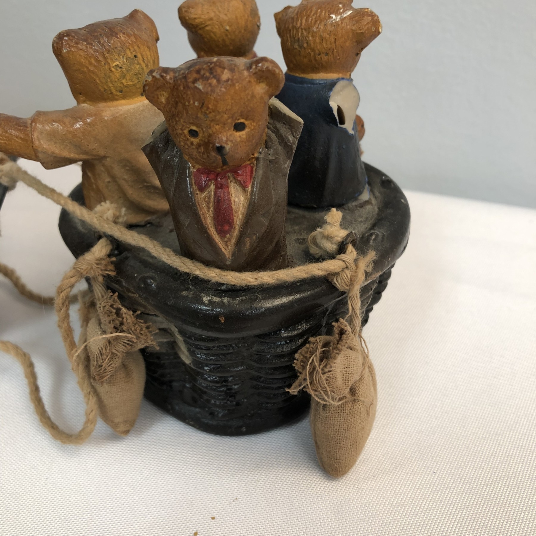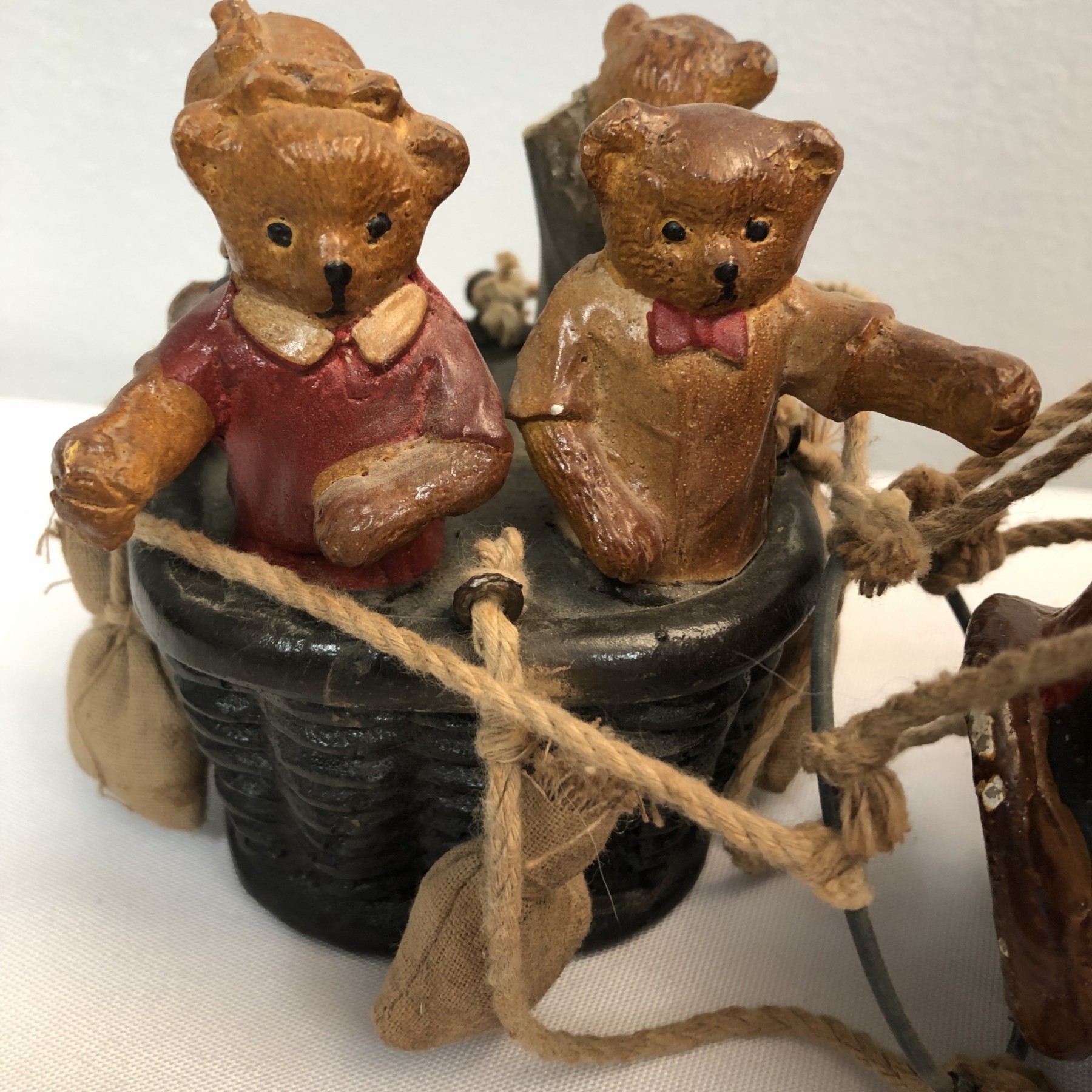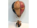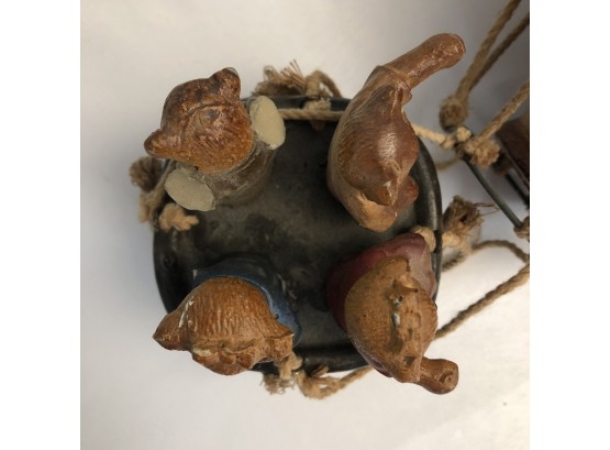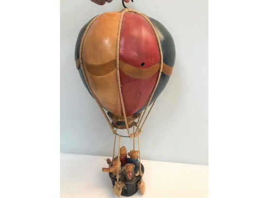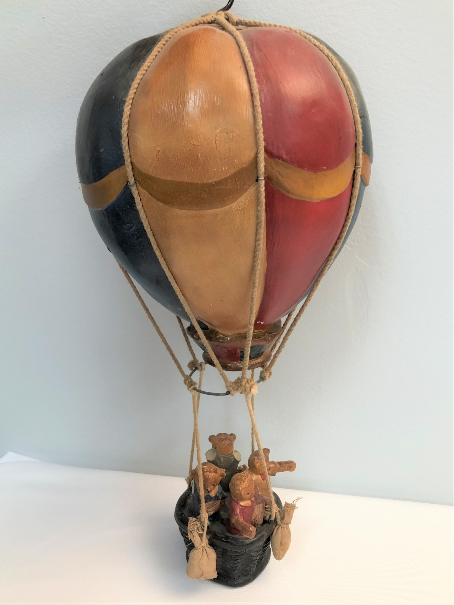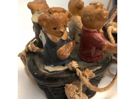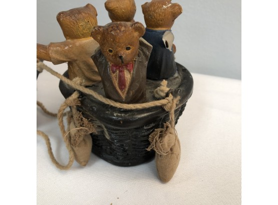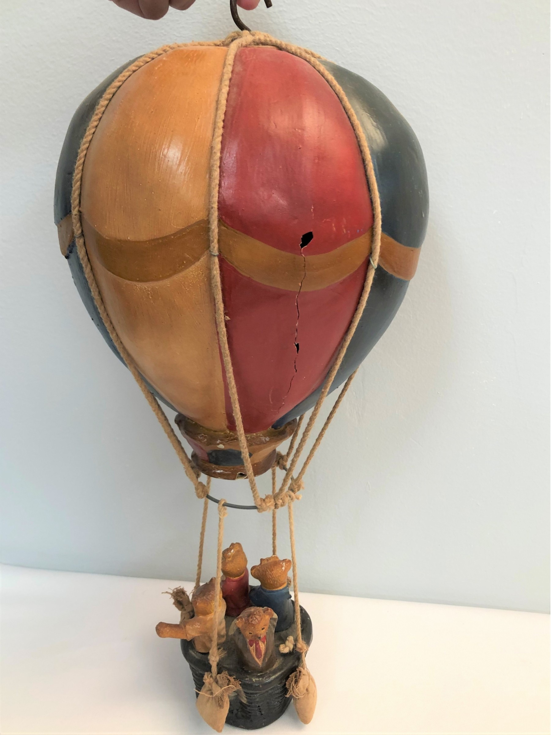 Whimsical Vintage 17"H Hanging Hot Air Balloon W Basket And 4 Bears - - - very realistic with basket, sandbags, ropes & large hook on top for hanging. The balloon looks like painted wood or some kind of resin/composite? And the basket looks like resin/ceramic. There are 4 Bear passengers. Overall fair to good condition - note crack in 1 side of balloon, 1 bear missing both arms and 1 bear missing one arm & needs to be reattached to basket.