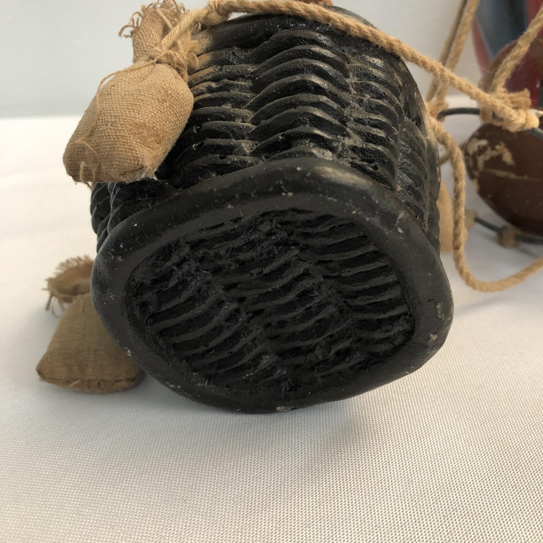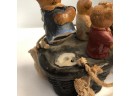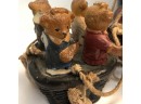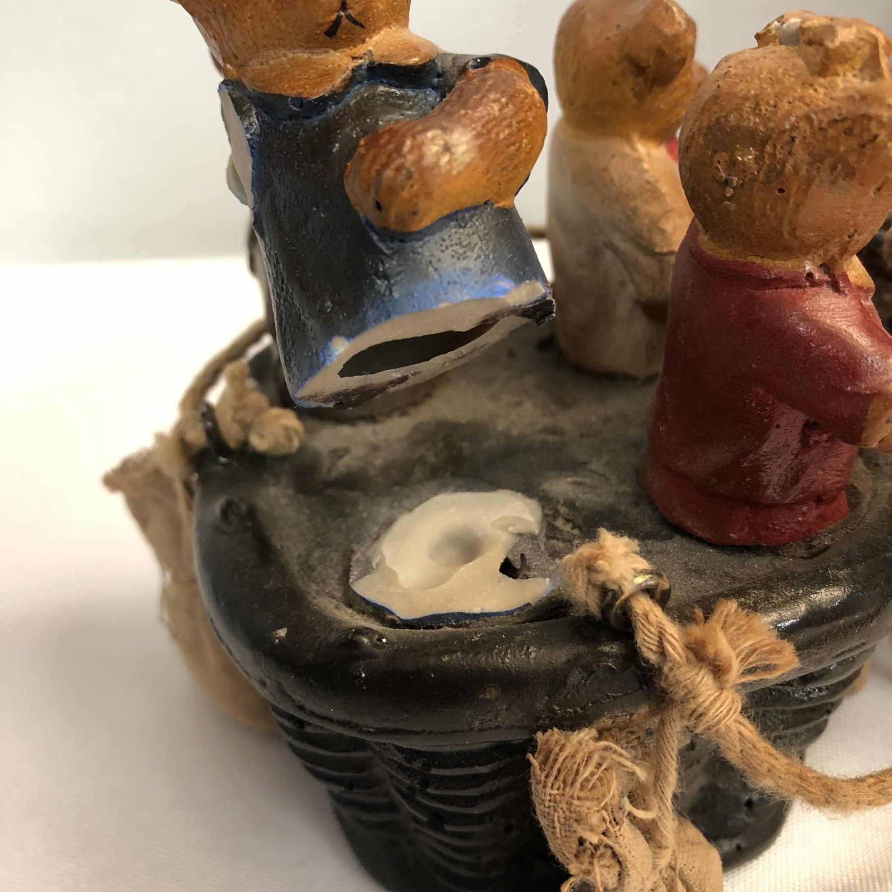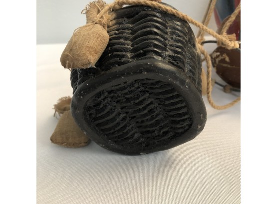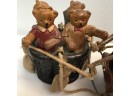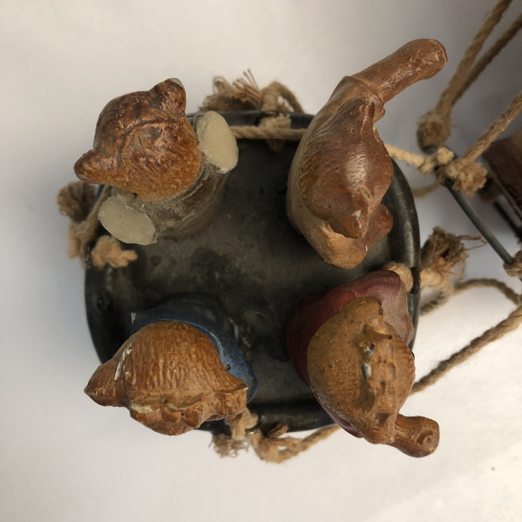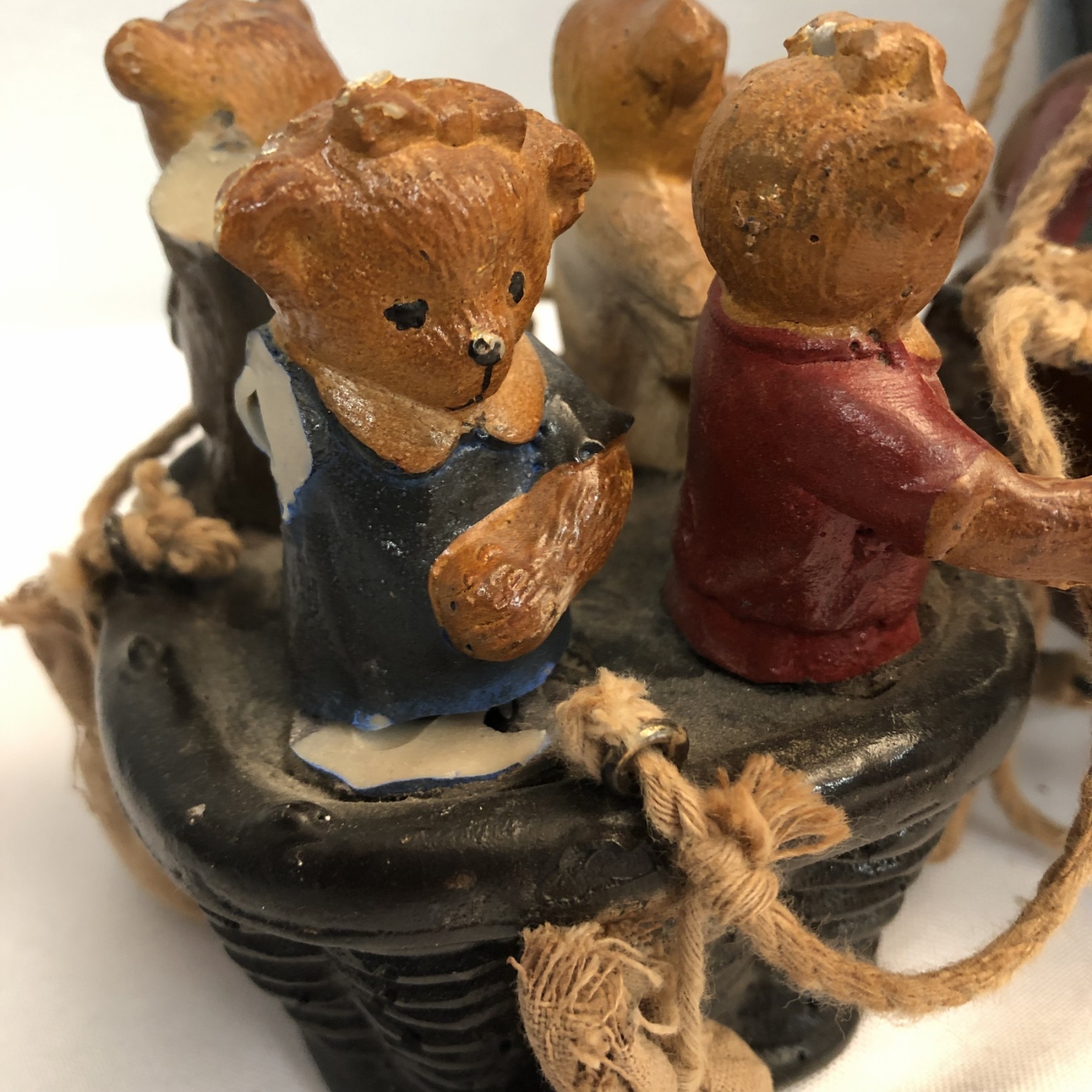 Whimsical Vintage 17"H Hanging Hot Air Balloon W Basket And 4 Bears - - - very realistic with basket, sandbags, ropes & large hook on top for hanging. The balloon looks like painted wood or some kind of resin/composite? And the basket looks like resin/ceramic. There are 4 Bear passengers. Overall fair to good condition - note crack in 1 side of balloon, 1 bear missing both arms and 1 bear missing one arm & needs to be reattached to basket.
