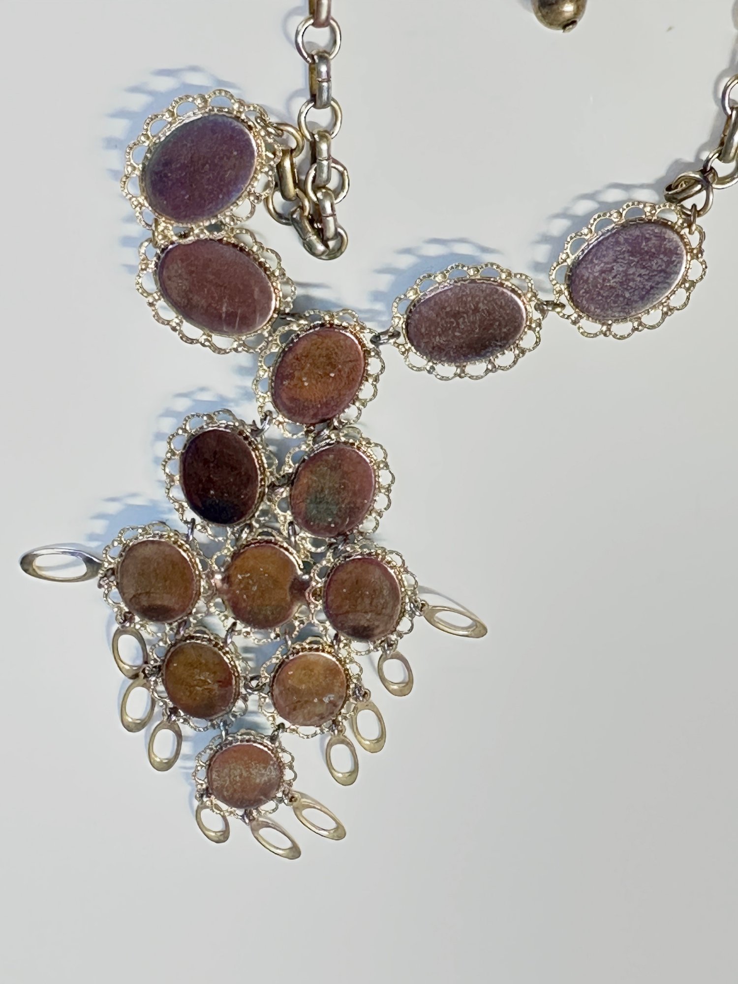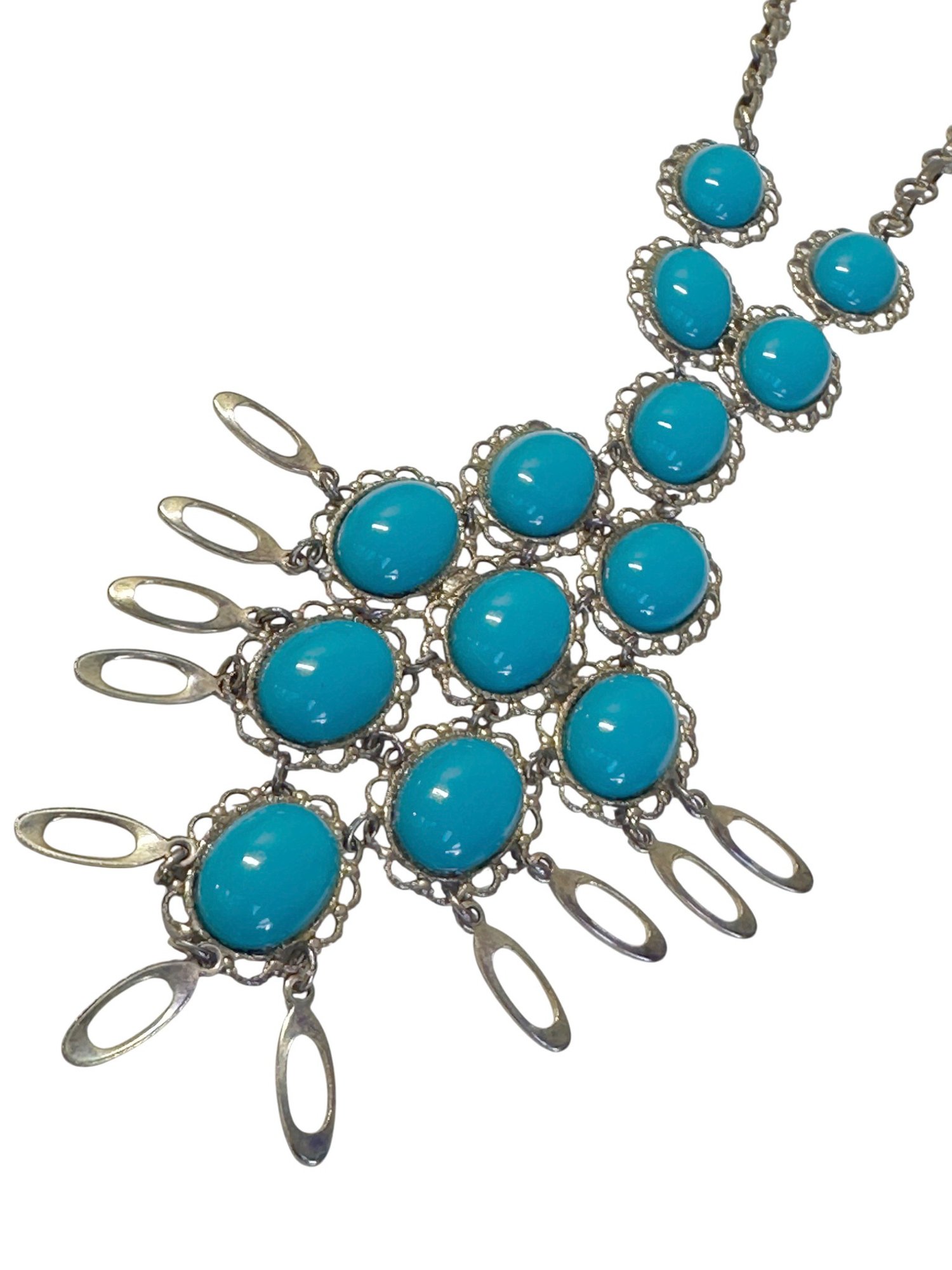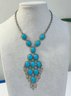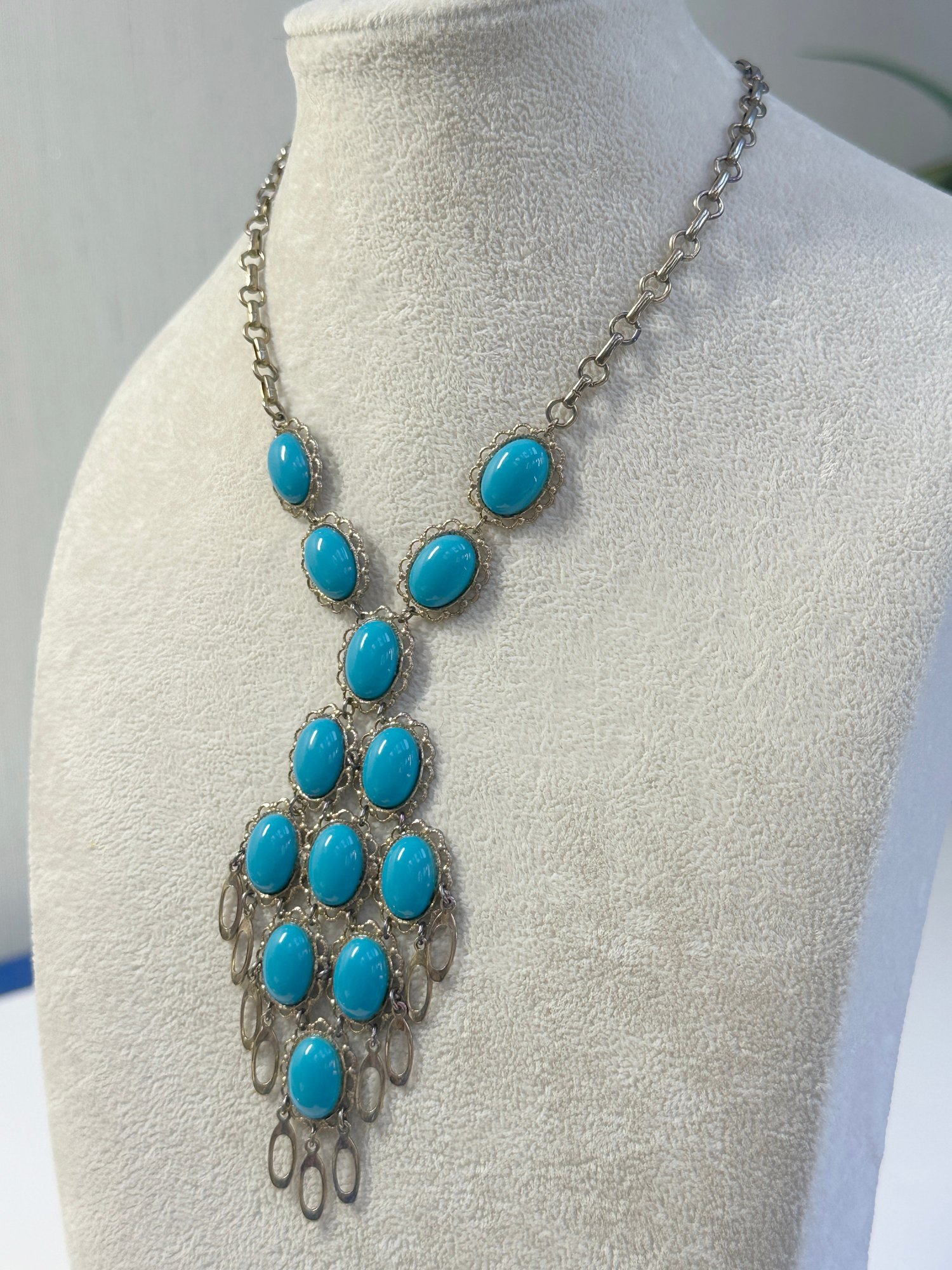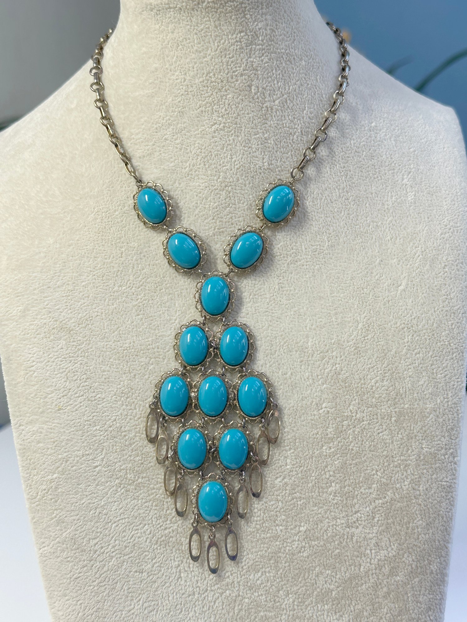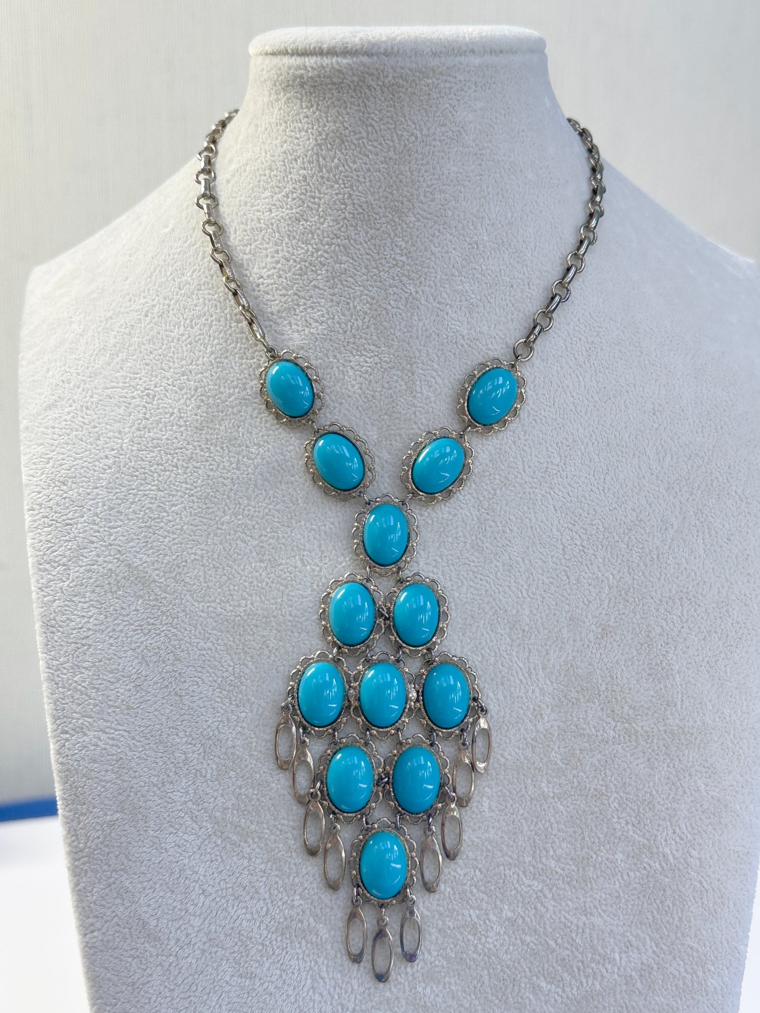 This stunning piece of jewelry turquoise cluster or "squash blossom" style necklace.