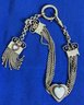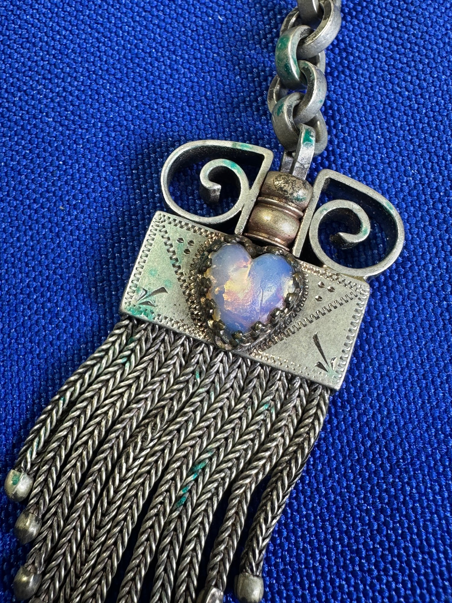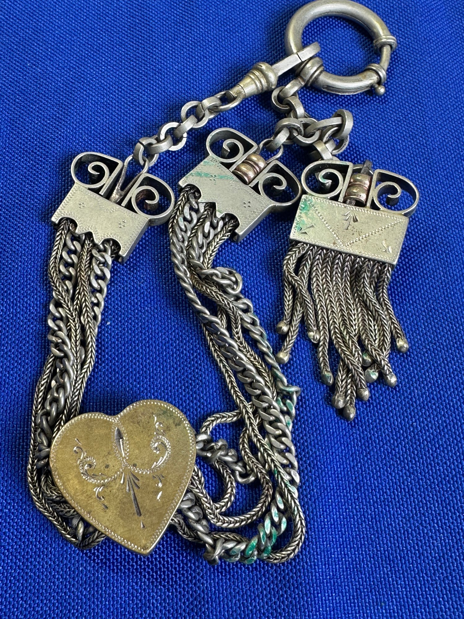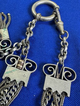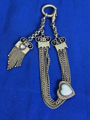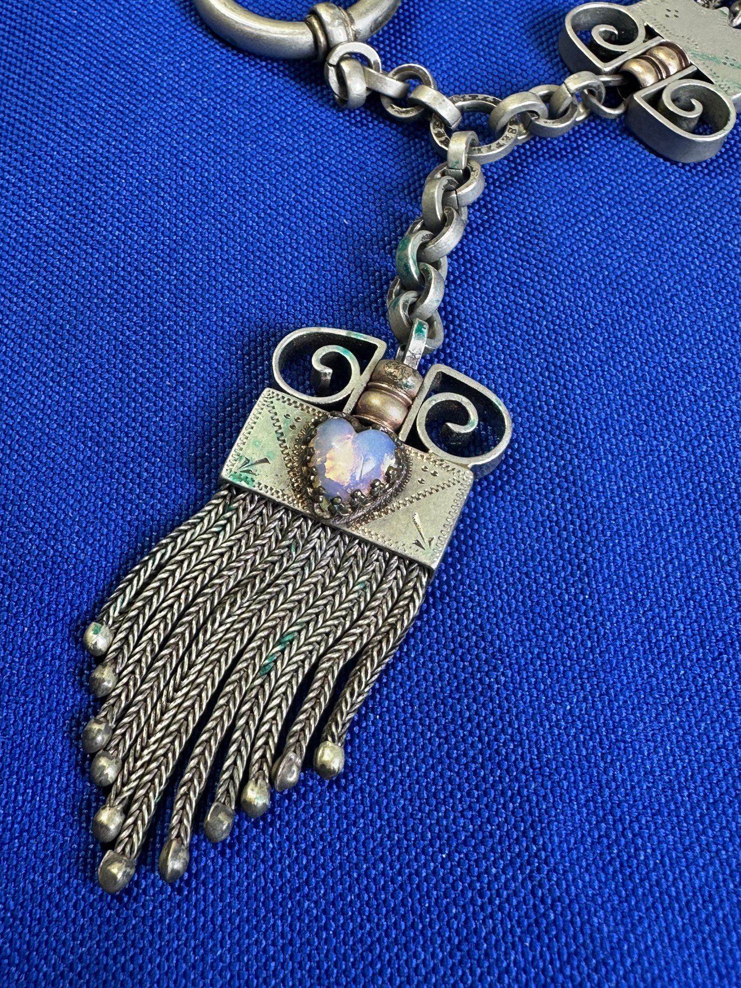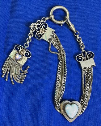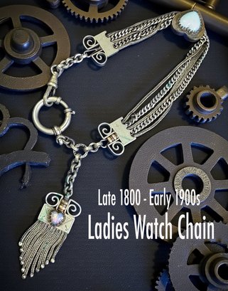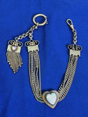 The female equivalent of an Antique Victorian silver Albertina (a type of watch chain worn by women) with opal-set heart fobs and a tassel.