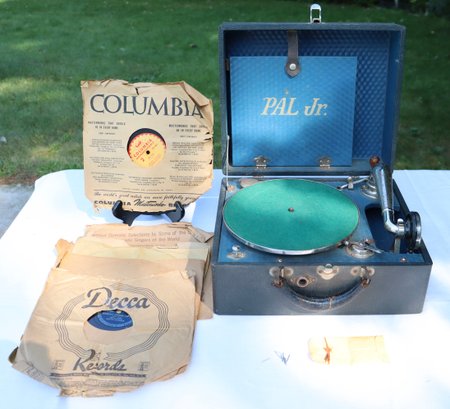 Antique Pal Jr. Hand Crank Record Player with four 78 records and extra needles. The turn table rotates when cranked. It is untested playing a record at this time.