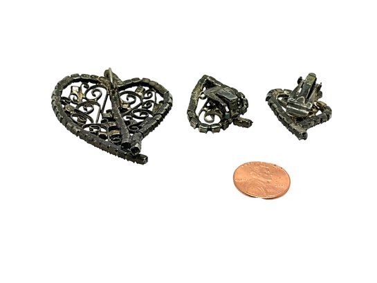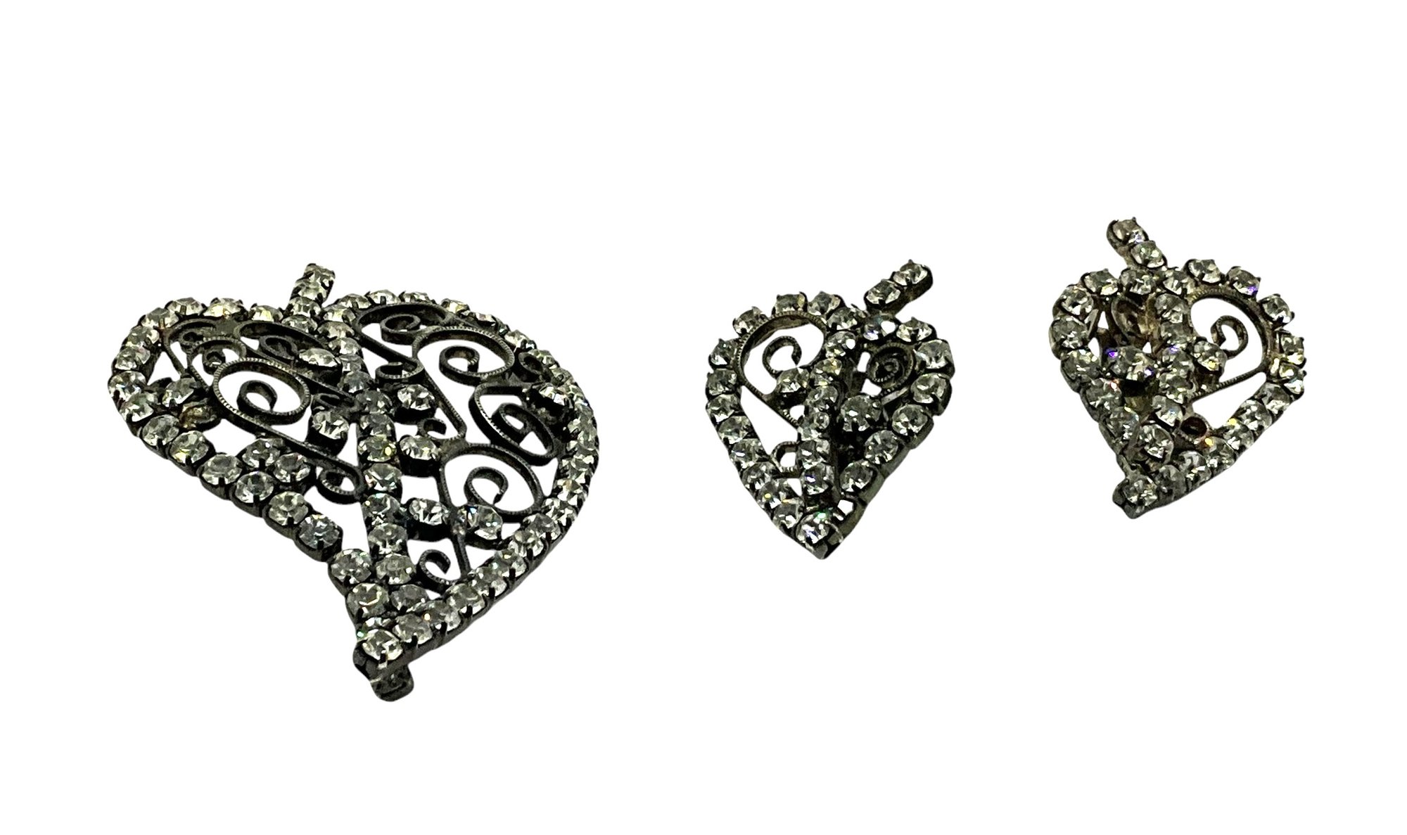 Filigree and rhinestones heart pendant unsigned with matching clip on earrings. Pendant measures 2.5 inches and earrings measures 1.25 inches.