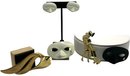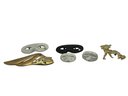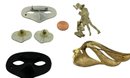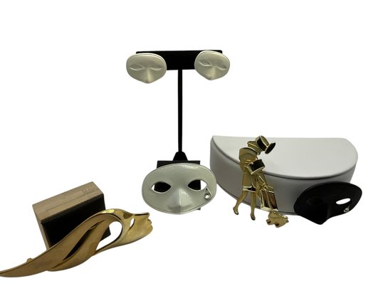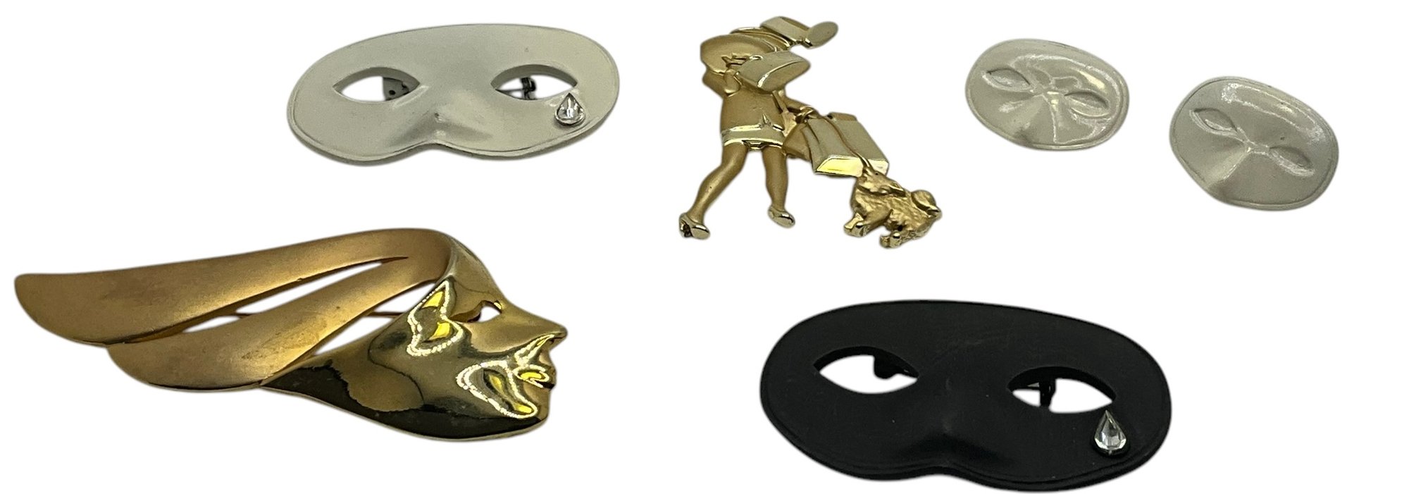 Metal costume mask black and white with matching earrings 3.5 inches and face brooch girl with packages and dog measuring ar 2.5 inches.