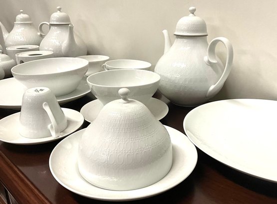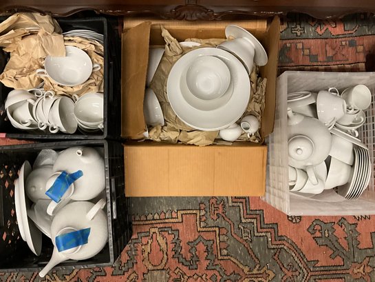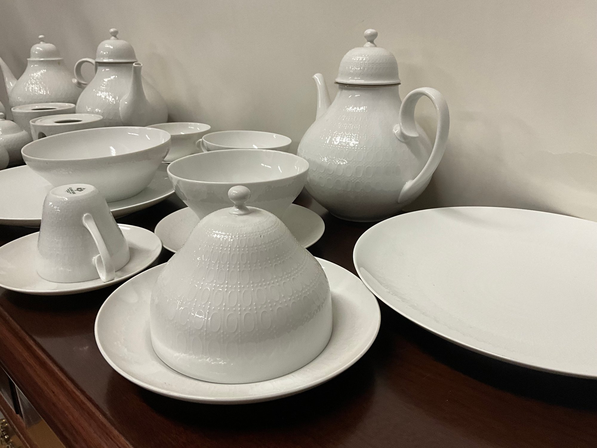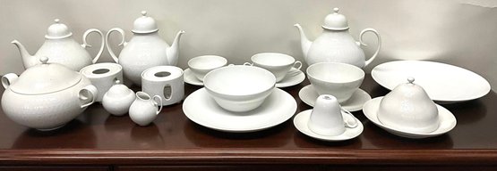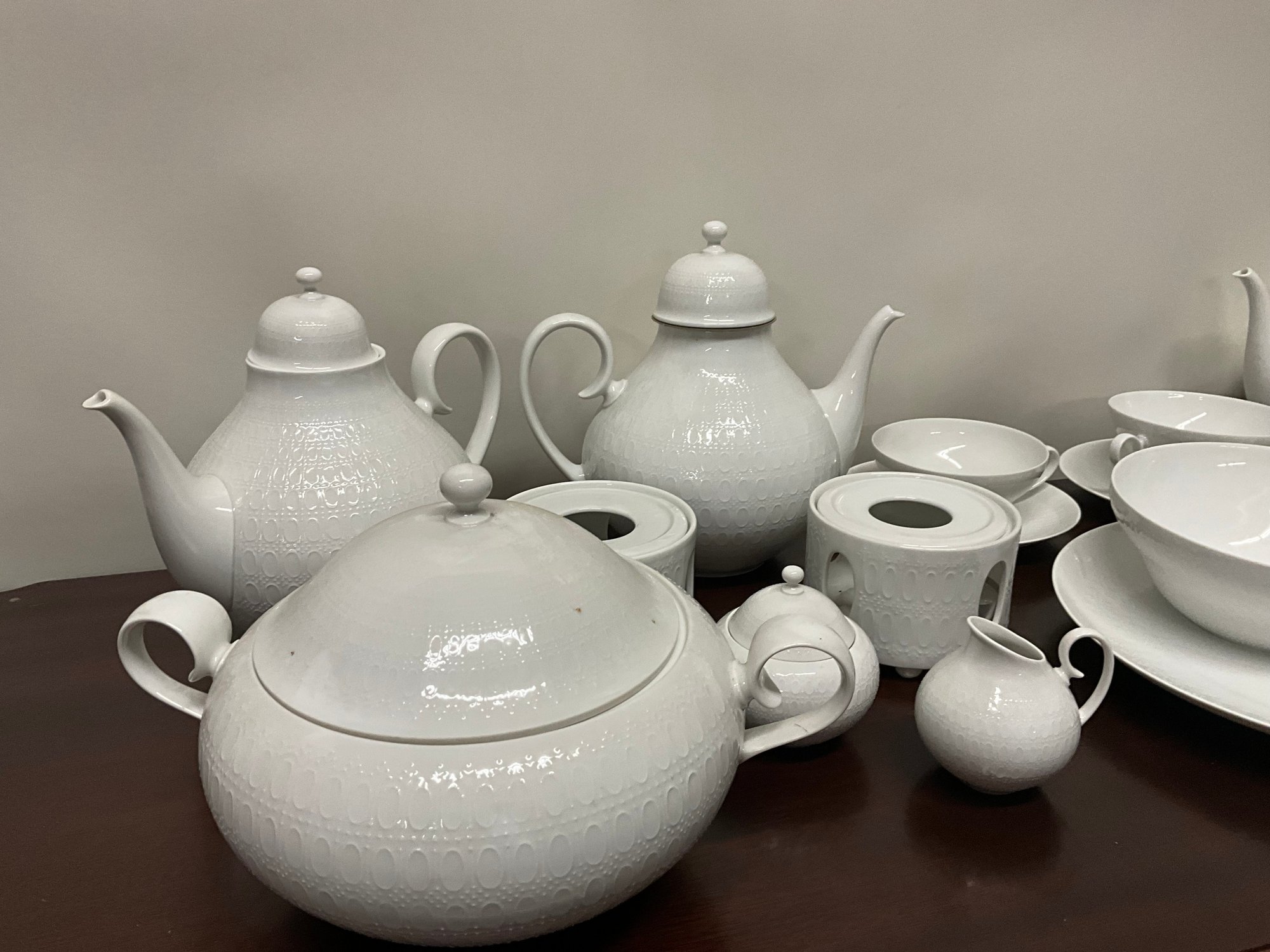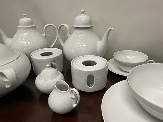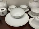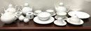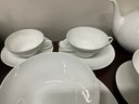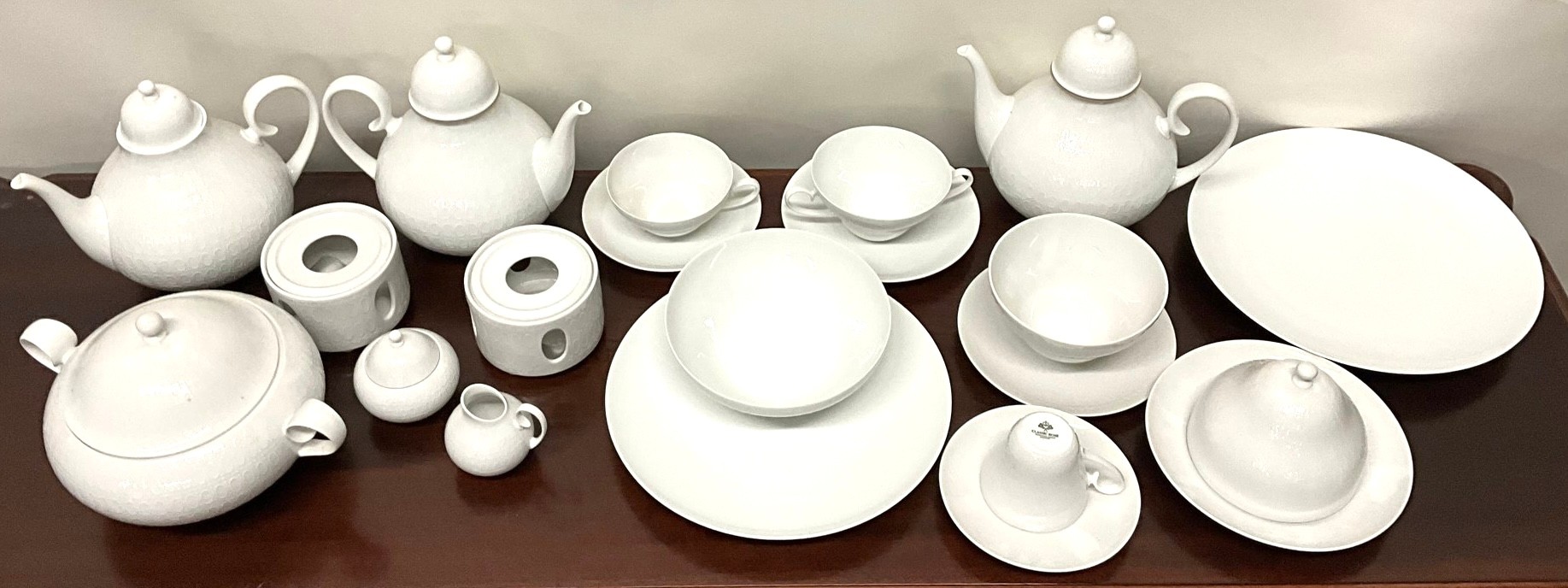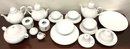 3 teapots, cream/sugar, 2 candles, dblk. handle soup bowls, covered vegetable bowl, dinner & bread plates, butter keeper, platter, with many extras
