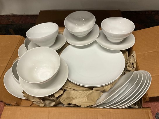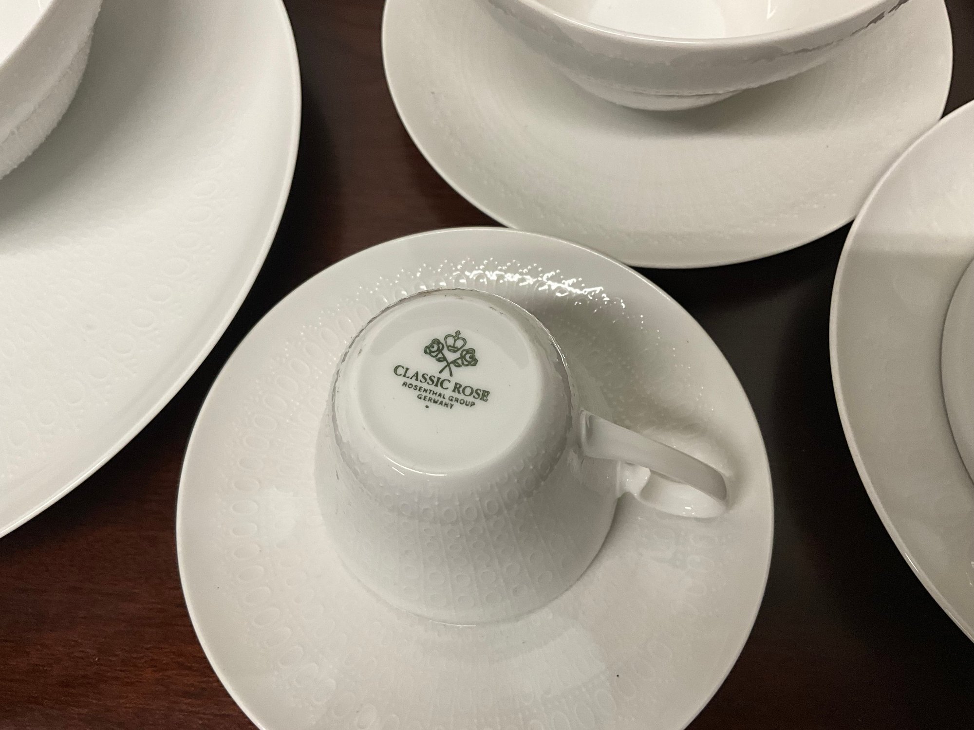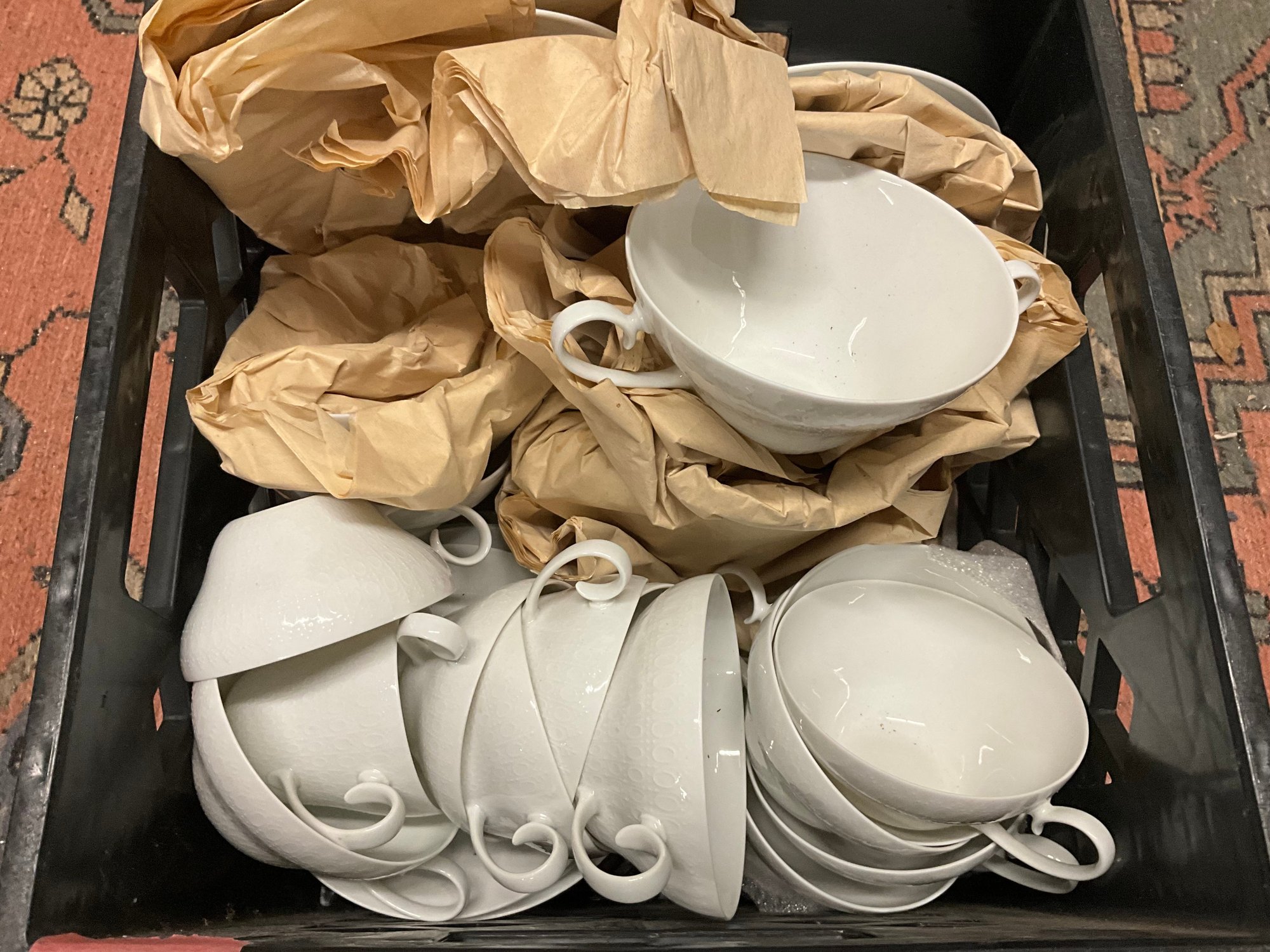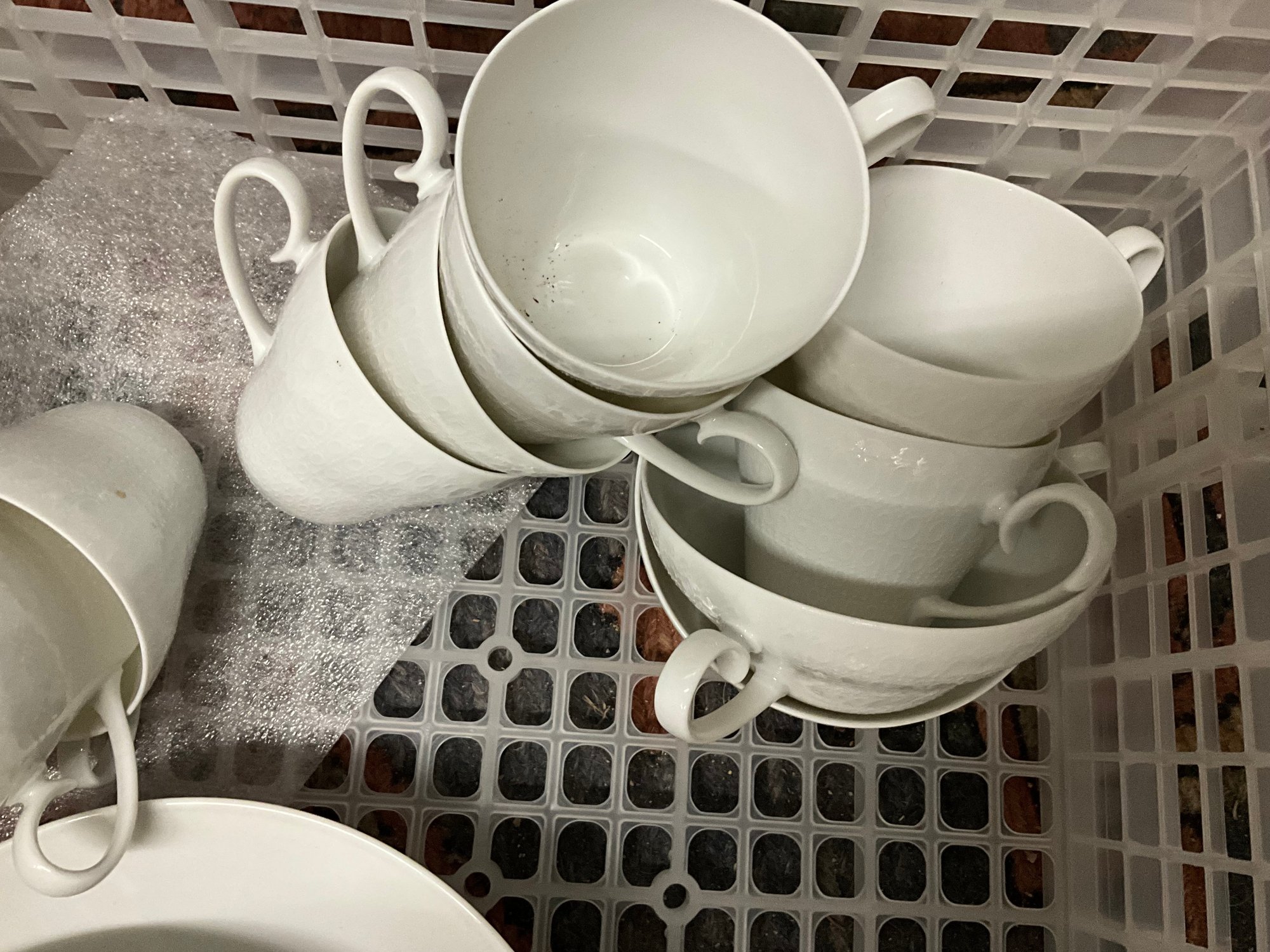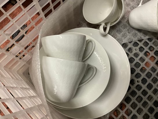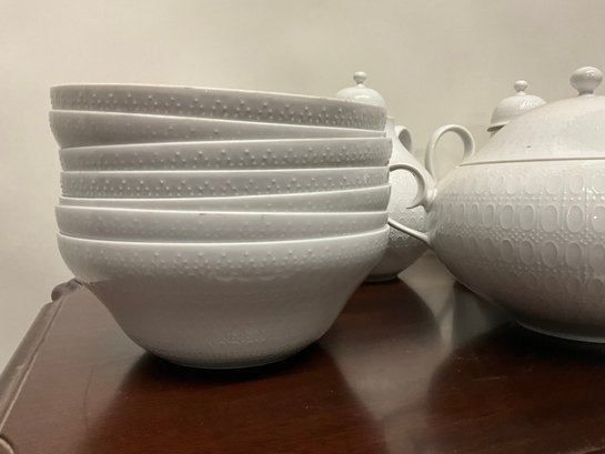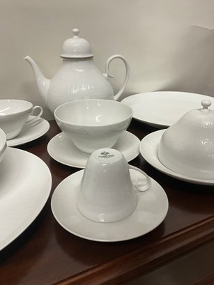 3 teapots, cream/sugar, 2 candles, dblk. handle soup bowls, covered vegetable bowl, dinner & bread plates, butter keeper, platter, with many extras