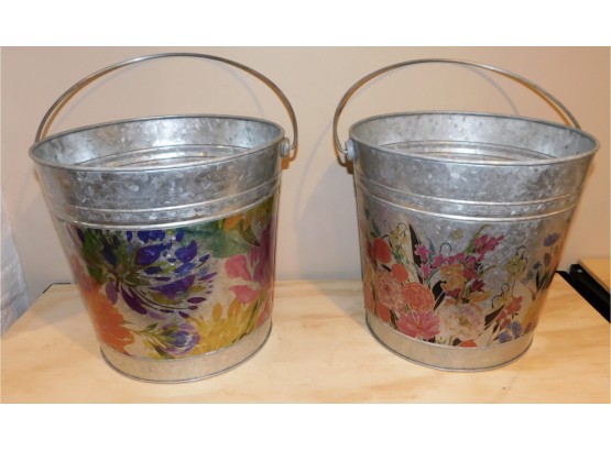 Pair Of Floral Pattern Galvanized Steel Buckets With Handles
