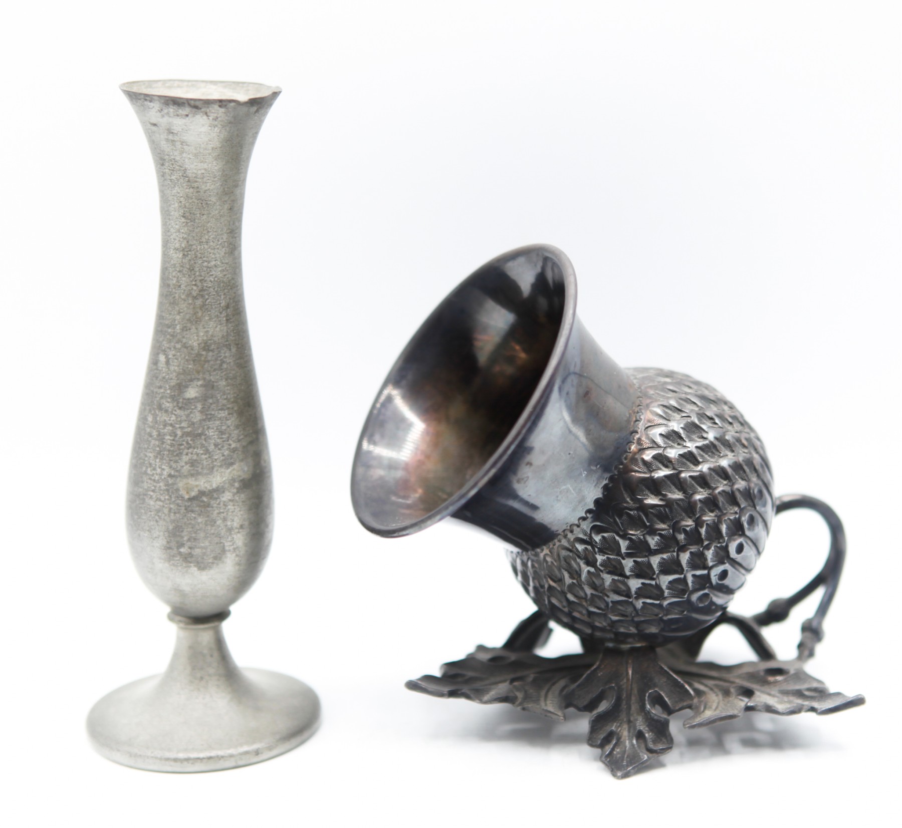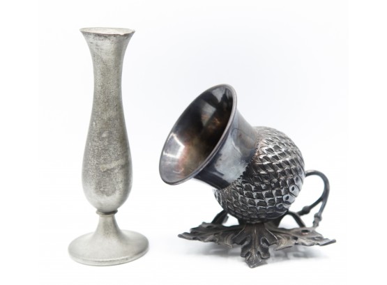 Antique 19thc James Dixon Silver Plated Thistle Chamberstick EPBM 5770 & Leonard Genuine Pewter Vase