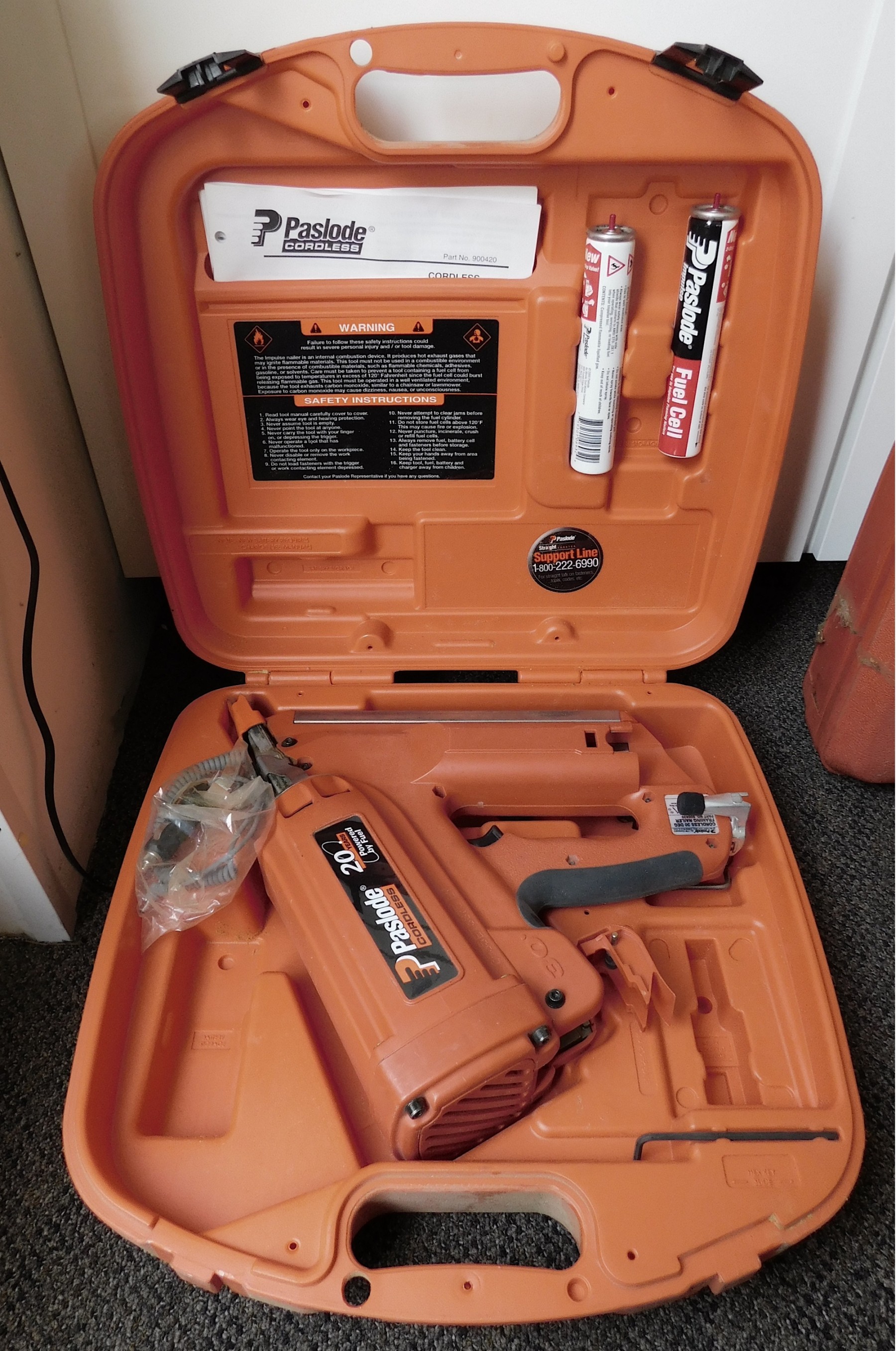 Includes nailer, charger, battery, case, and papers.