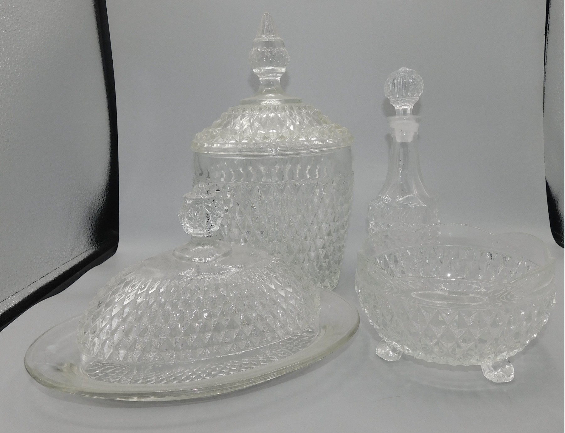 Assorted Cut Glass, Ice Bucket, Butter Dish, Vinegar Bottle, & Decanter