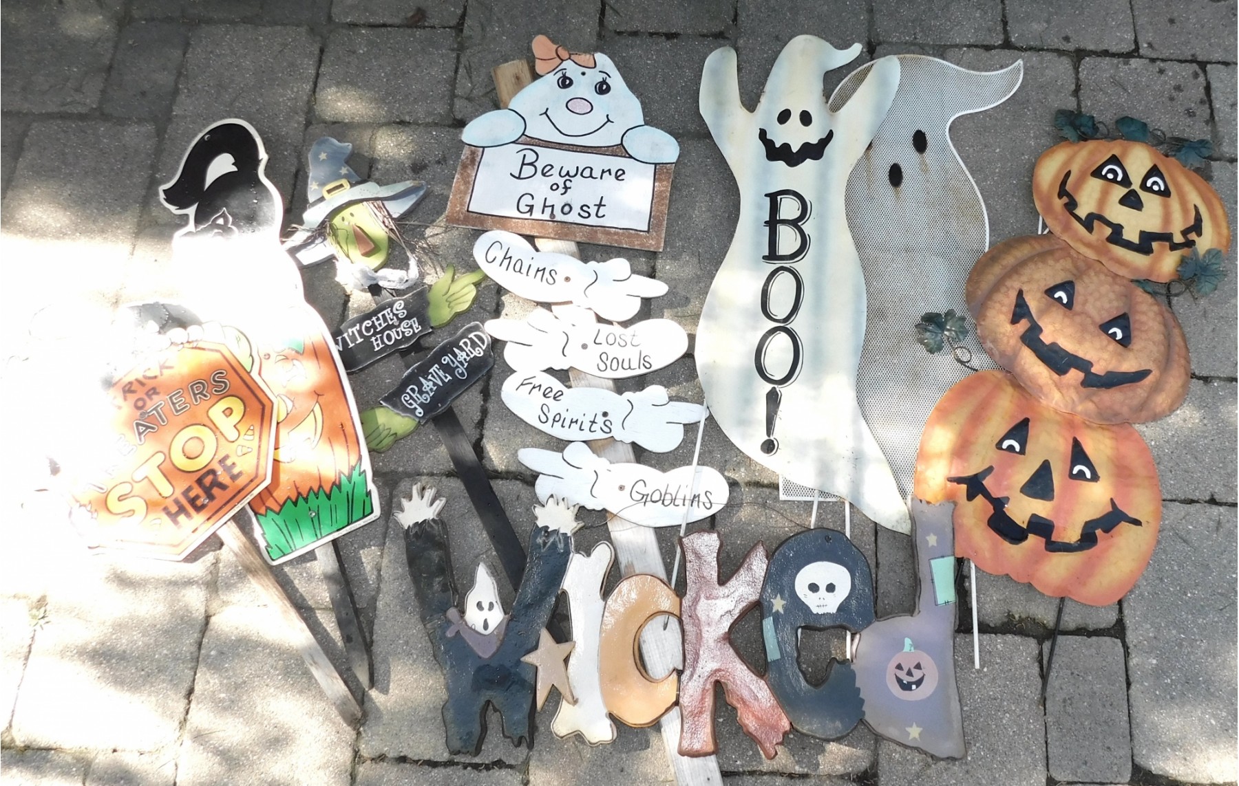 assorted wooden and metal fall and halloween lawn signs