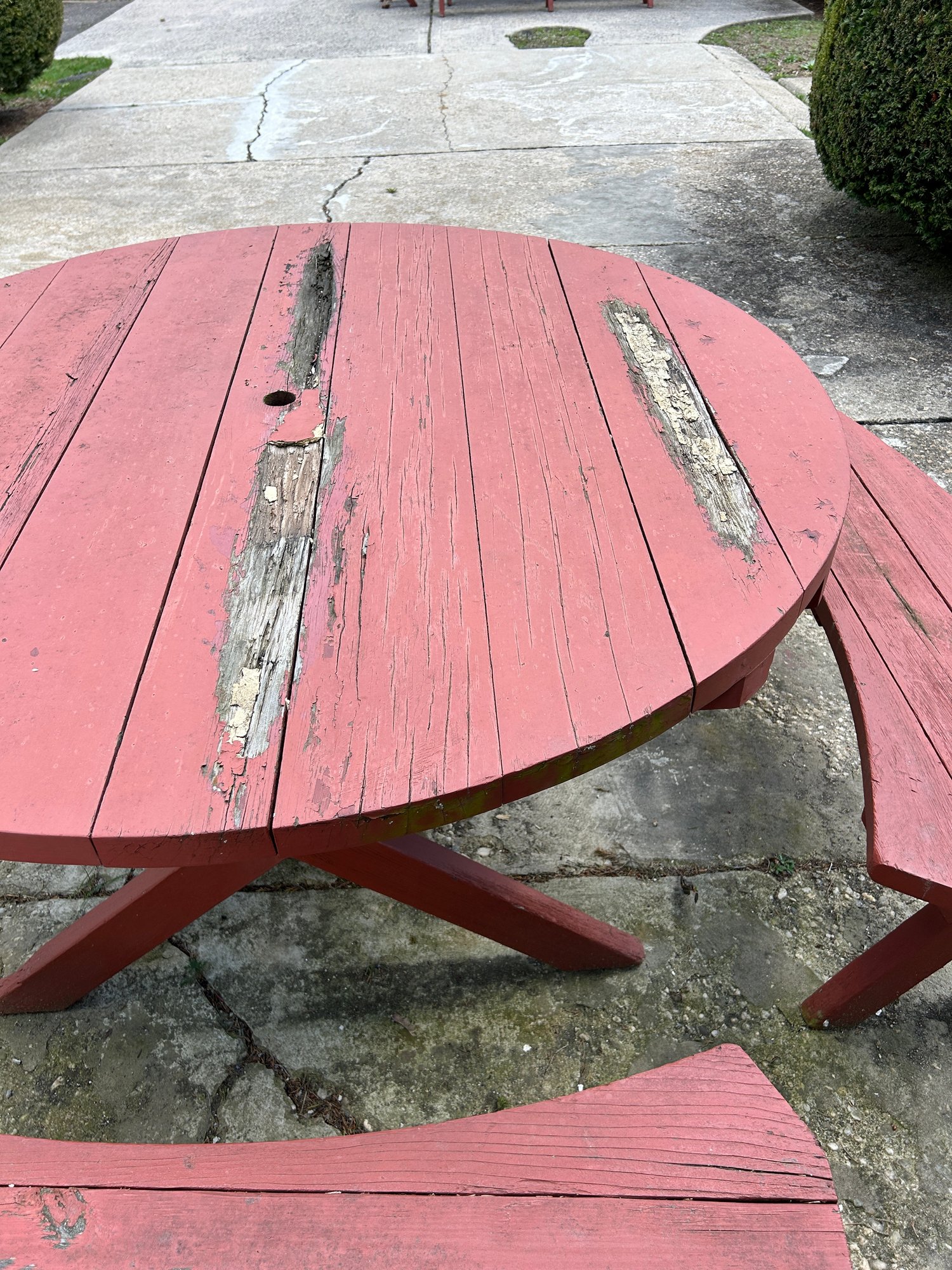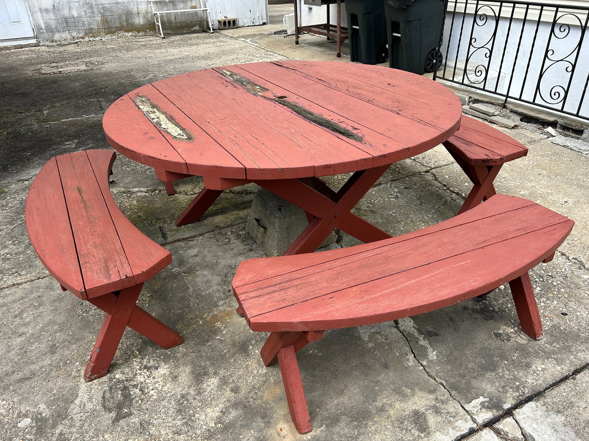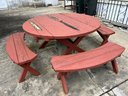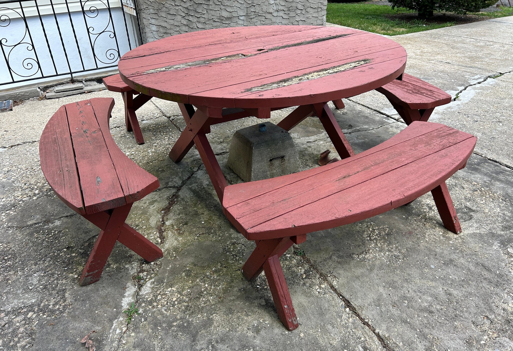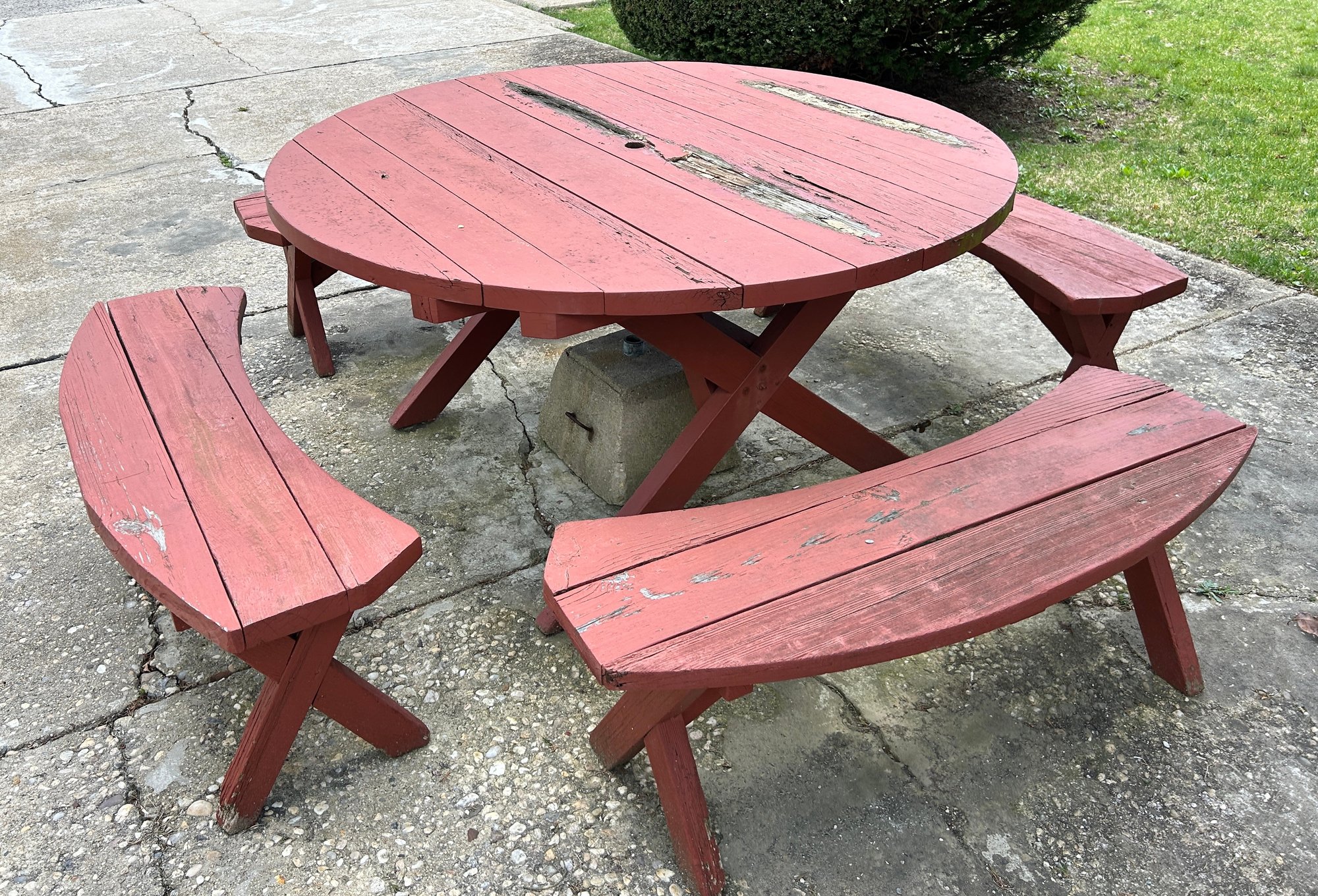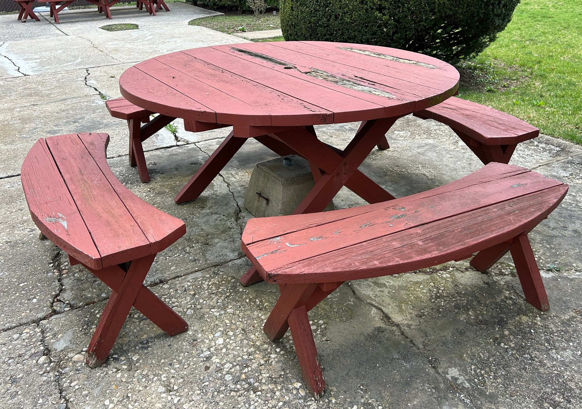 classic-style circular wooden picnic table set with four curved benches
