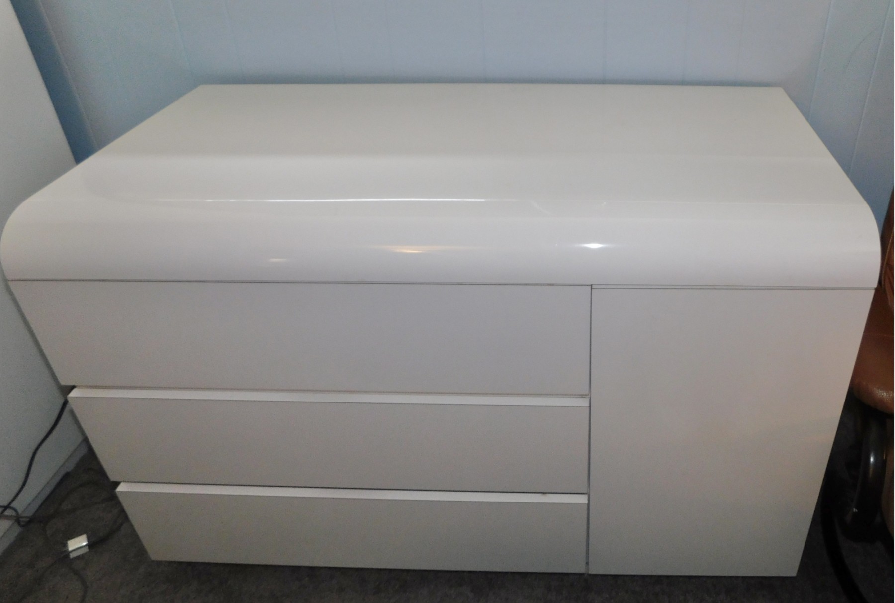 Wardrobe has one door compartment with two shelves and three roller drawers