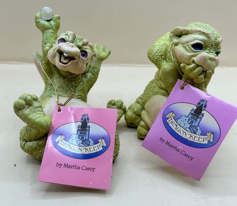 The figurines are part of the "Dragon Keep" series by Martha Carey, also known as Marty Sculpture.