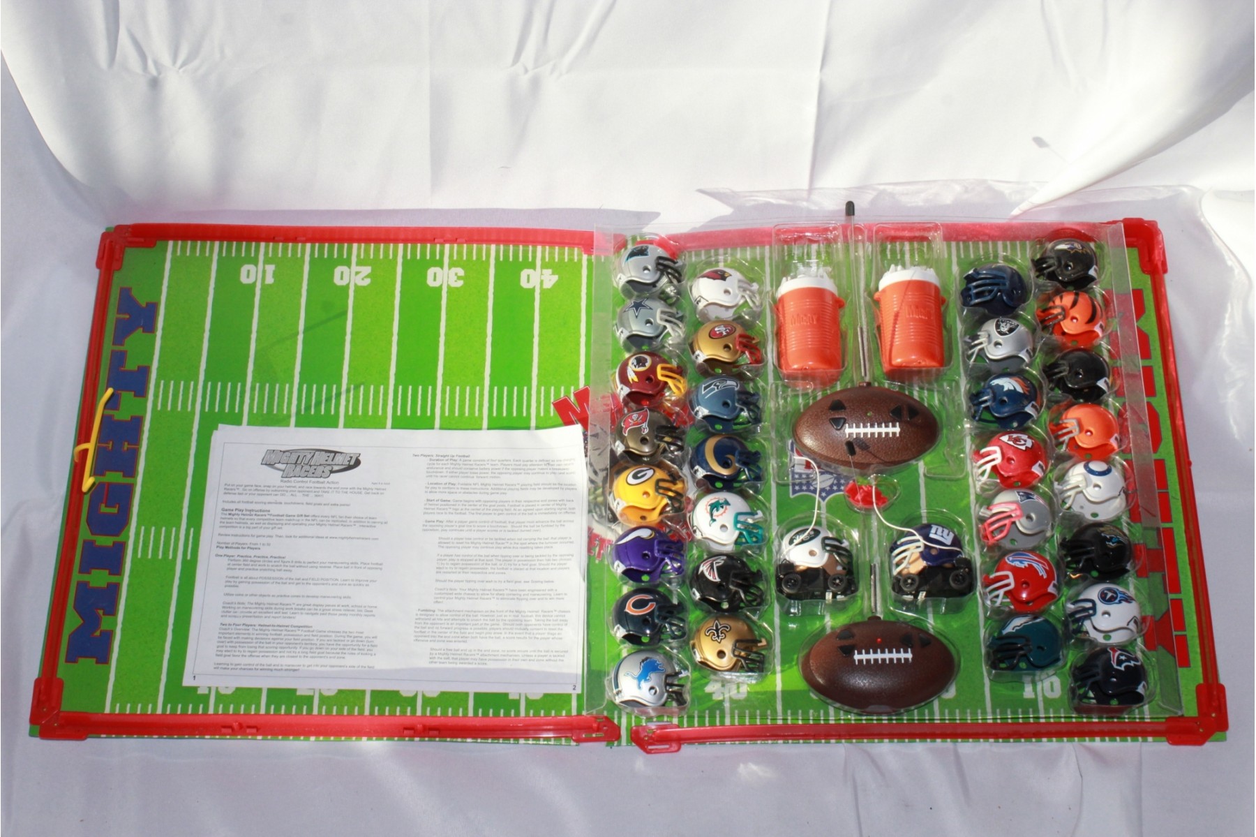 Includes helmets from all 32 teams w/ 2 remote controlled cars & board.