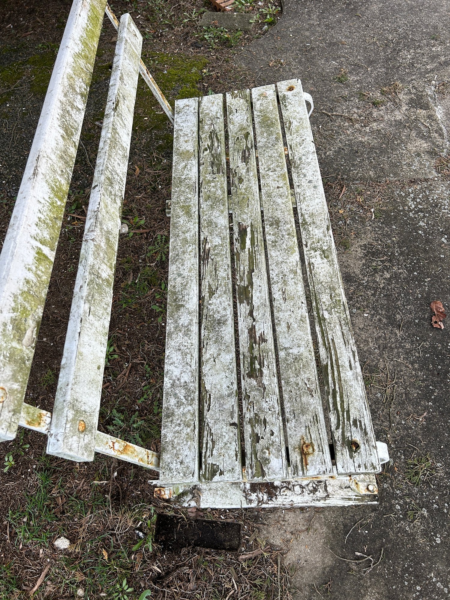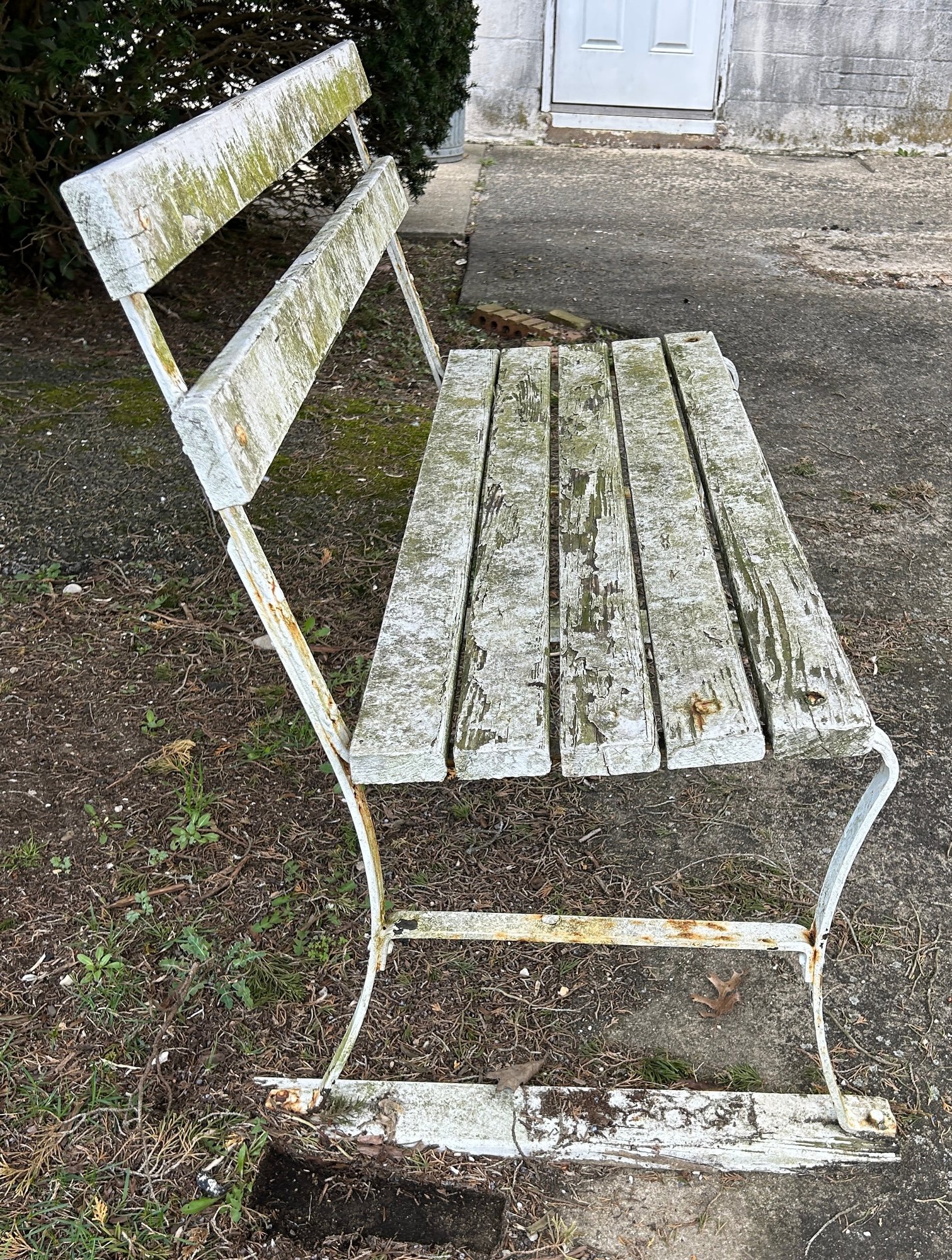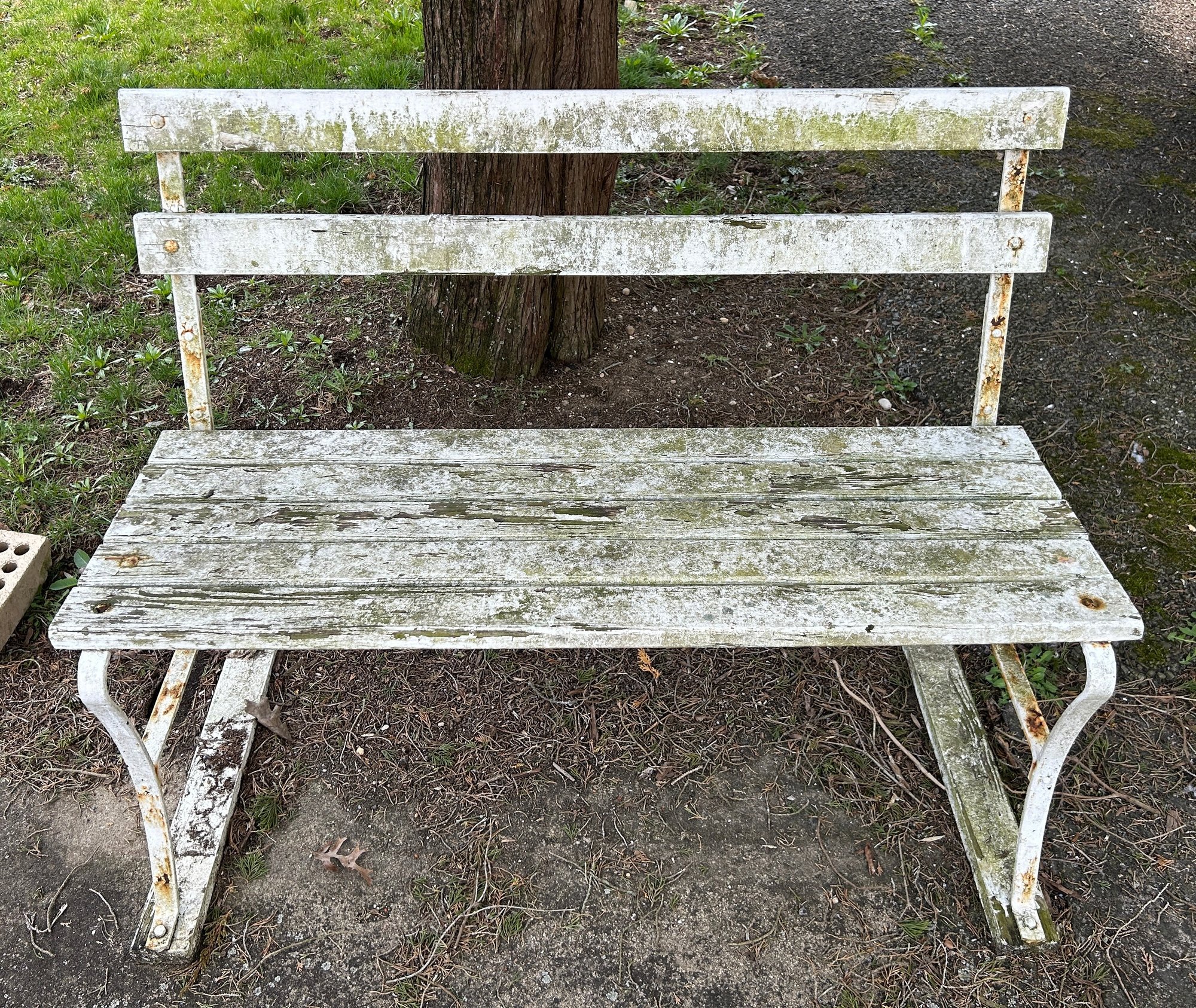 This is a vintage garden bench featuring a wrought iron or cast iron base and wooden slats