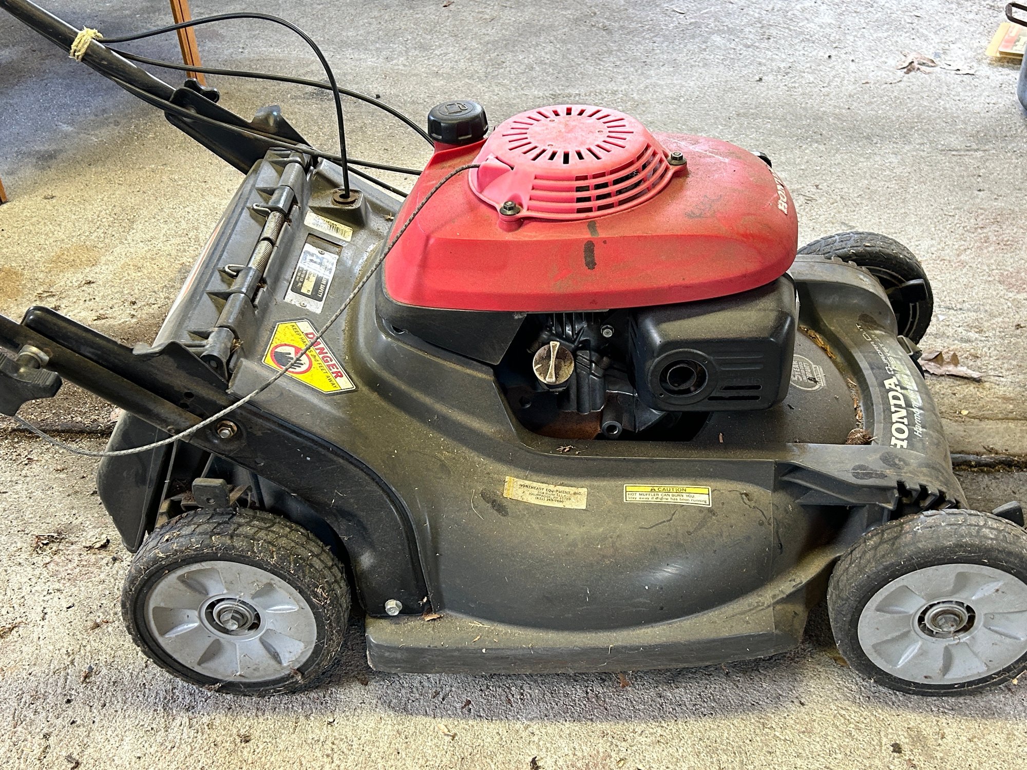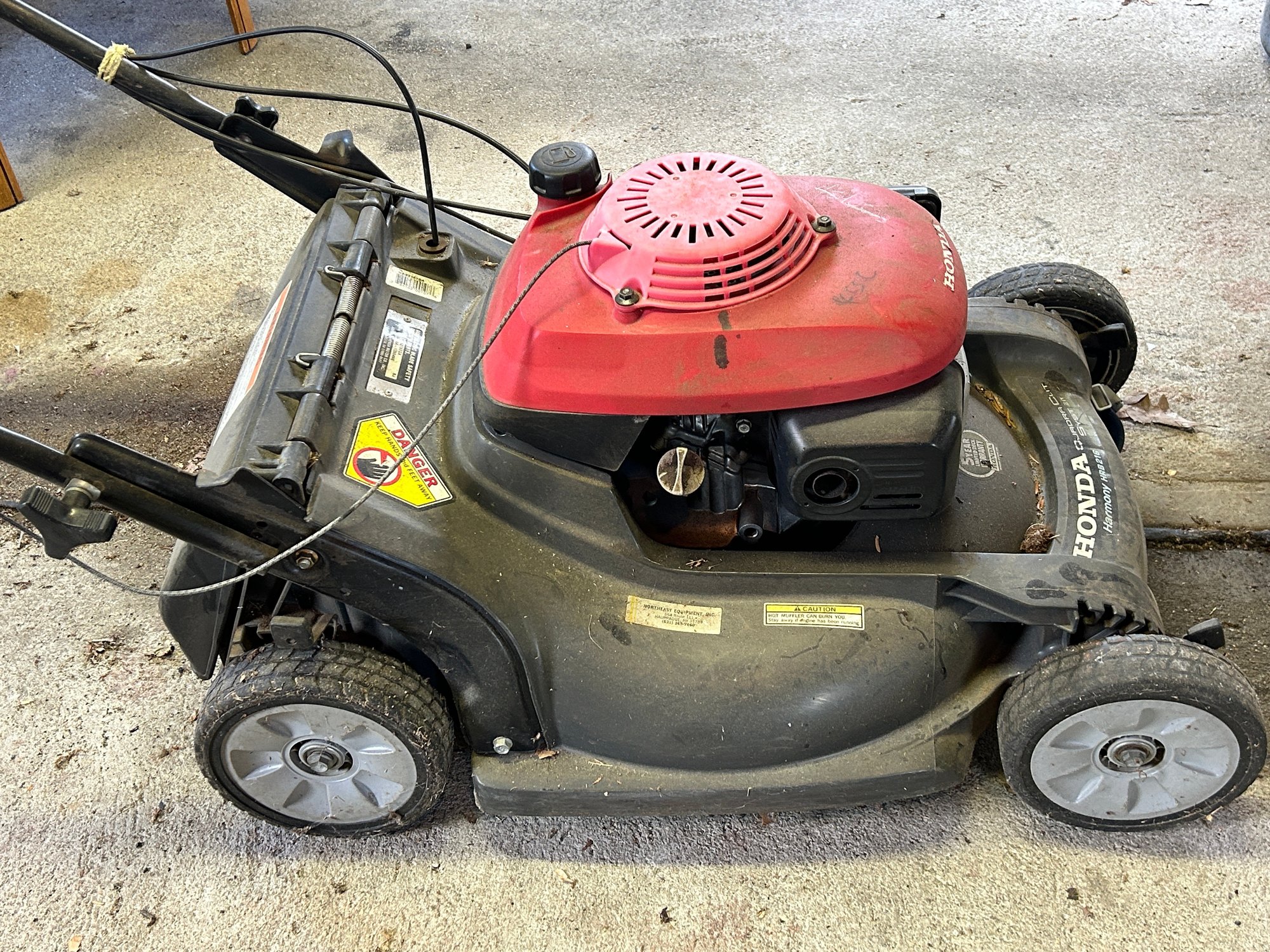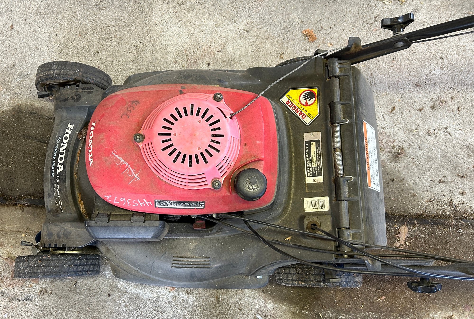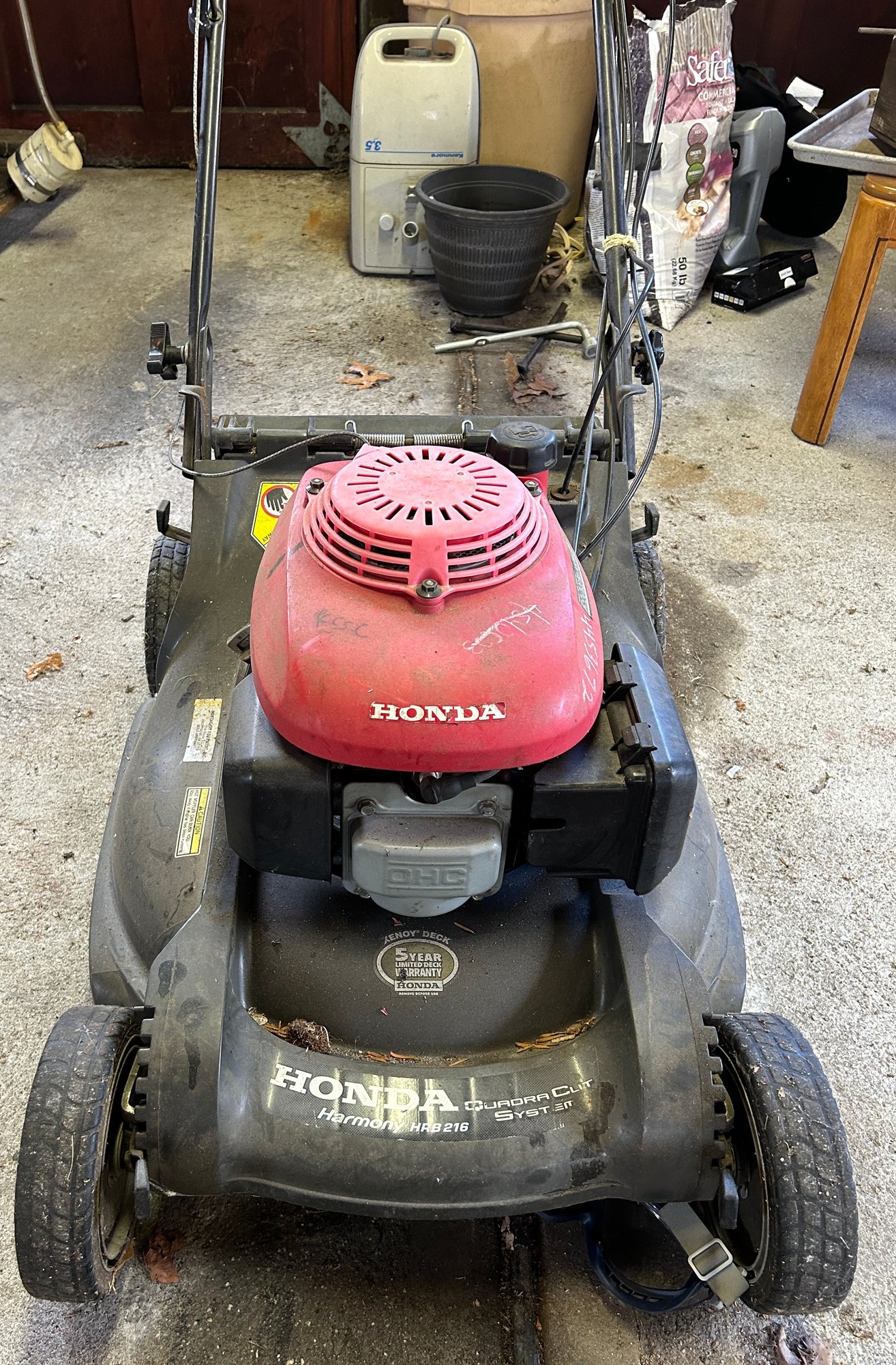 Honda Harmony HRB216 lawn mower featuring a Quadra Cut System. It features the Quadra Cut System, which uses twin blades for superior mulching and bagging performance. These models are powered by a Honda GCV160 engine, known for being reliable and easy to start.