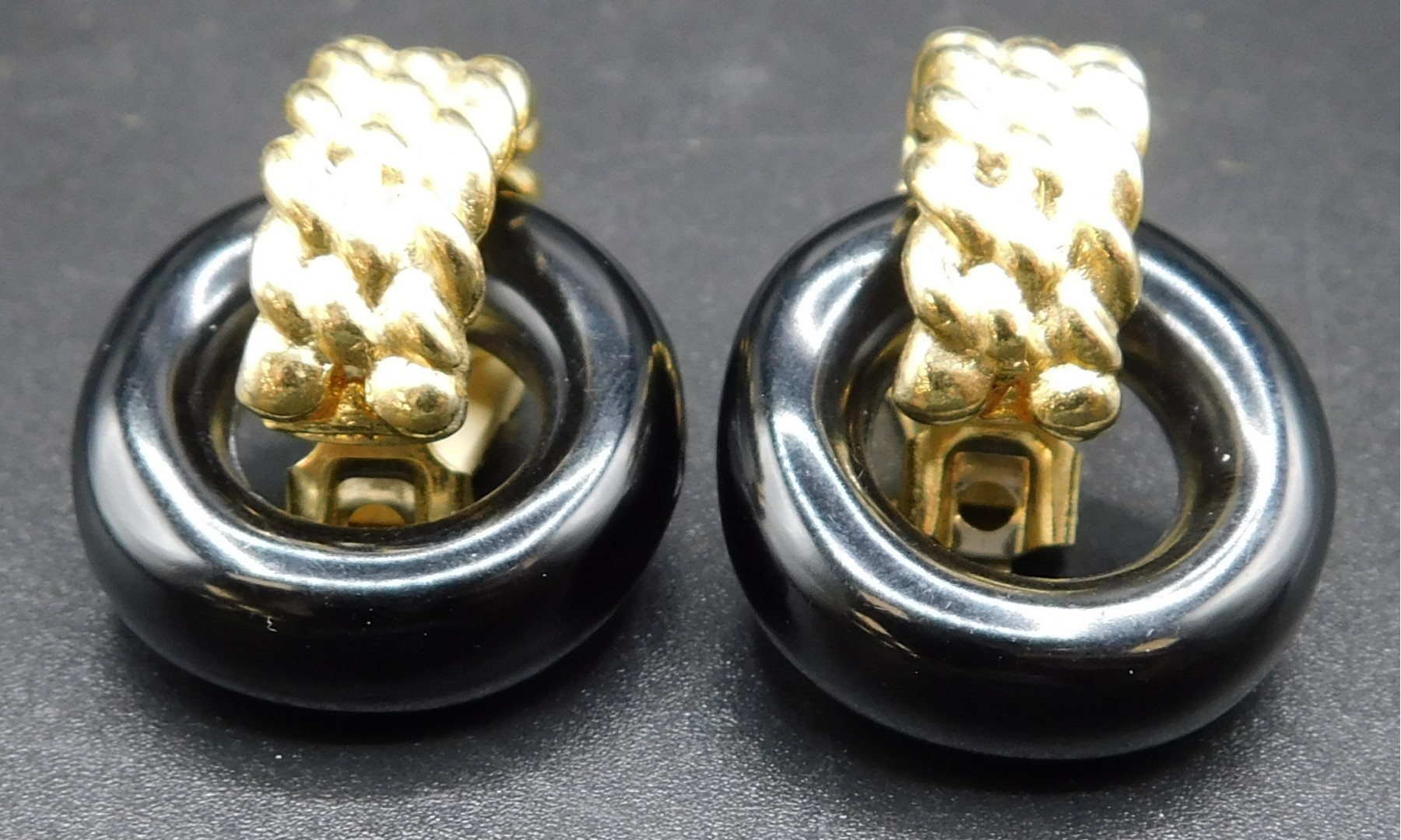 Kenneth John Lane Gold Tone Braided Hoop With Attached Black Plastic Hoop Earrings