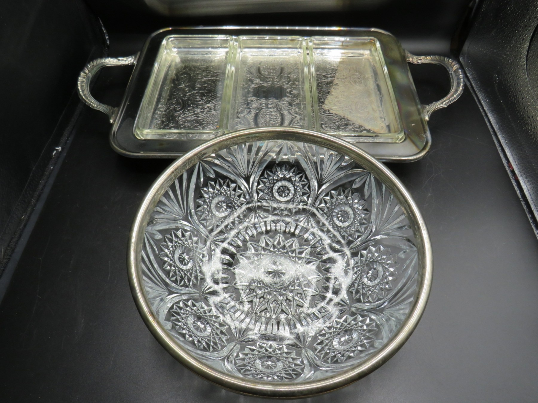 Glass Bowl With Silver Plated Rim & Handled Platter With 3 Glass Dishes - Assorted Set Of 2