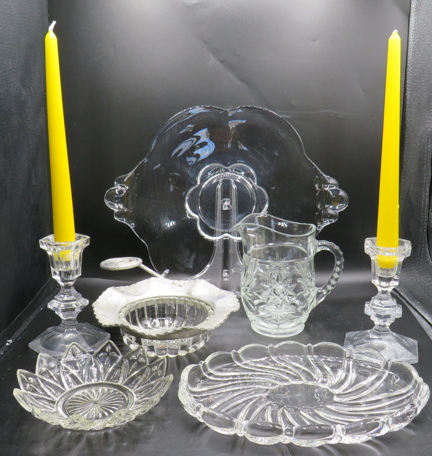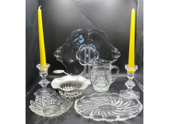 Glassware Plates, Dishes, Pitcher, Candlestick Holders- Assorted Set