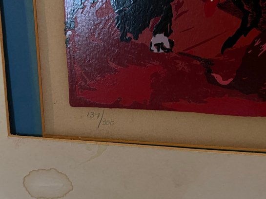 This specific work features multiple vignettes of the torero and the bull set against a dramatic, deep red background. It is hand-signed in pencil by the artist in the lower right and numbered 137/300 in the lower left.