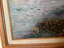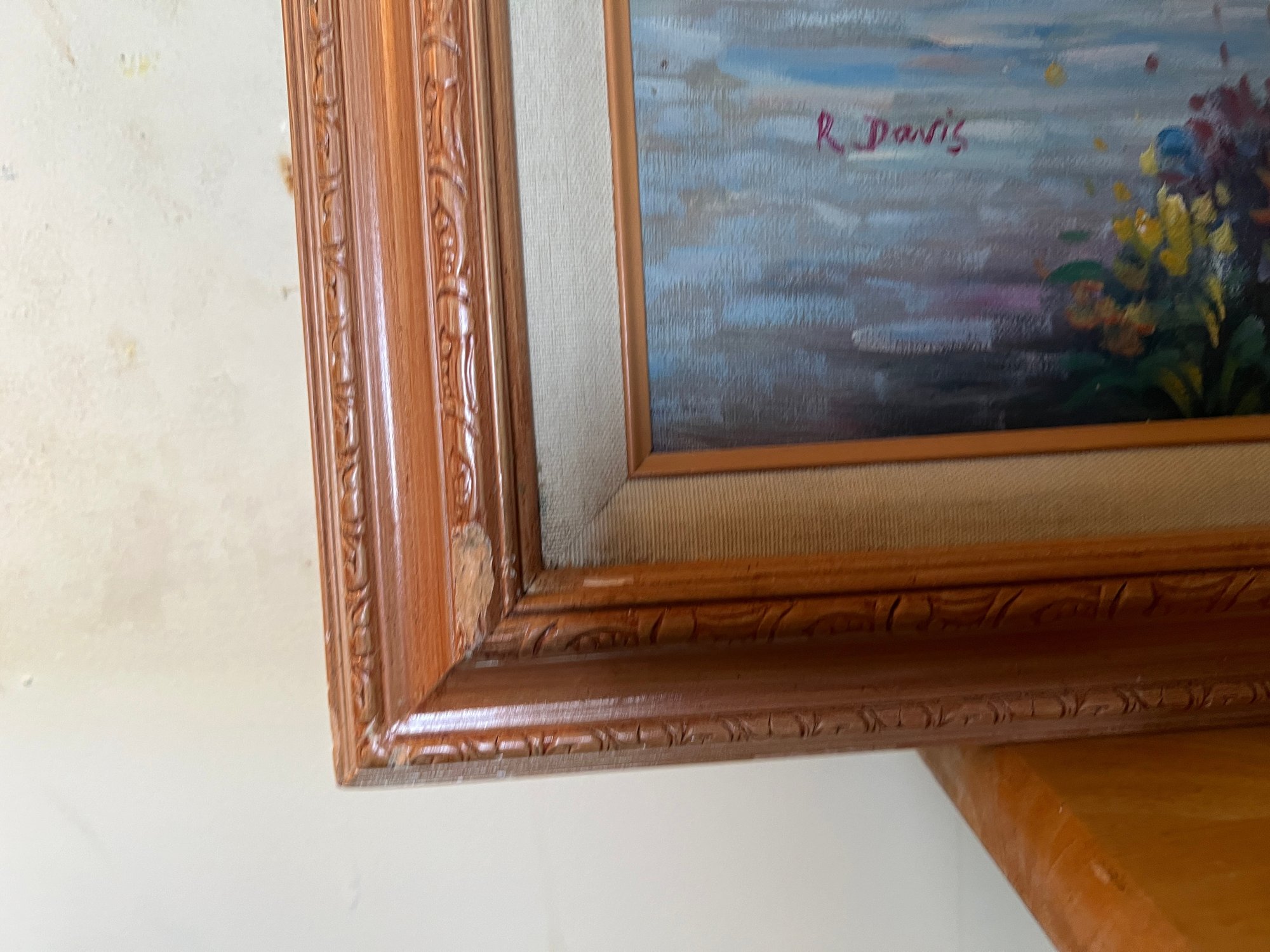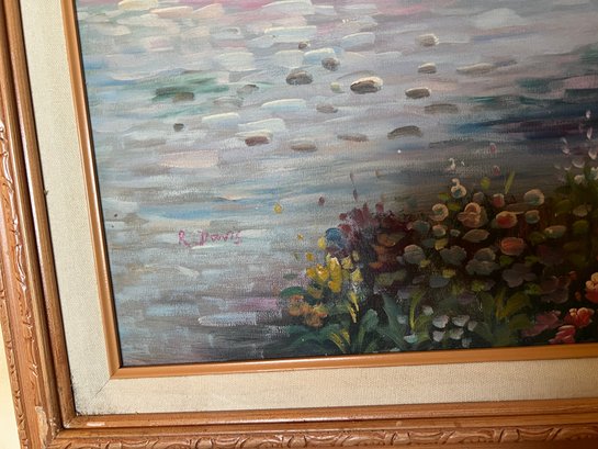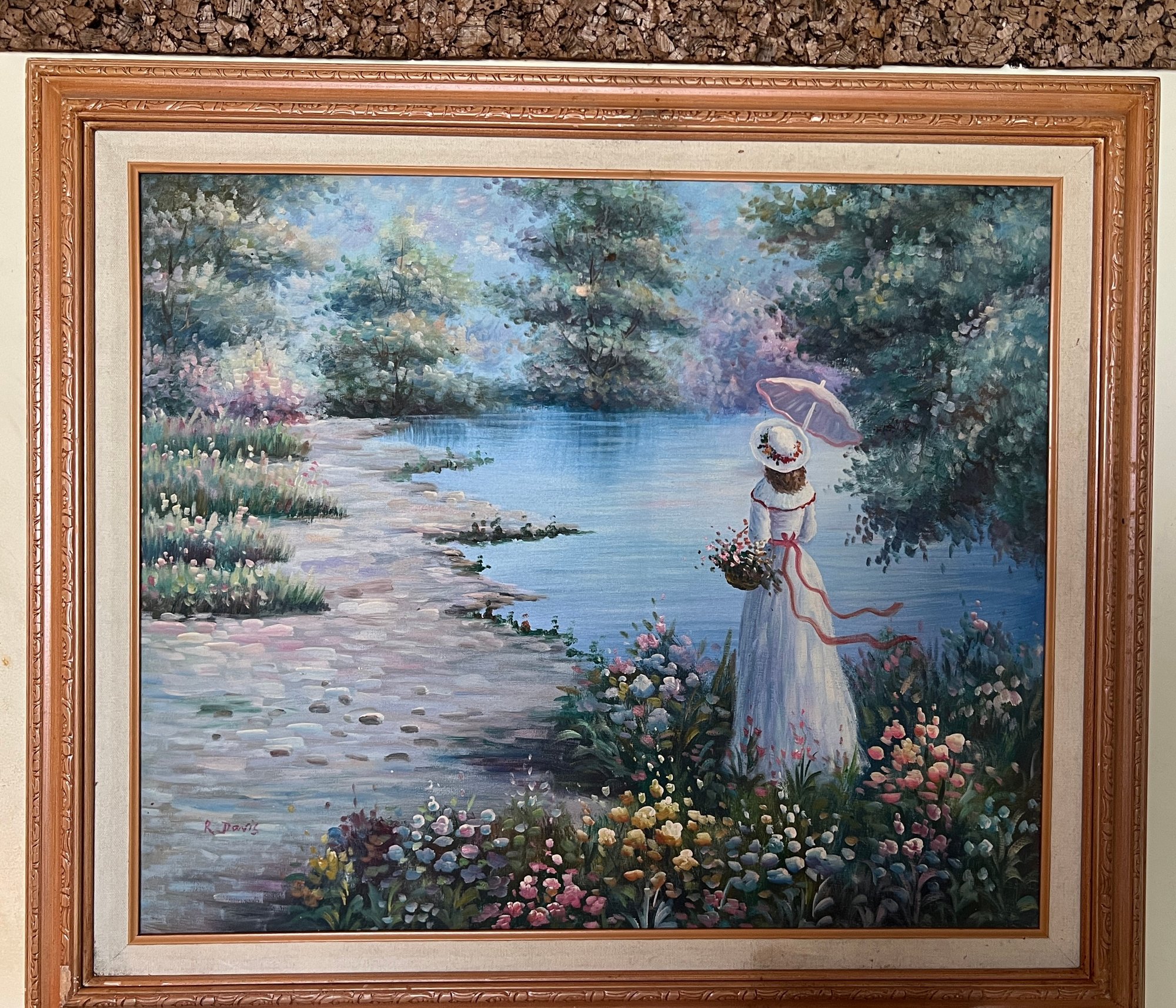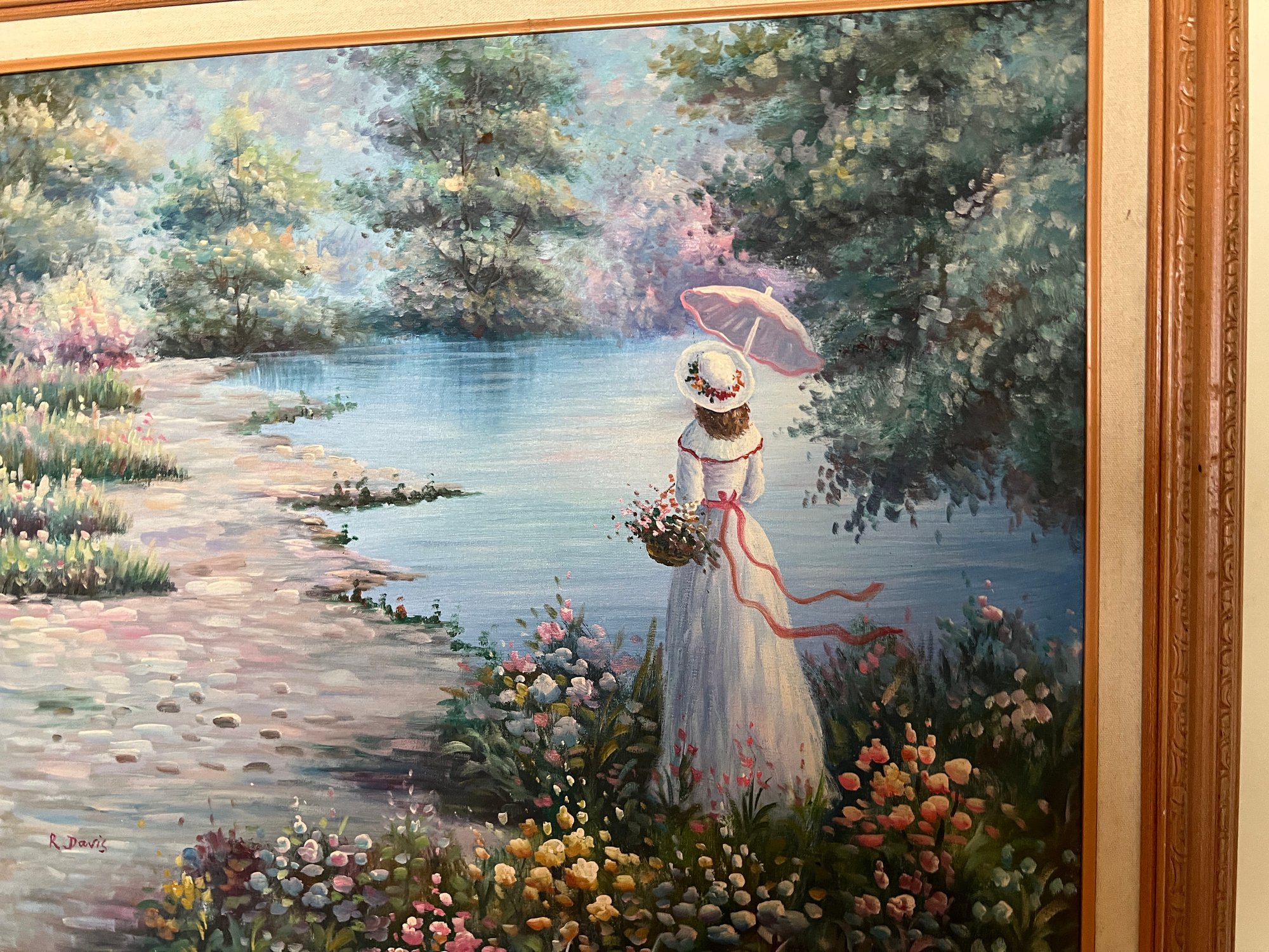 This serene Impressionist-style oil painting on canvas captures a tranquil moment of a Victorian lady standing by a peaceful lakeside. Dressed in a flowing white gown with a wide-brimmed hat and a pink parasol, she is surrounded by a lush landscape of blooming wildflowers and soft, dappled light. The artist, R. Davis, uses a romantic palette of pastel blues, pinks, and greens with visible, textured brushwork that evokes a sense of airy movement and classic nostalgia. Housed in its original ornate wood frame with a linen-lined inner border, this large-scale piece serves as a sophisticated focal point for a living room, bedroom, or gallery wall. The signature of the artist is clearly visible in the lower left corner, and the overall composition offers a "dreamy," timeless aesthetic perfect for lovers of traditional fine art and cottagecore decor.