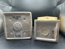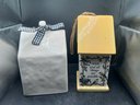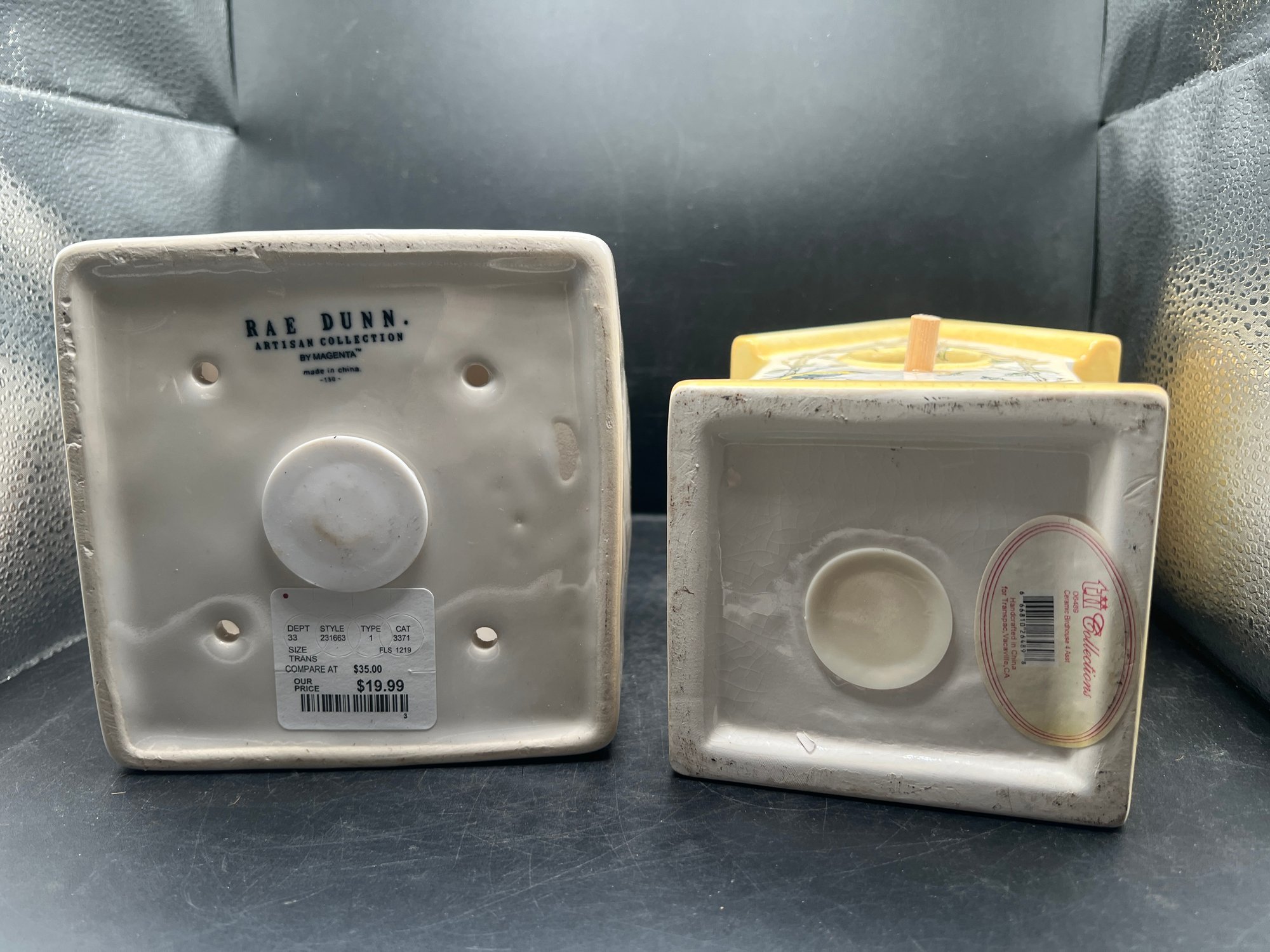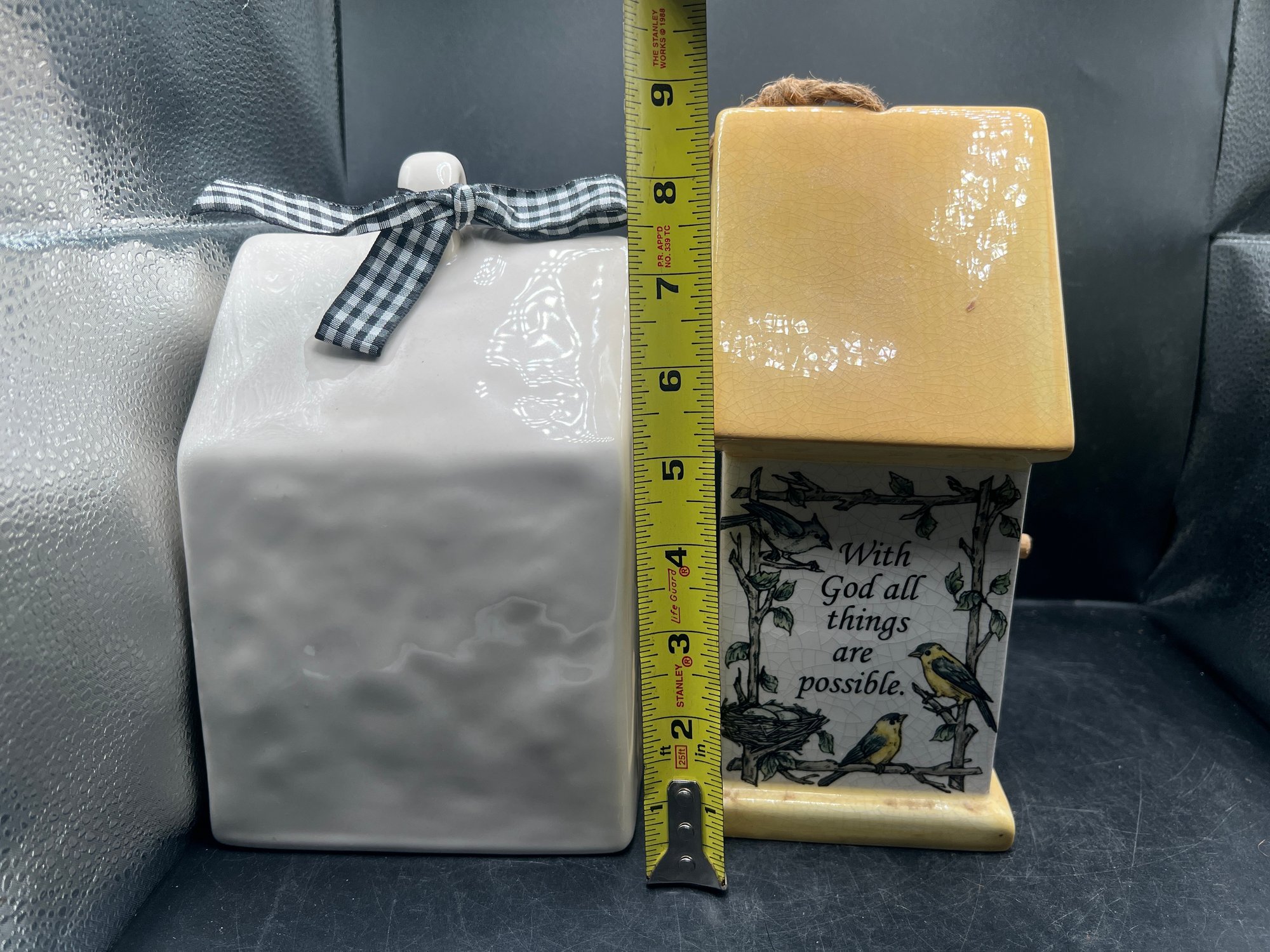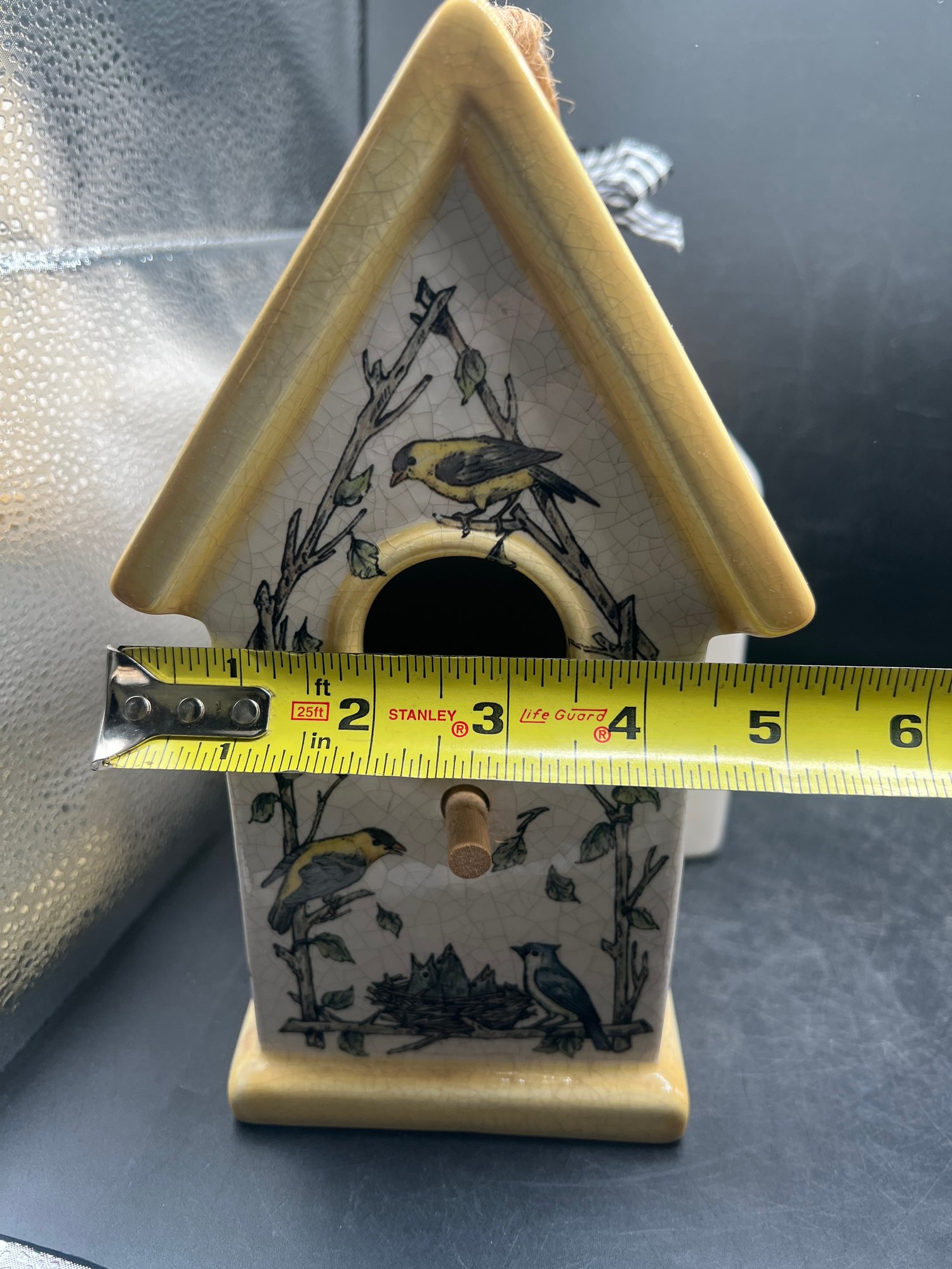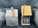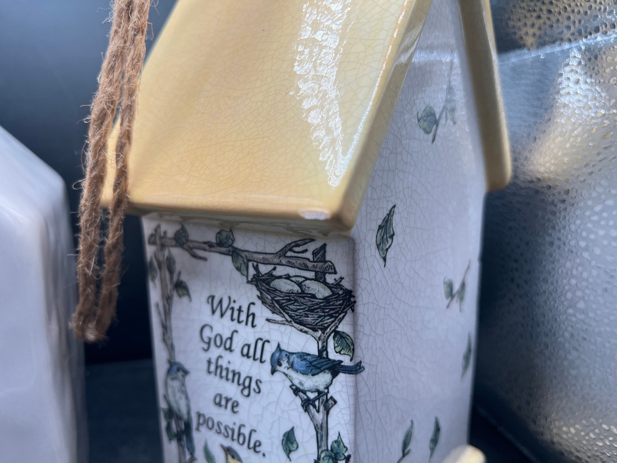 The second piece is a beautifully detailed birdhouse from Grasslands Road, showcasing a vibrant yellow roof and base with a rustic jute hanging rope. The face of the house is adorned with a delicate illustration of birds nesting among leafy branches, adding a touch of nature-inspired warmth to the set. Both pieces are designed for decorative indoor or covered outdoor use and include original rubber stoppers on the bottom. This set is in excellent, like-new condition and would make a wonderful addition to a mantel display, a tiered tray, or a sunroom collection.