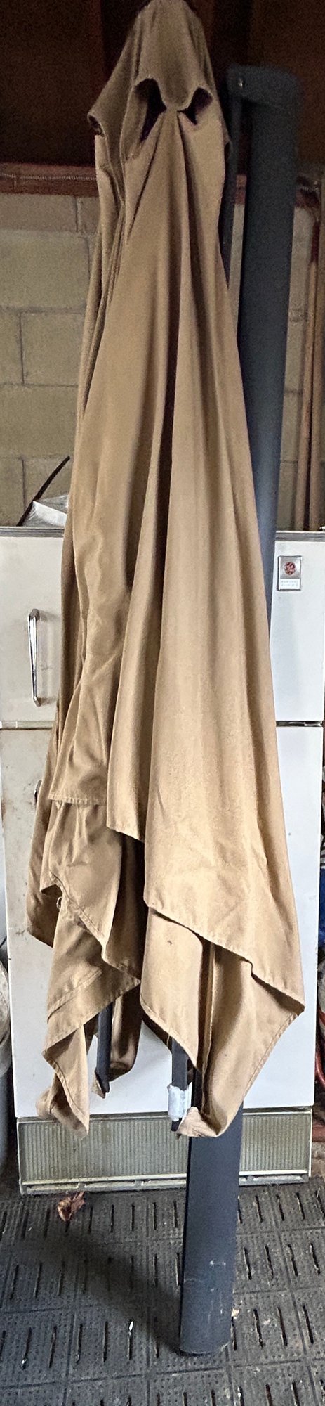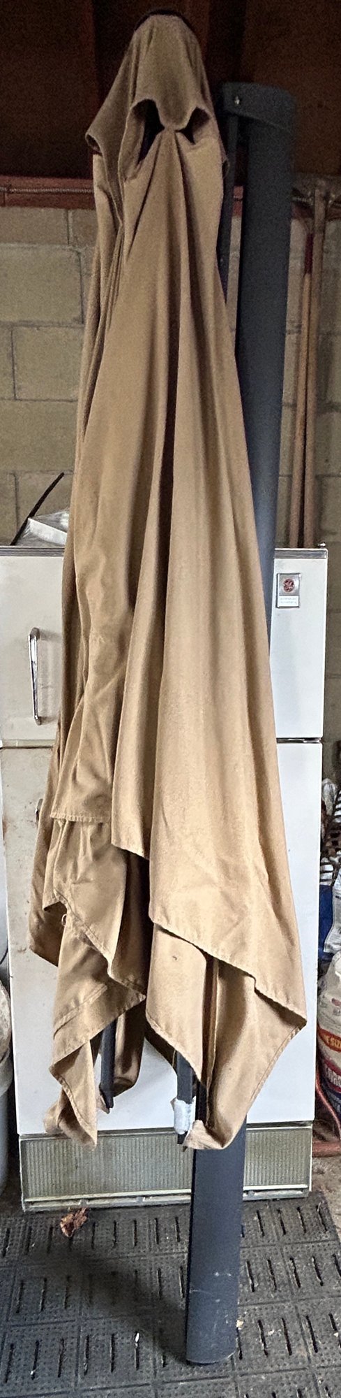 This patio umbrella is a cantilever model designed with a side-mounted pole to provide an unobstructed shaded area.
