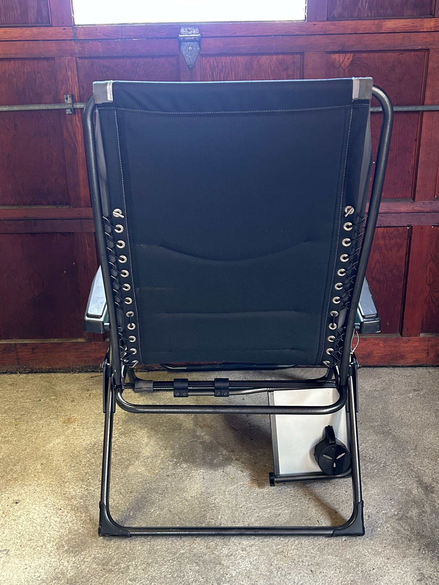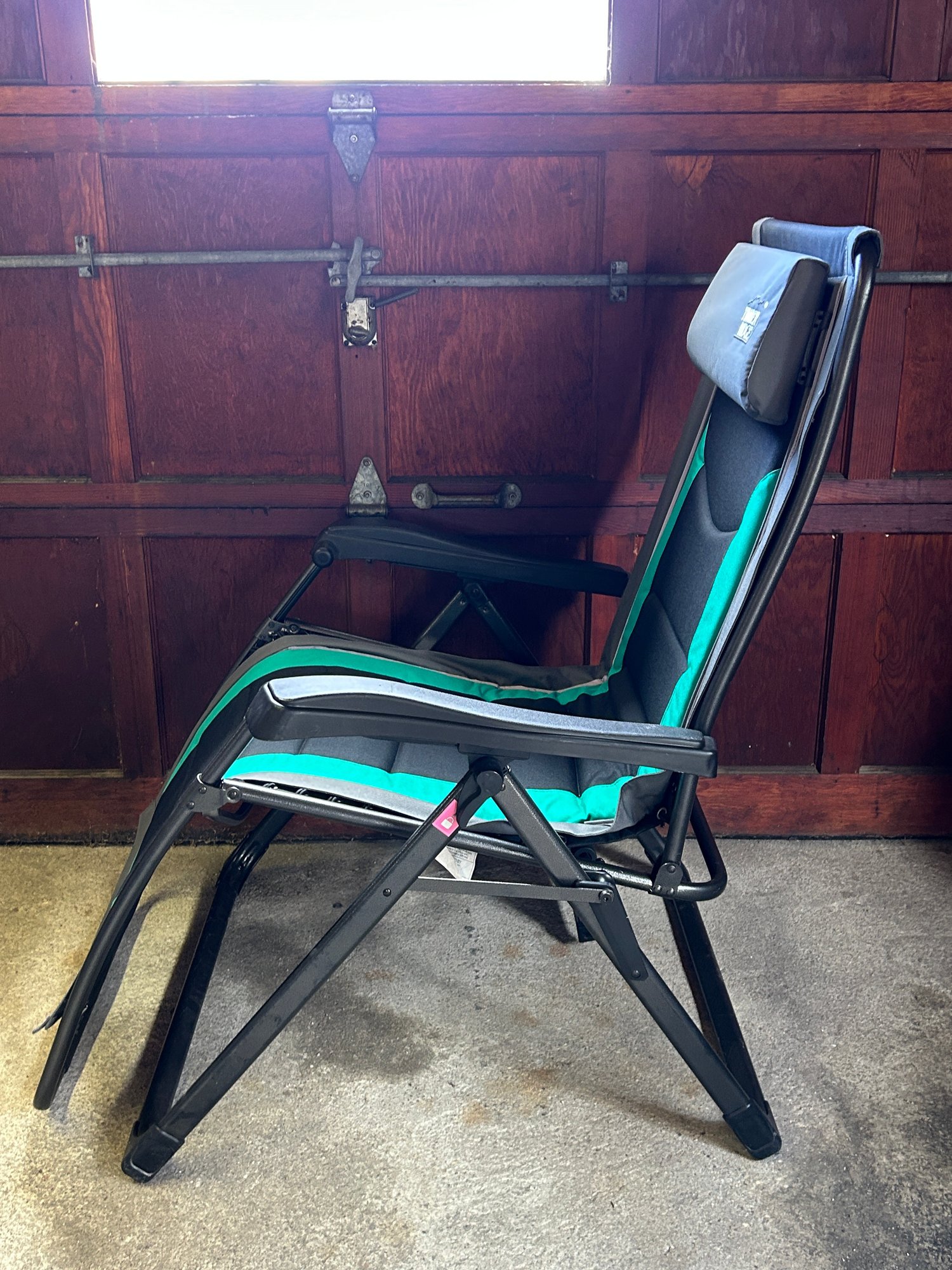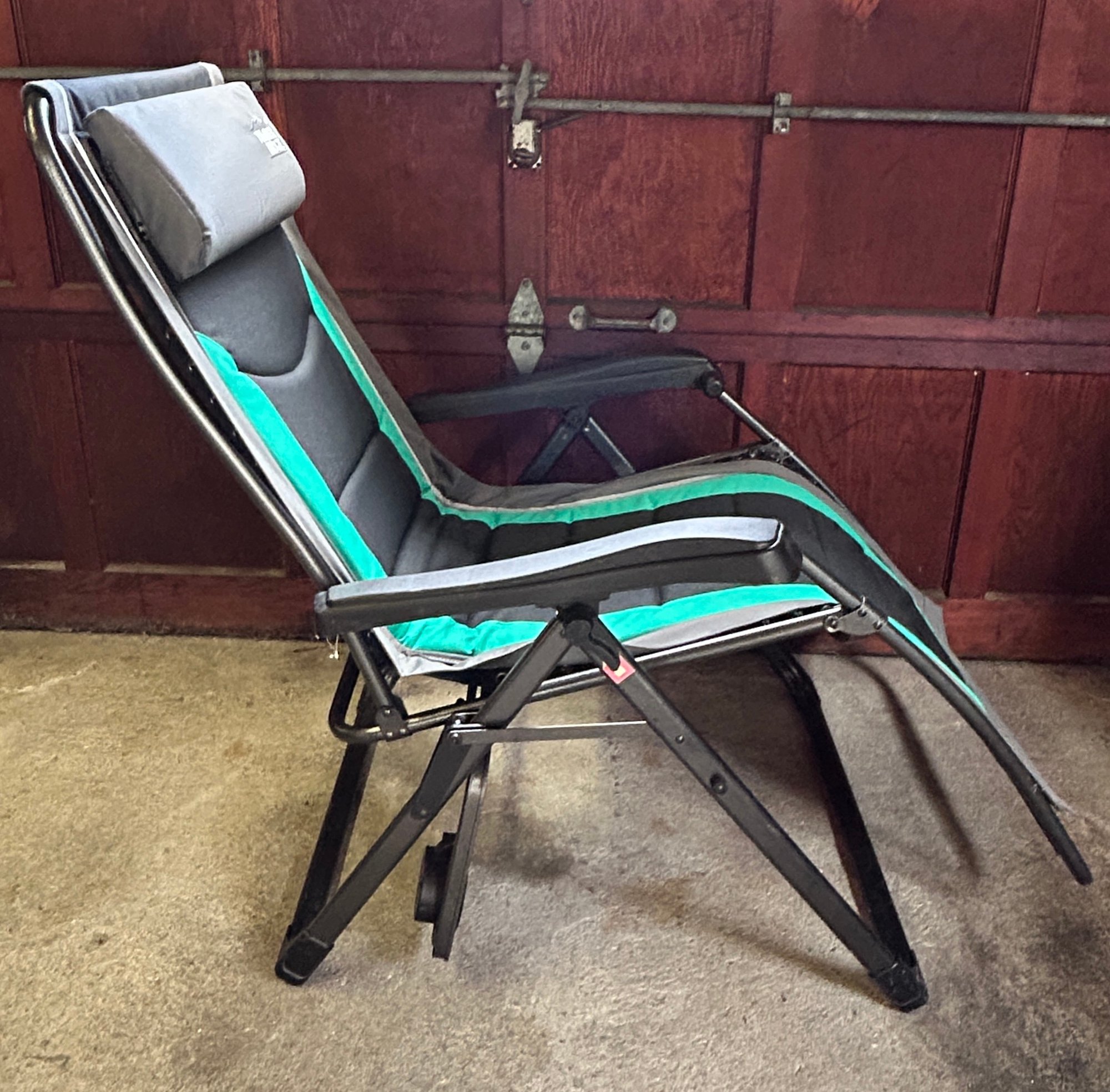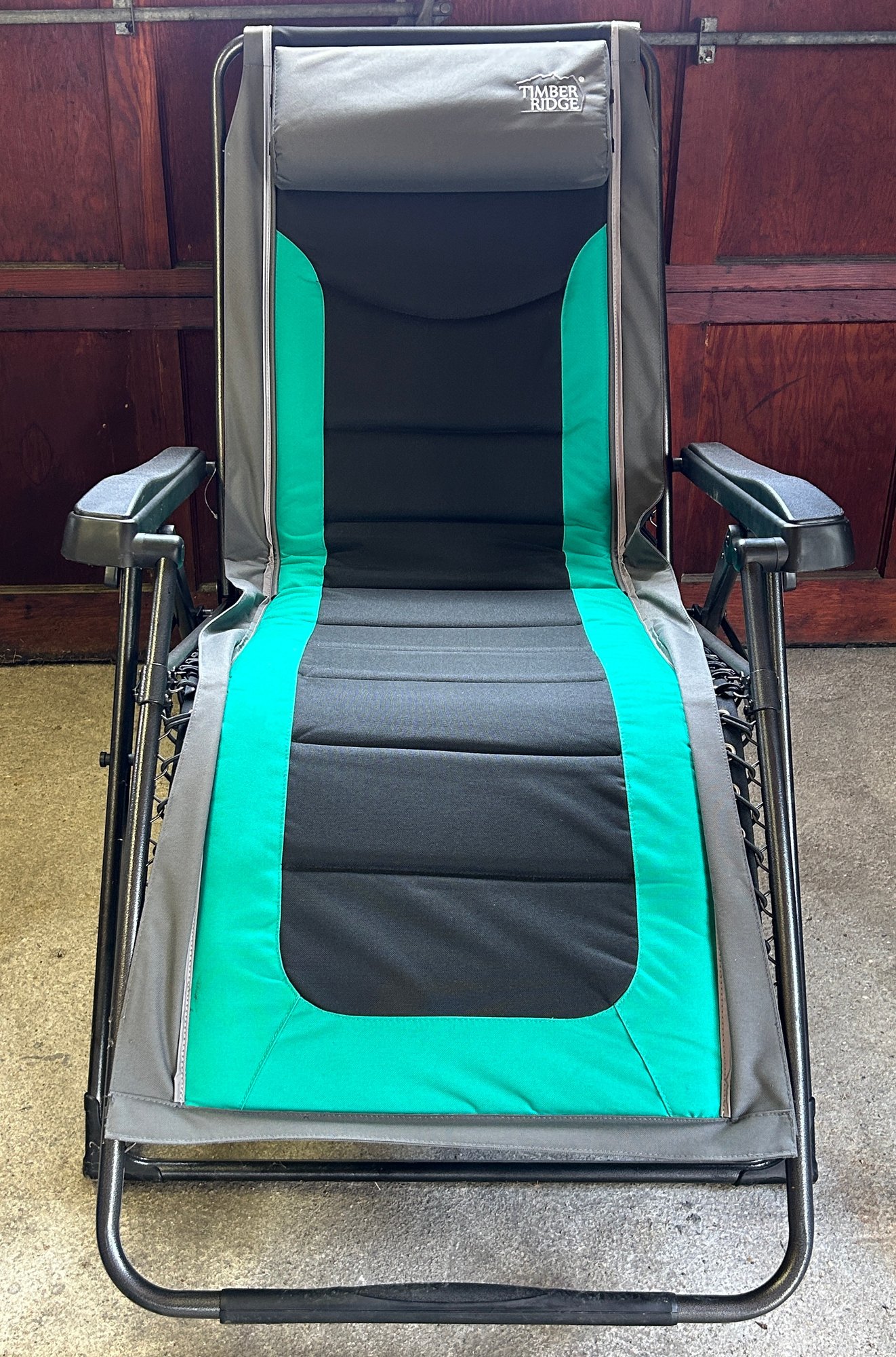 Timber Ridge teal and black zero gravity lounger featuring a padded seat and armrests