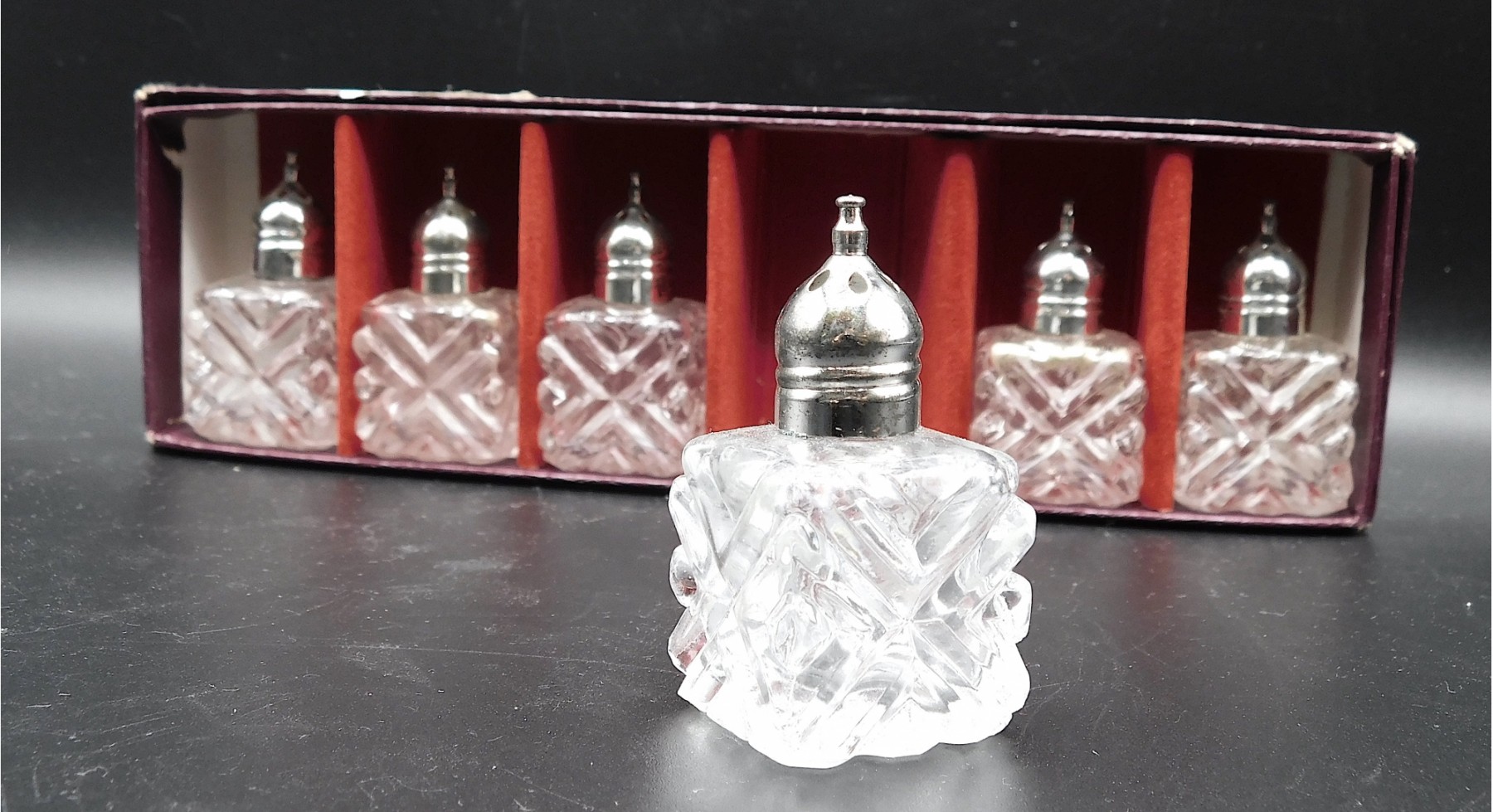 Vintage Goldinger Silver Mini Crystal Salt & Pepper Shakers In Box, Set Of 6