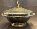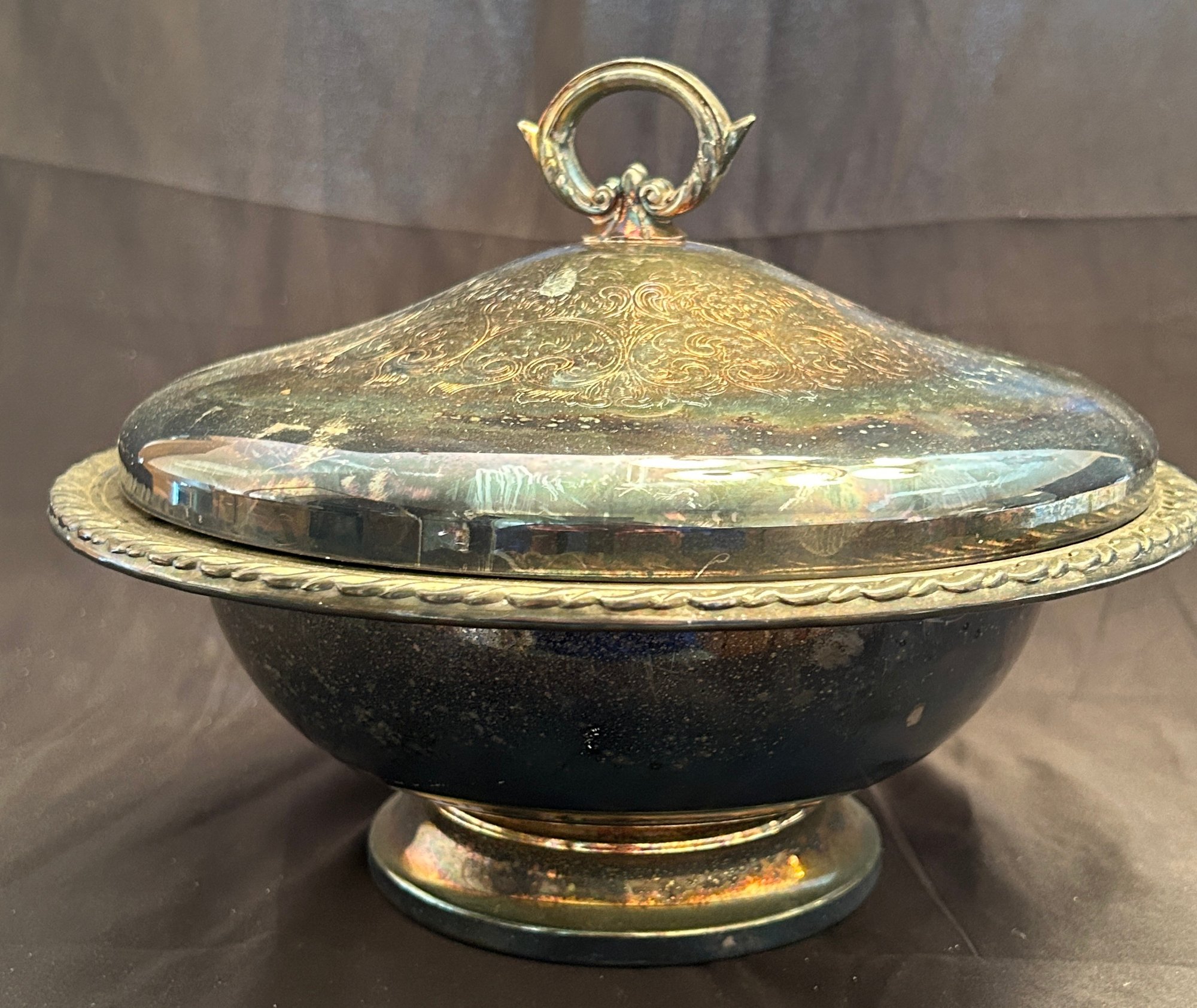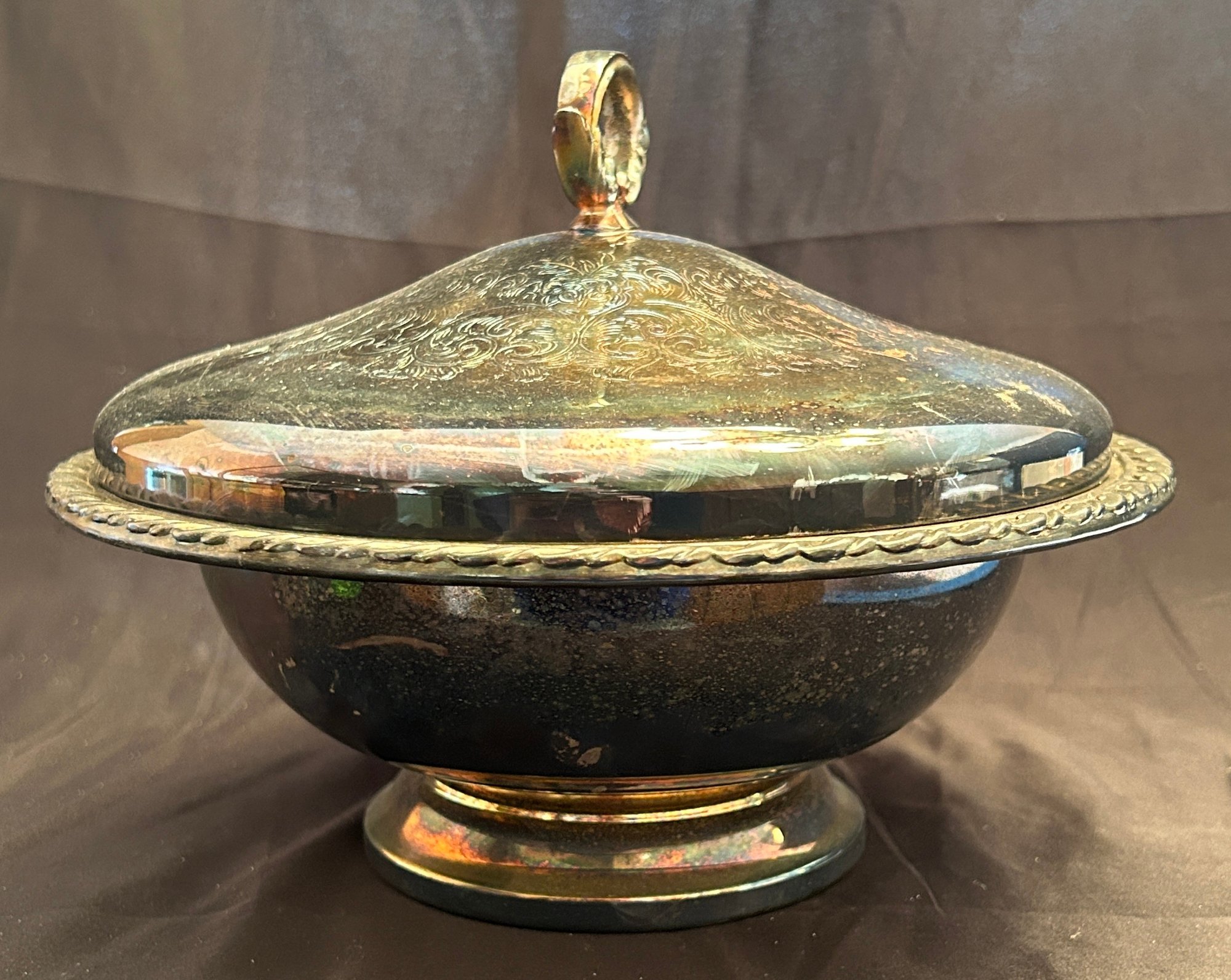 The dish features an an engraved design on the lid, an ornate handle for lifting, and a decorative rope-style edge.