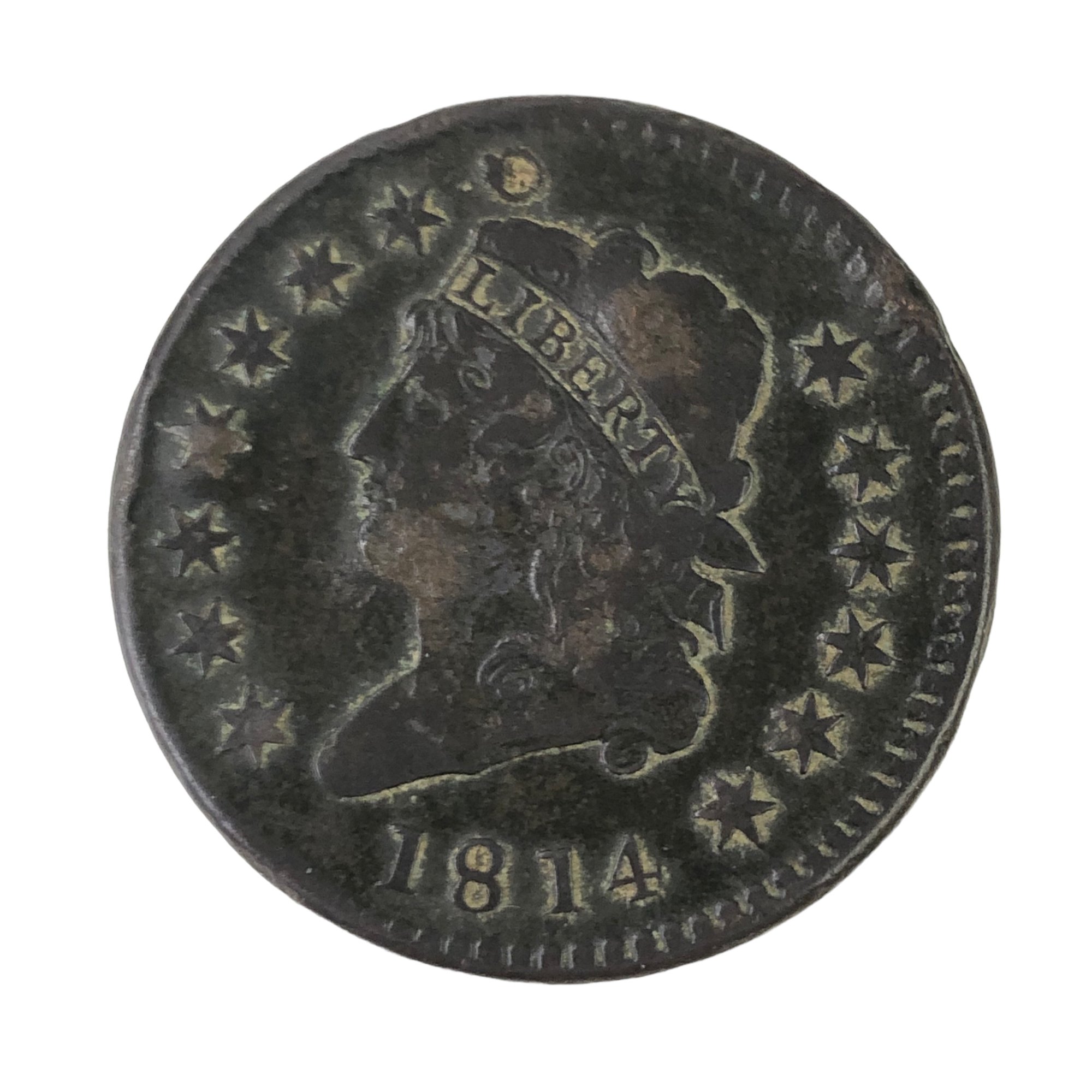 Obverse: classic liberty head facing left with crosslet 4 underneath (see photos #6-7).
