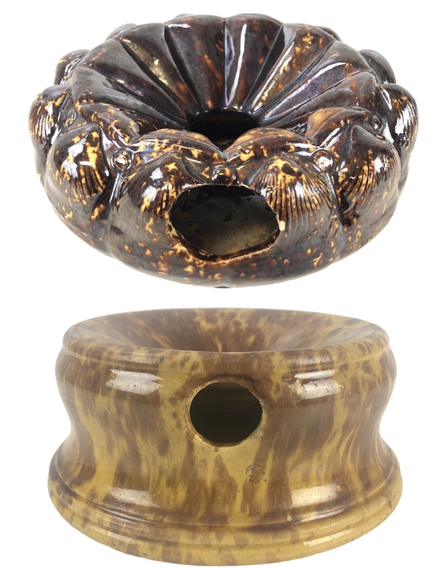 Small chips, and a hairline crack (photo #17) noted on the yellow ware spittoon.