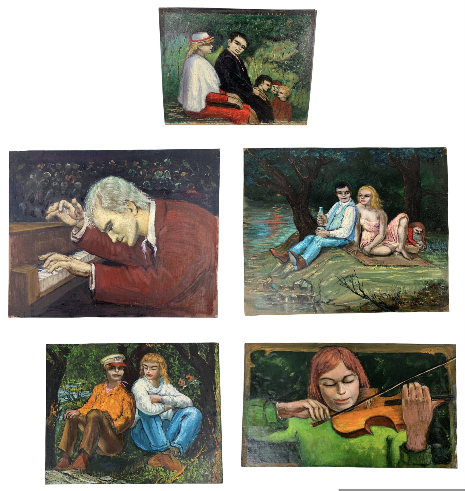 Four of the five paintings are un-stretched canvas, one canvas painting is mounted on board.