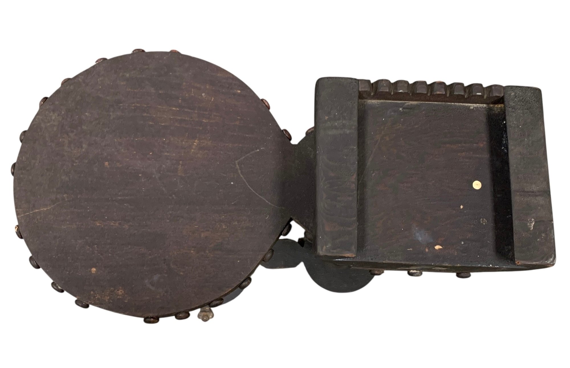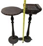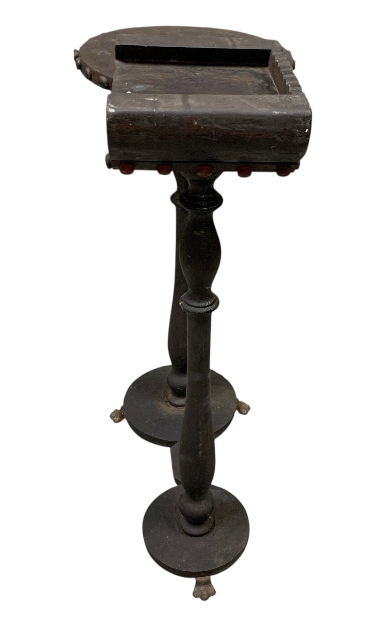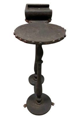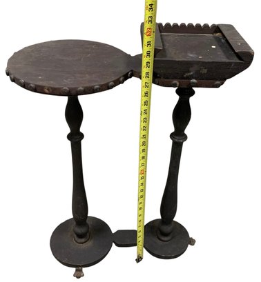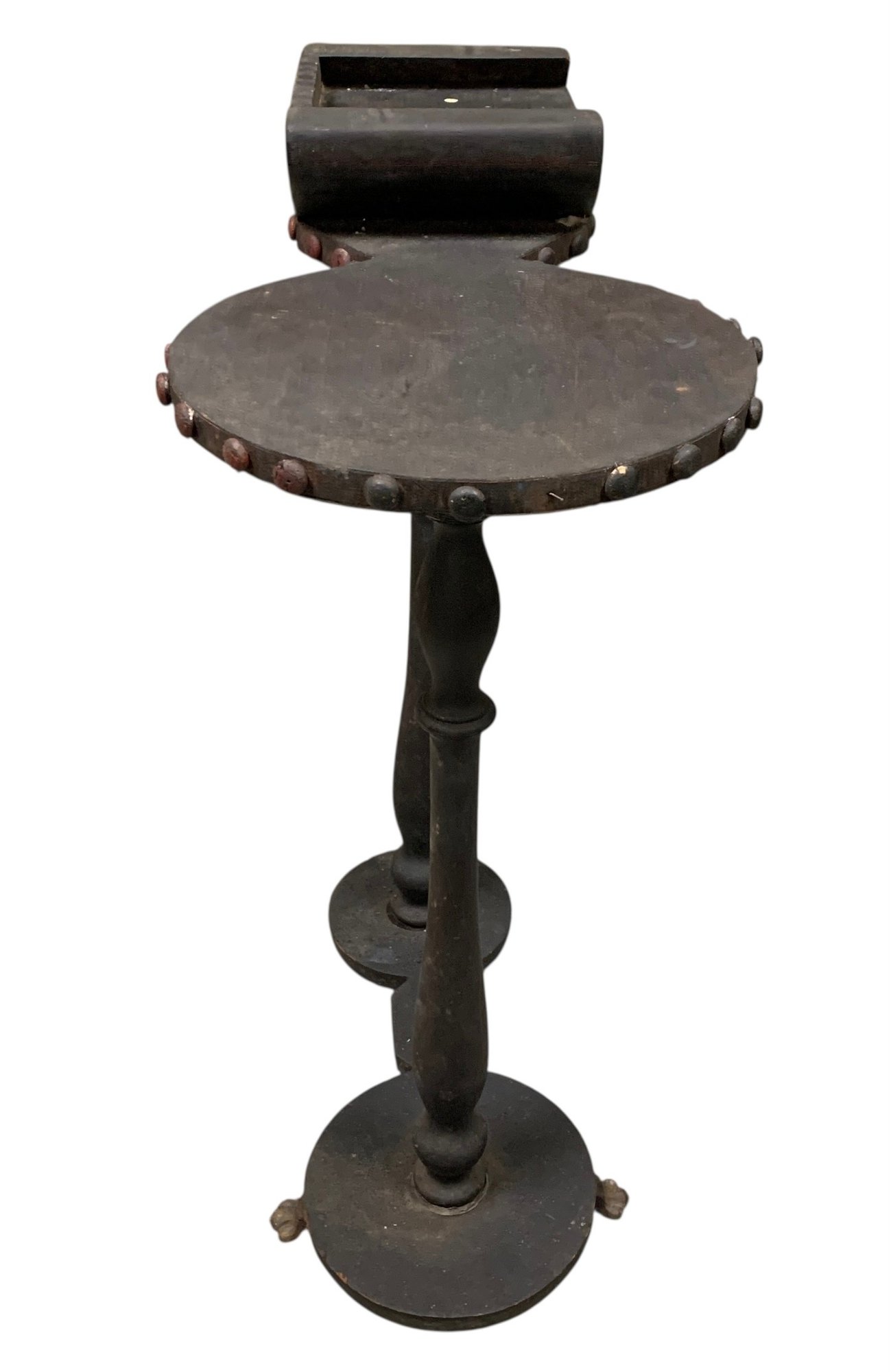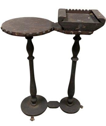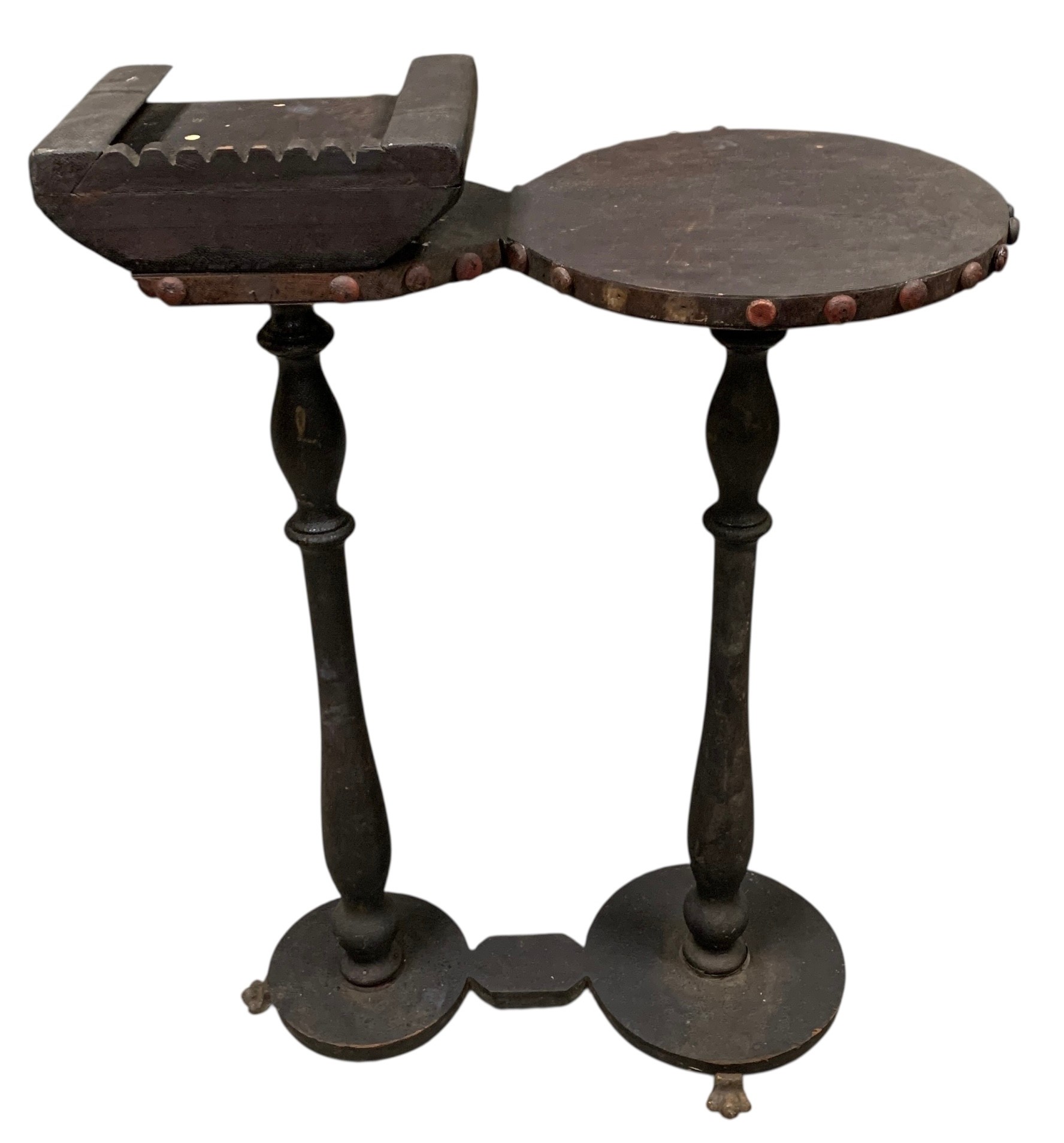 Features brass paw feet and two table tops for holding a drink and an ash tray.