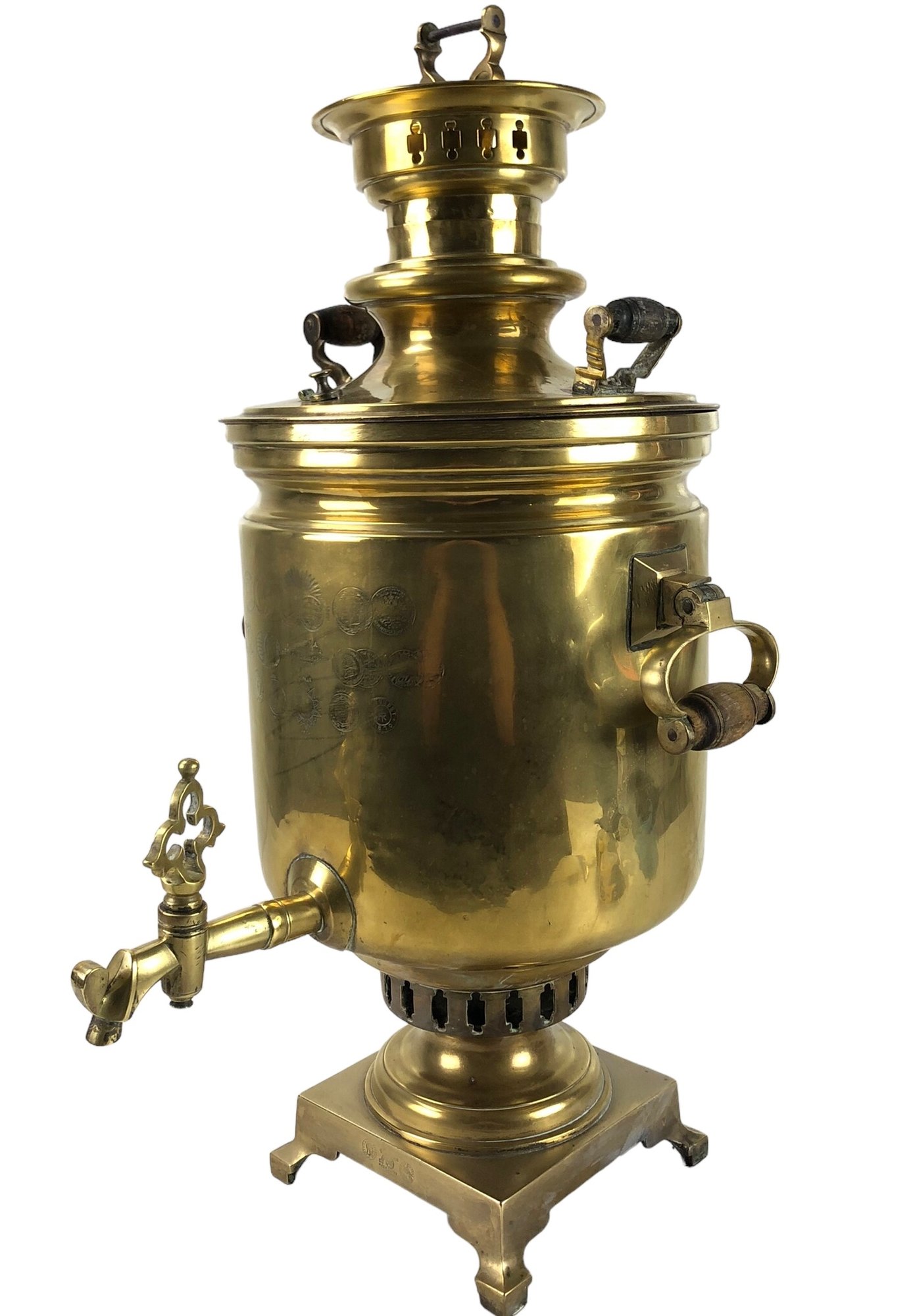 Makers marks, award seals and dates marked on the front and on the top.