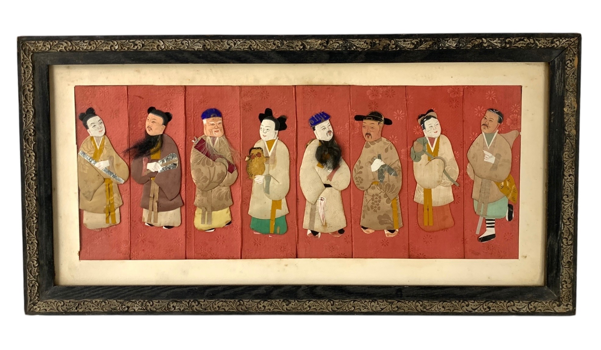 Hand painted faces with silk embroidered clothing.
