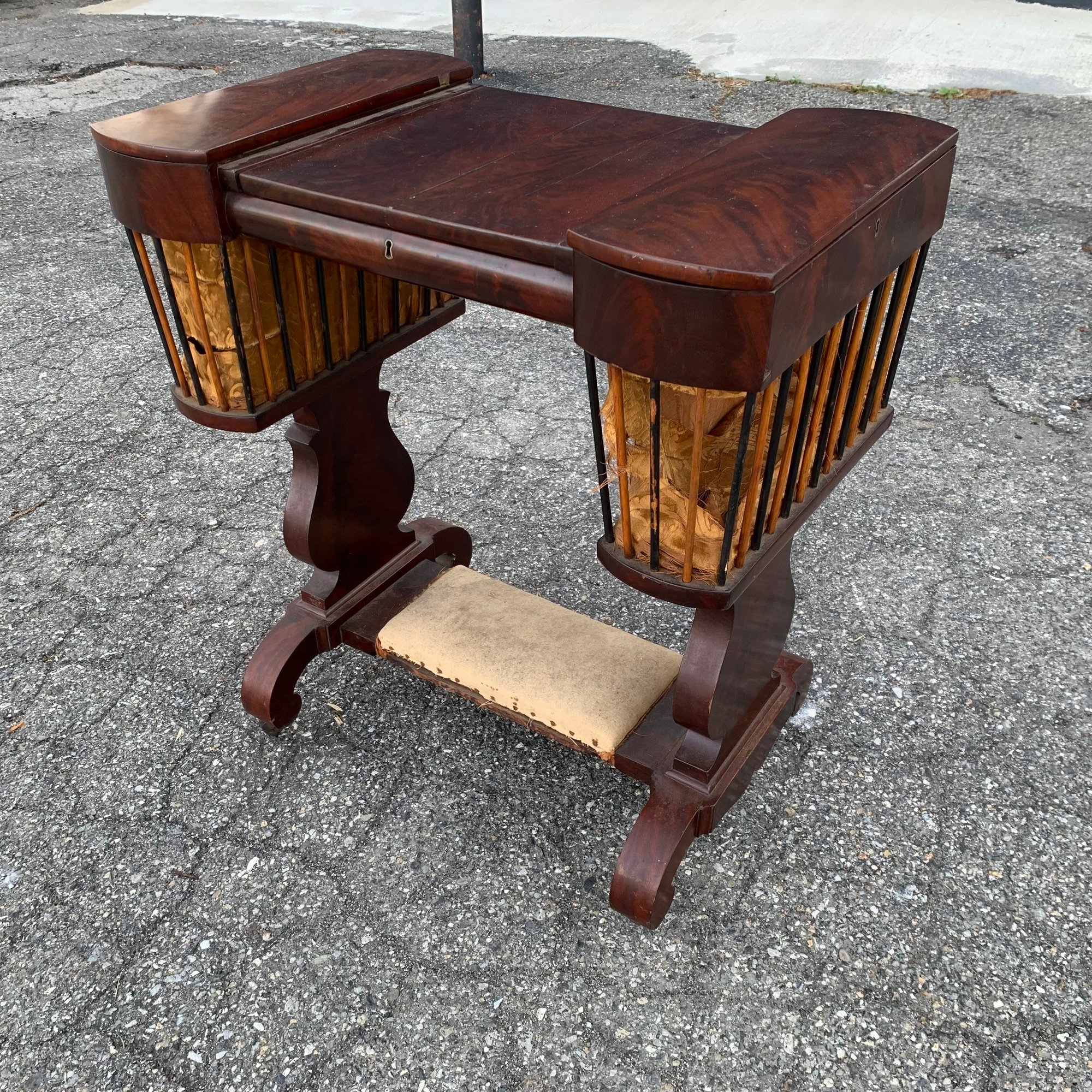 Beautiful 19th century table with lidded side compartments, lift top writing compartment, scroll base and casters.