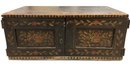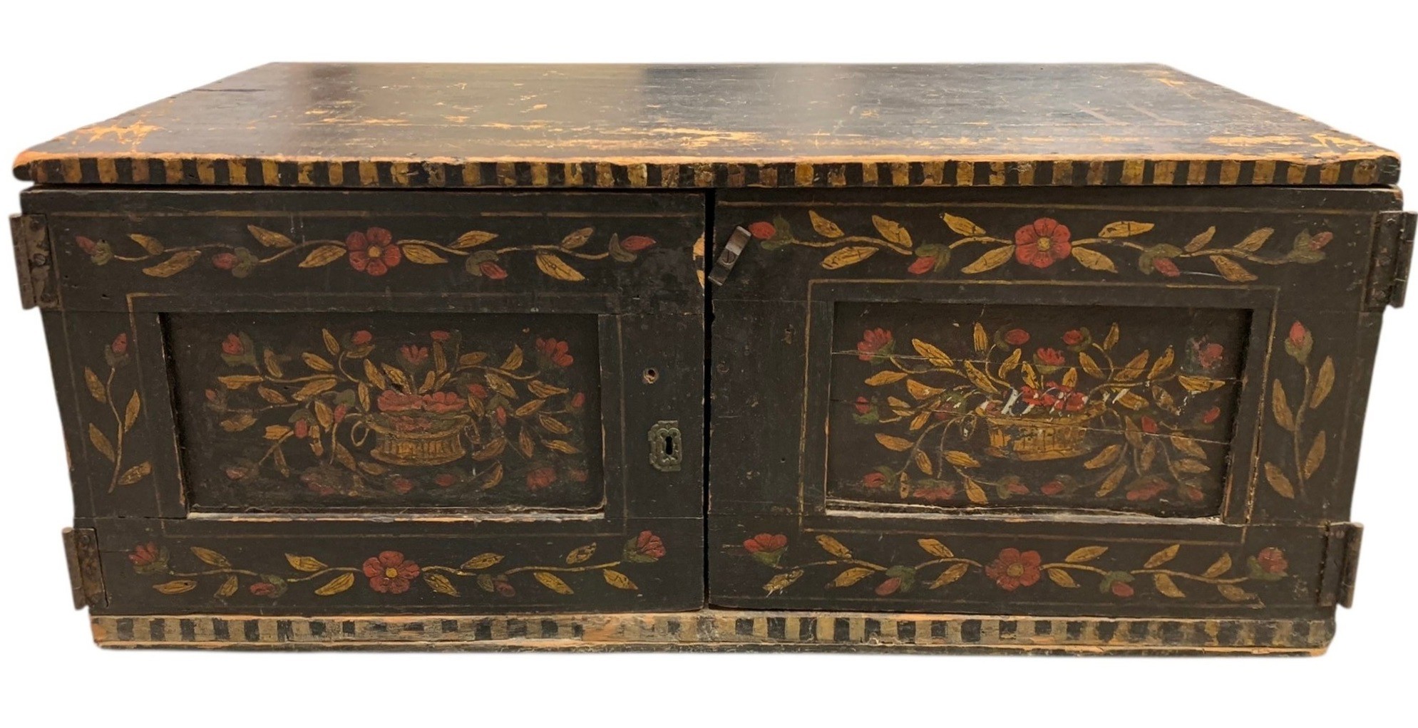Features two front doors hand painted with baskets of flowers, flower vines and a checkered pattern.