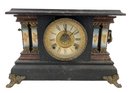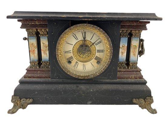 Features a wood case and porcelain columns hand painted with cherubs.