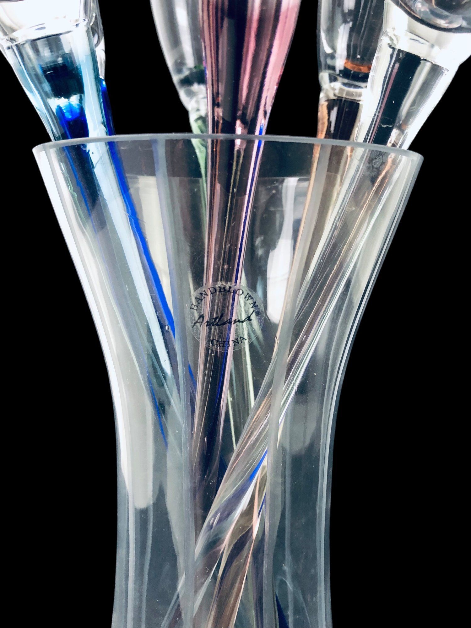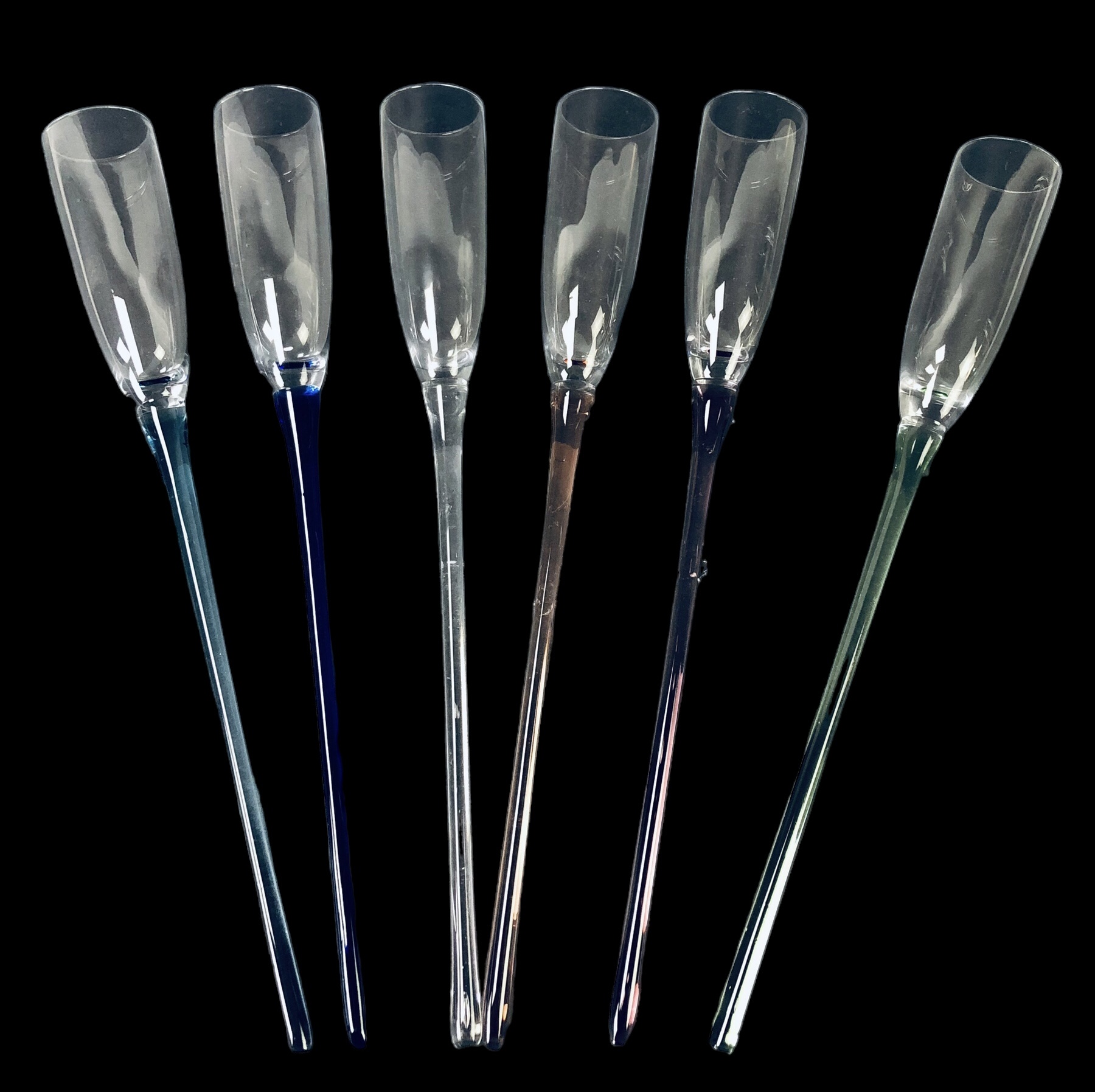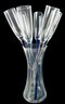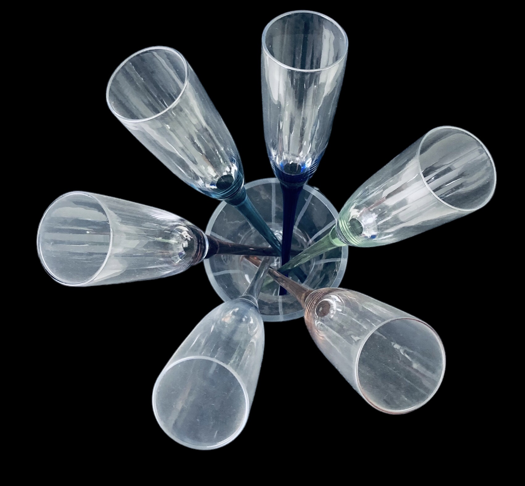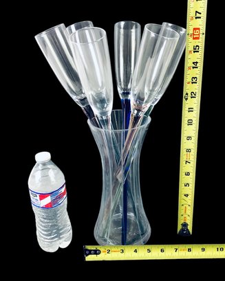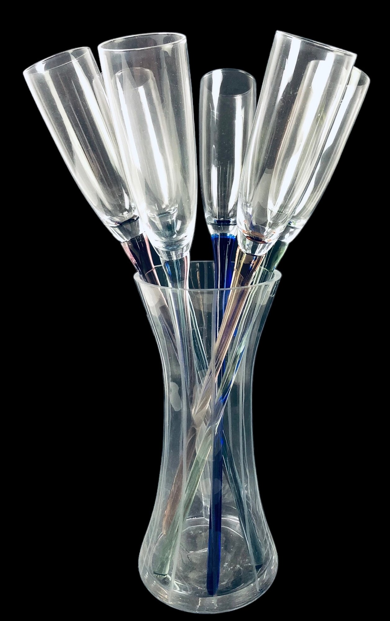 Includes (6) six champagne flutes with colored stems and (1) one vase.