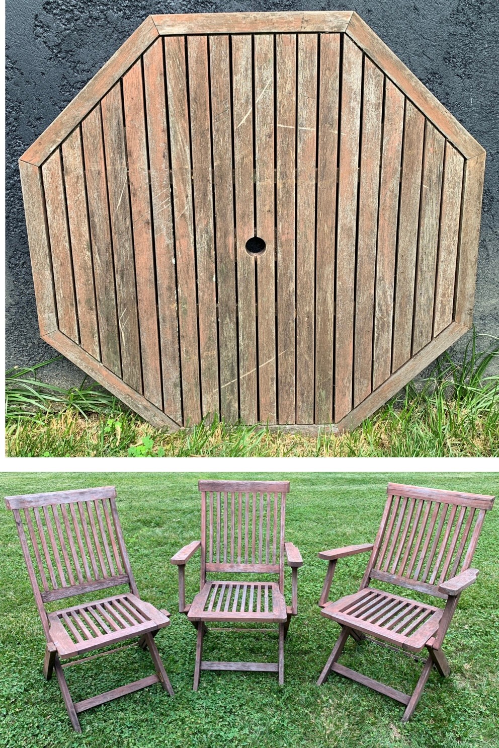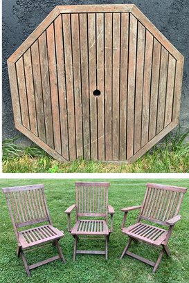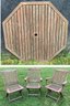 Set includes (1) octagon shaped table with base and (3) folding chairs.