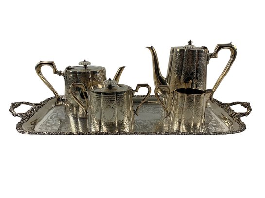 The 4-piece coffee service set is stamped with the Barker Brothers hallmark (3 stars in a 3-leaf clover), which was used before it merged to become Barker-Ellis.