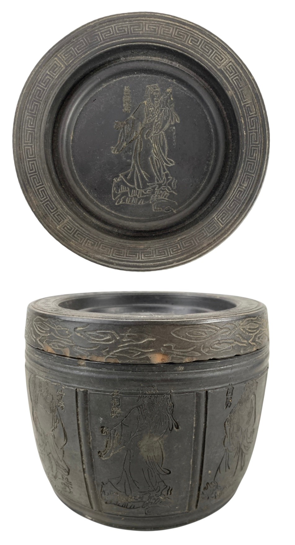 Stamped on the bottom and on the underside of the lid.